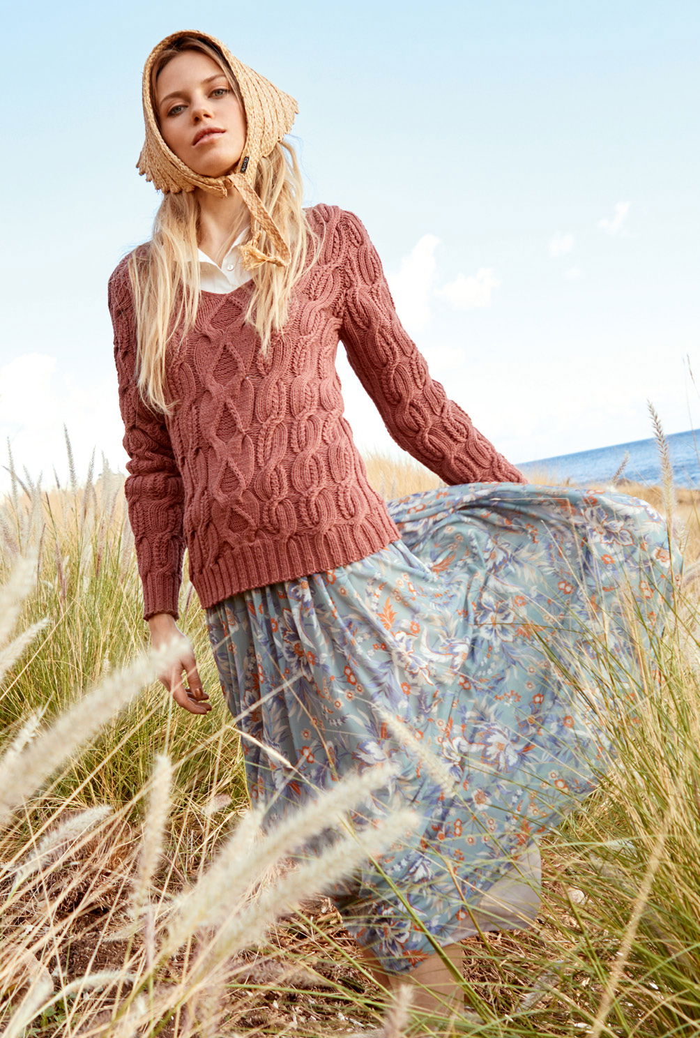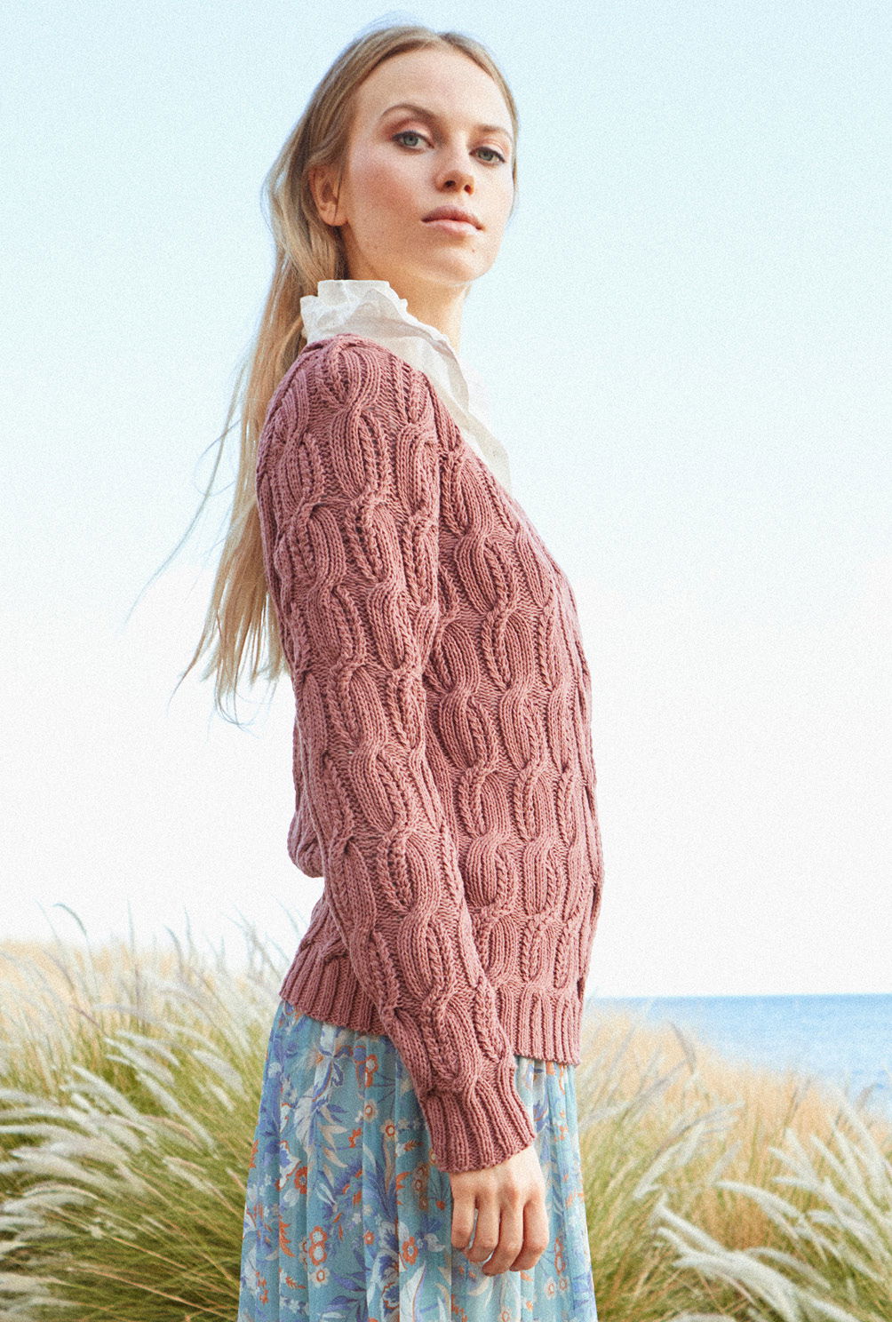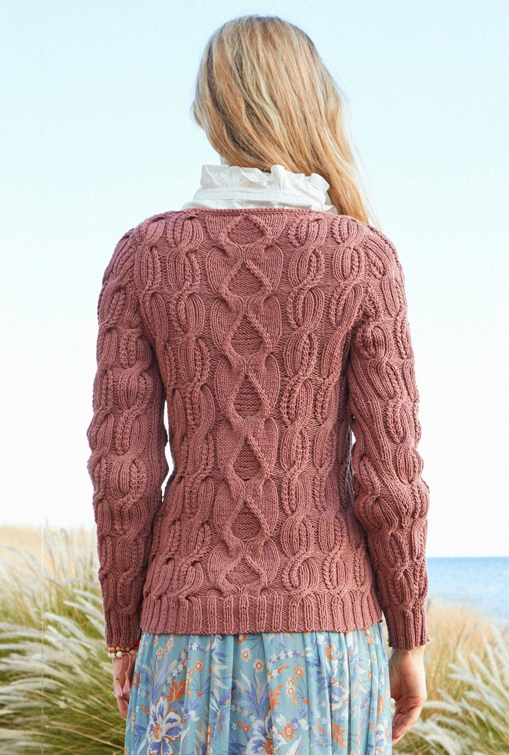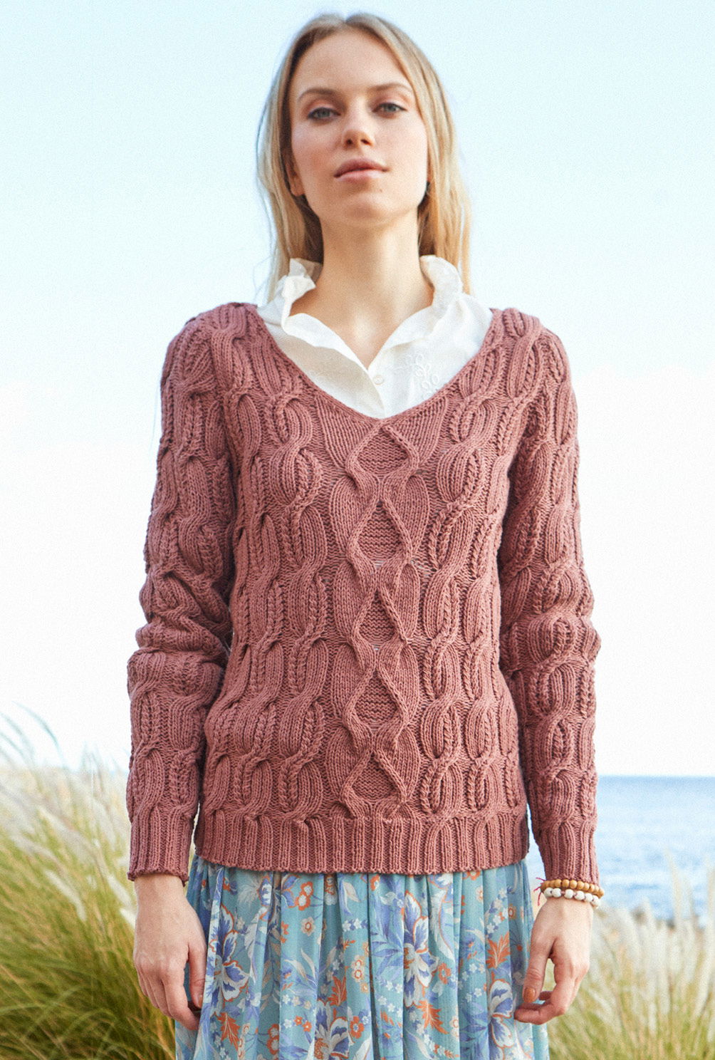 Sehr edel! Kupferbraune Bio-Baumwolle bildet die Grundlage für diesen klassisch geschnittenen V-Ausschnittpulli, bei dem plakative Zopfstreifen alle Blicke auf sich ziehen. Gestrickt wird der Pullover in Einzelteilen und von unten nach oben. Begonnen wird jeweils mit dem Rippenbündchen, dann folgt auch schon die Einteilung für die Zopfmuster. Hierbei können besonders anfangs Maschenmarkierer hilfreich sein, um die einzelnen Musterabschnitte zu kennzeichnen. Beide Zopfmuster benötigen schon ein wenig Aufmerksamkeit, wobei die übersichtlichen Strickschriften dabei helfen, jede Verkreuzung genau im Blick zu haben. Sind alle teile fertig gestrickt, werden noch die Nähte geschlossen und der rückwärtige Halsausschnitt mit einer Reihe fester Maschen umhäkelt.