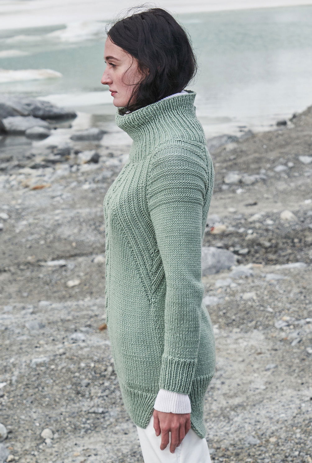Ein toller Hingucker! Die Raglanschrägungen passen sich den Rippenstrukturen perfekt an, bei den Ärmeln kommen im oberen Bereich Querrippen ins Maschenspiel, dazu ist der Pulli hinten noch etwas länger, als vorn– ein toller Effekt! Warm und kuschelig ist der Winterpulli aus einem Schurwoll- Alpakagemisch und mit dem hohem Kragen natürlich sowieso. Gestrickt wird der Raglan ganz klassisch in vier Teilen: Erst das Rückenteil, gefolgt von dem Vorderteil und zum Schluss die Ärmel. Für den mittigen Zopfstreifen gibt es eine übersichtliche Strickschrift und auch die Platzierung der Rippen wird in der Anleitung ausführlich beschrieben – so hat man stets den Überblick und kann sich ganz dem Strickspaß hingeben. Sind alle Teile fertig gestrickt, werden die Raglannähte geschlossen und der hohe Kragen gearbeitet. Im Anschluss dann alle Nähte schließen – hierbei muss darauf geachtet werden, dass das Rückenteil länger ist, als das Vorderteil.