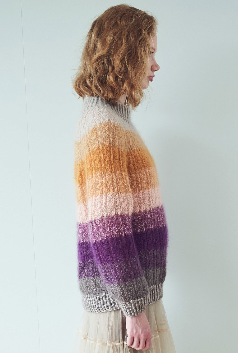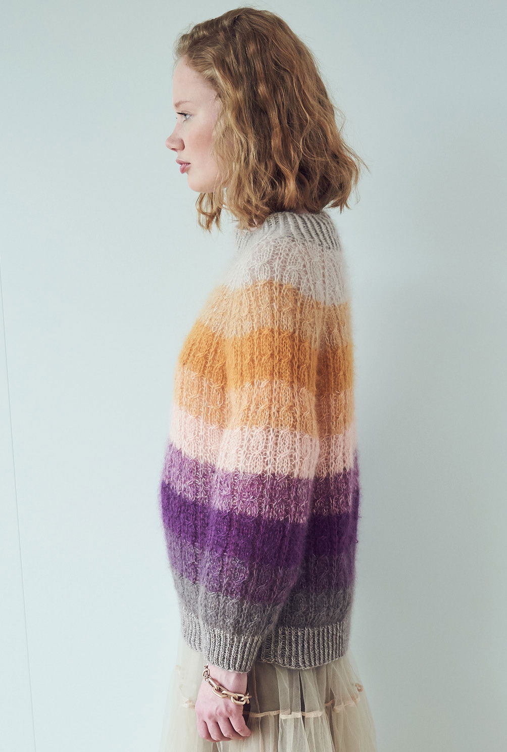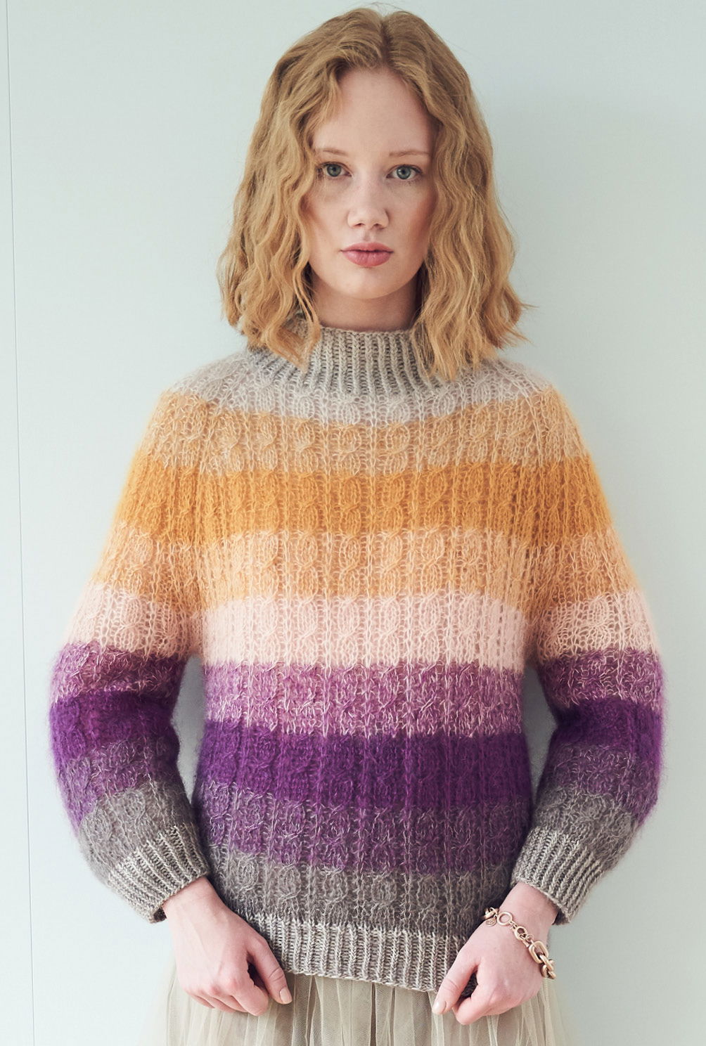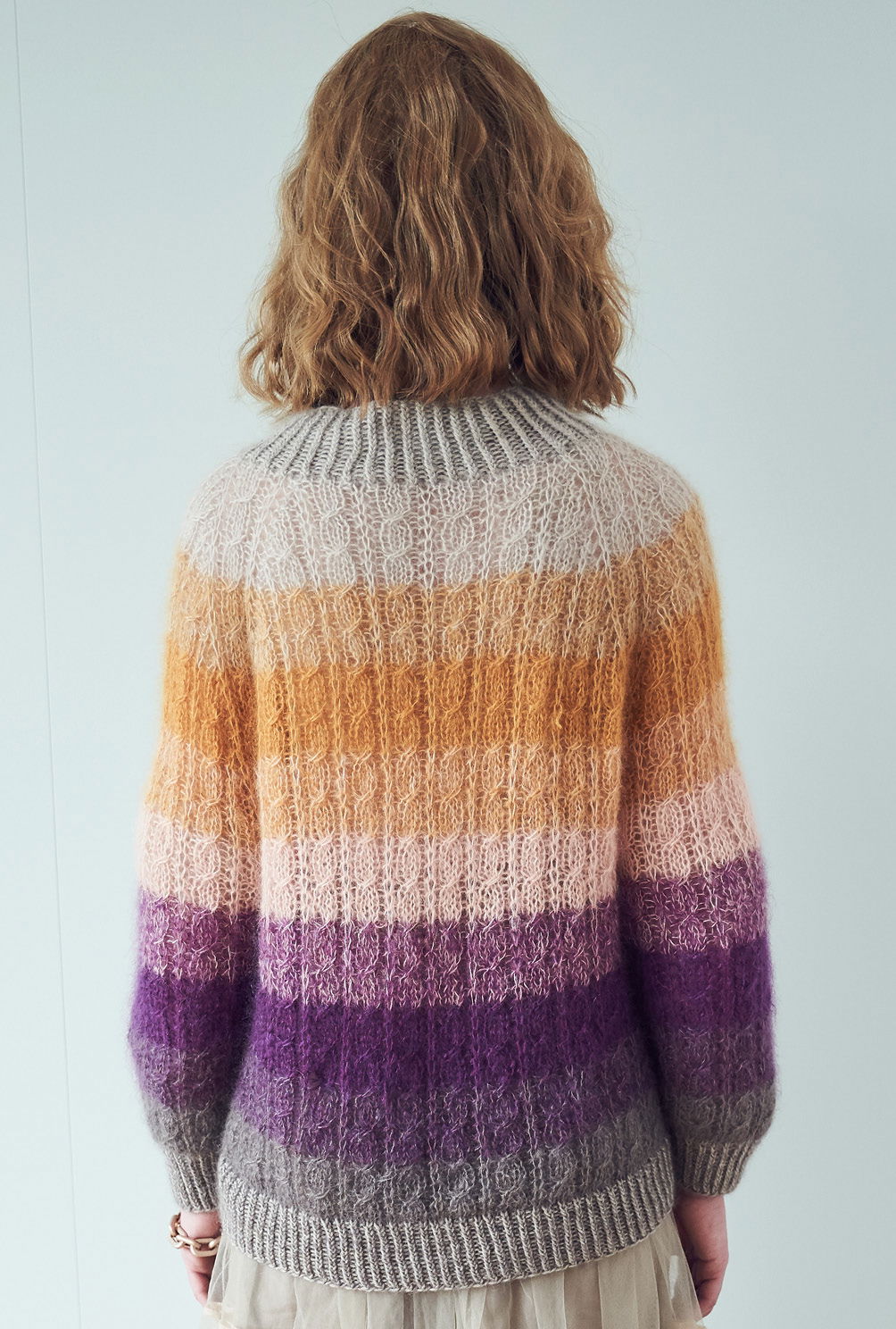 Der gestreifte Farbverlauf von Brombeer und Aubergine über Curry bis hin zu Beige gibt dem doppelfädig gestrickten Zopfmusterpulli mit Raglanpasse die spannende Optik. Für die Streifen wird immer mal wieder einer der beiden Fäden gegen eine andere Farbe ausgetauscht – so entsteht ein ganz besonders harmonischer Melange-Effekt innerhalb der Streifen. Bis zur Passenhöhe werden alle Teile einzeln und von unten nach oben im Zopfmuster gestrickt – – dieses ist nicht sonderlich kompliziert und die übersichtliche Strickschrift hilft zusätzlich dabei, stets den Überblick zu behalten. Für die Passe kommen dann alle Teile gemeinsam auf die Nadel und weiter geht es jetzt immer im Kreis. Zum Schluss bekommt der Halsausschnitt noch die Rippenblende angestrickt und alle Nähte werden geschlossen.