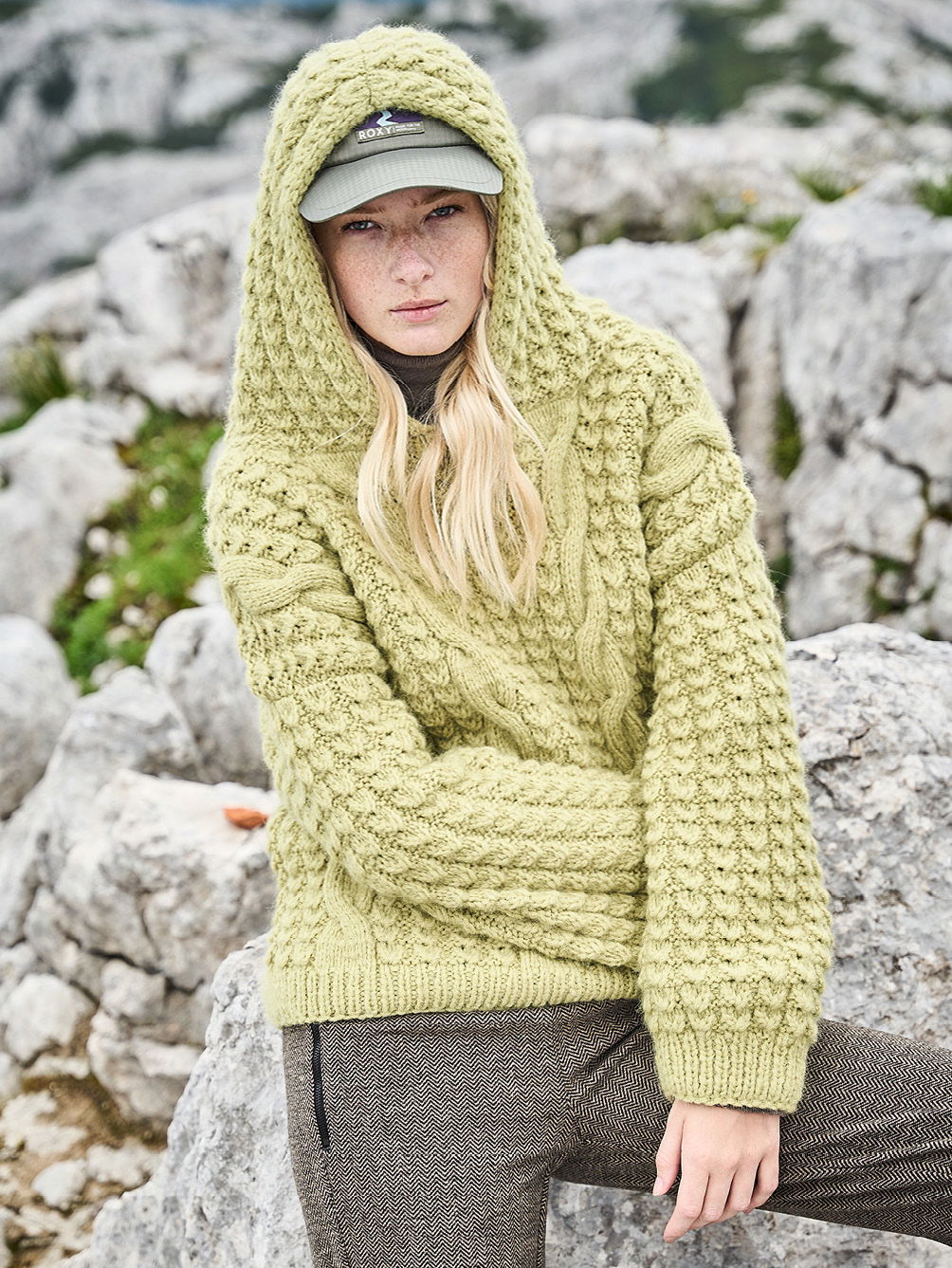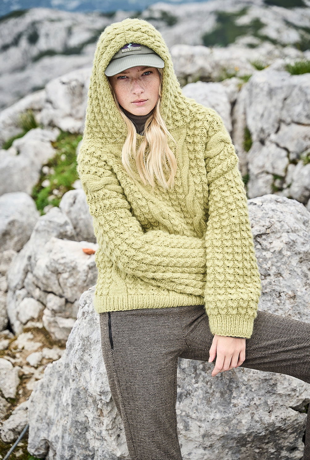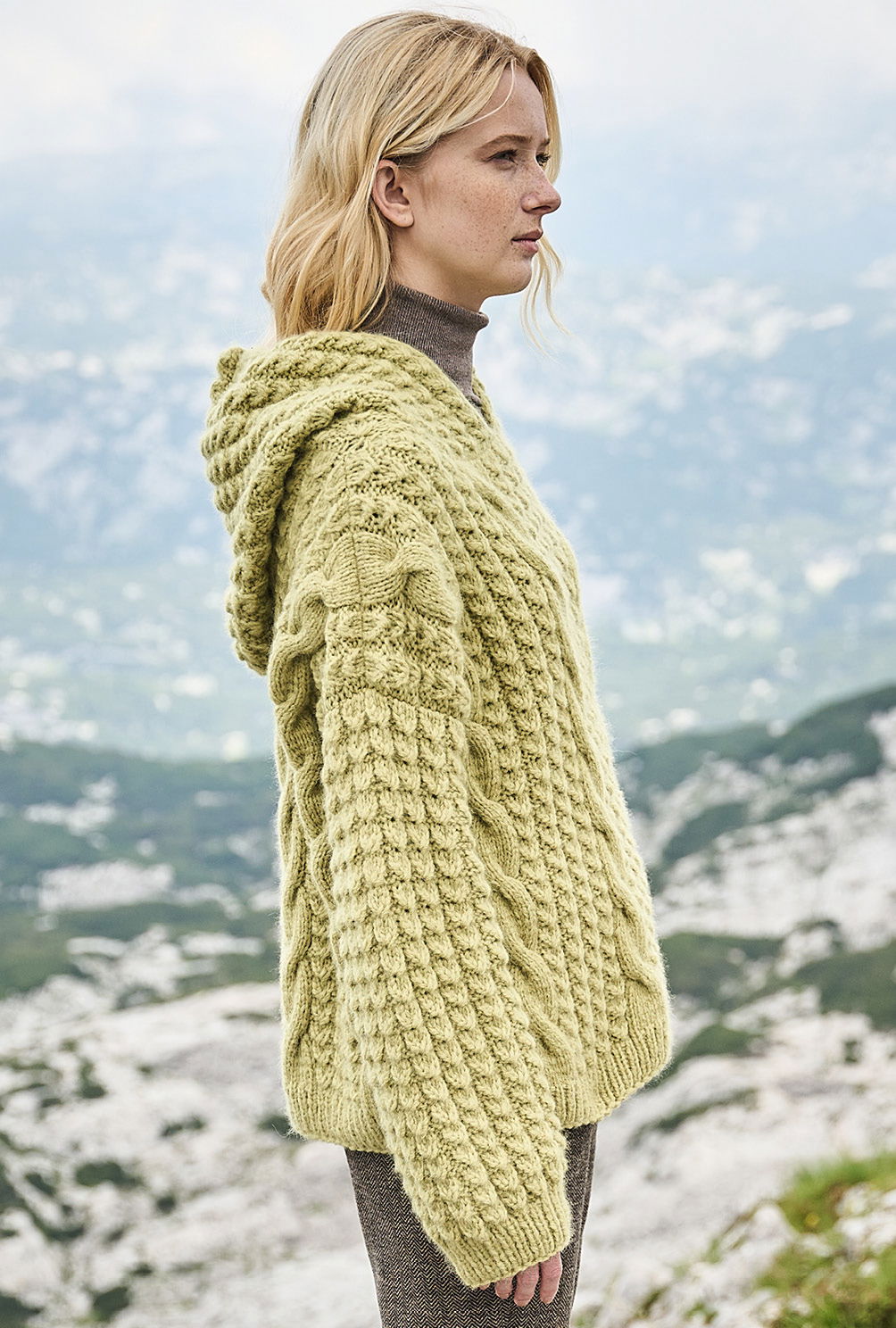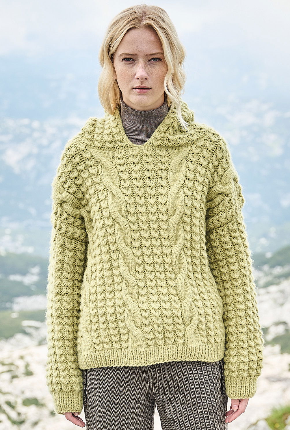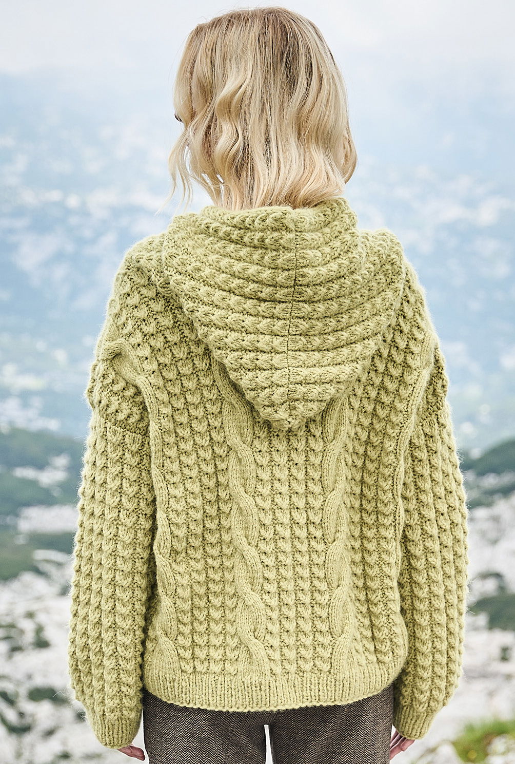 Material: 700 (700) 800 g Bayleaf (Fb 107) "Phullu" (42% Alpaka, 42% Schurwolle, 16% Polyamid, LL = 250 m/100 g) von MIRASOL. 1 Paar Stricknadel Nr 6 und 1 Rundstricknadel Nr 6.
