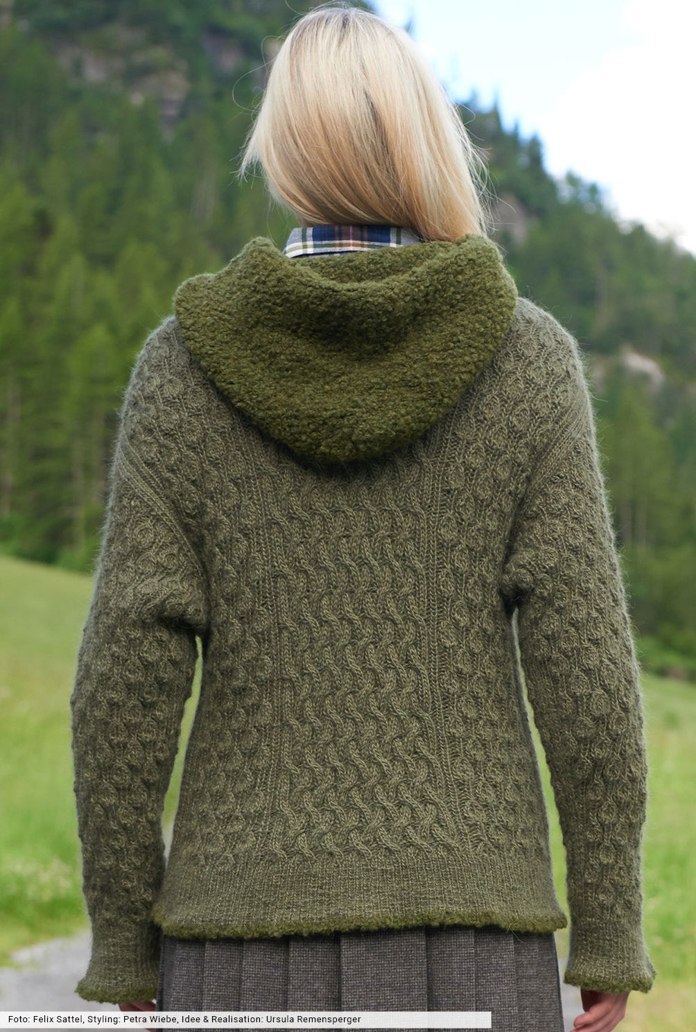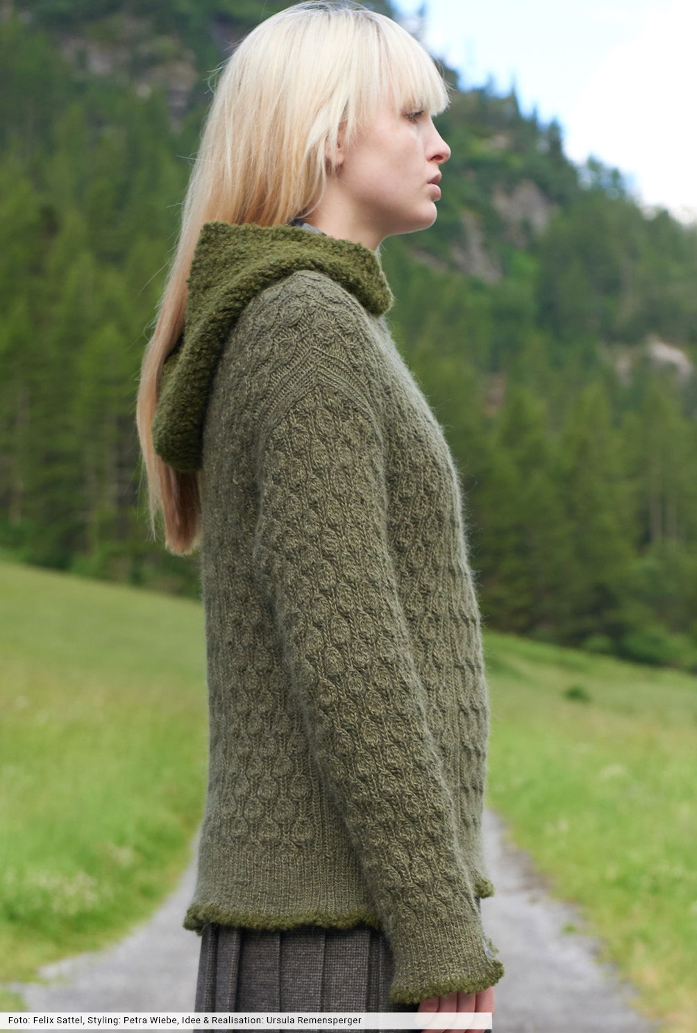Bei diesem sportlichen Hoody kommt das glatte Alpakagarn in Olivgrün für den Korpus mit tollen Zopf- und Blattstrukturen zum Einsatz. Die farblich abgestimmten Bouclé-Effekte hingegen setzen sich bei der Kapuze und als schmale Abschlusskanten für die Bündchen in Szene. Wir finden, eine tolle Kombination, die Individualität mit Tragbarkeit verbindet und dich länger als eine Saison begeistern wird.