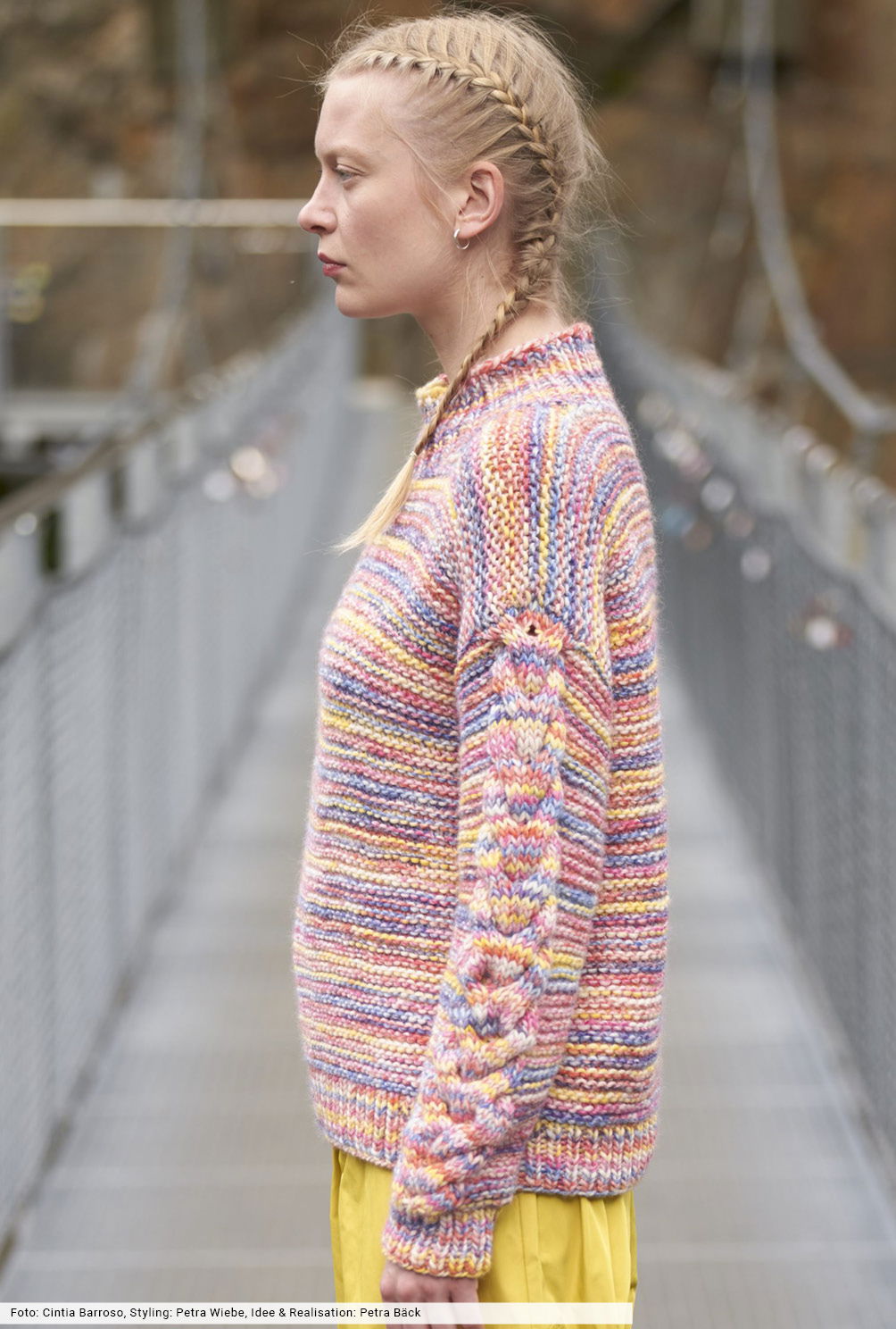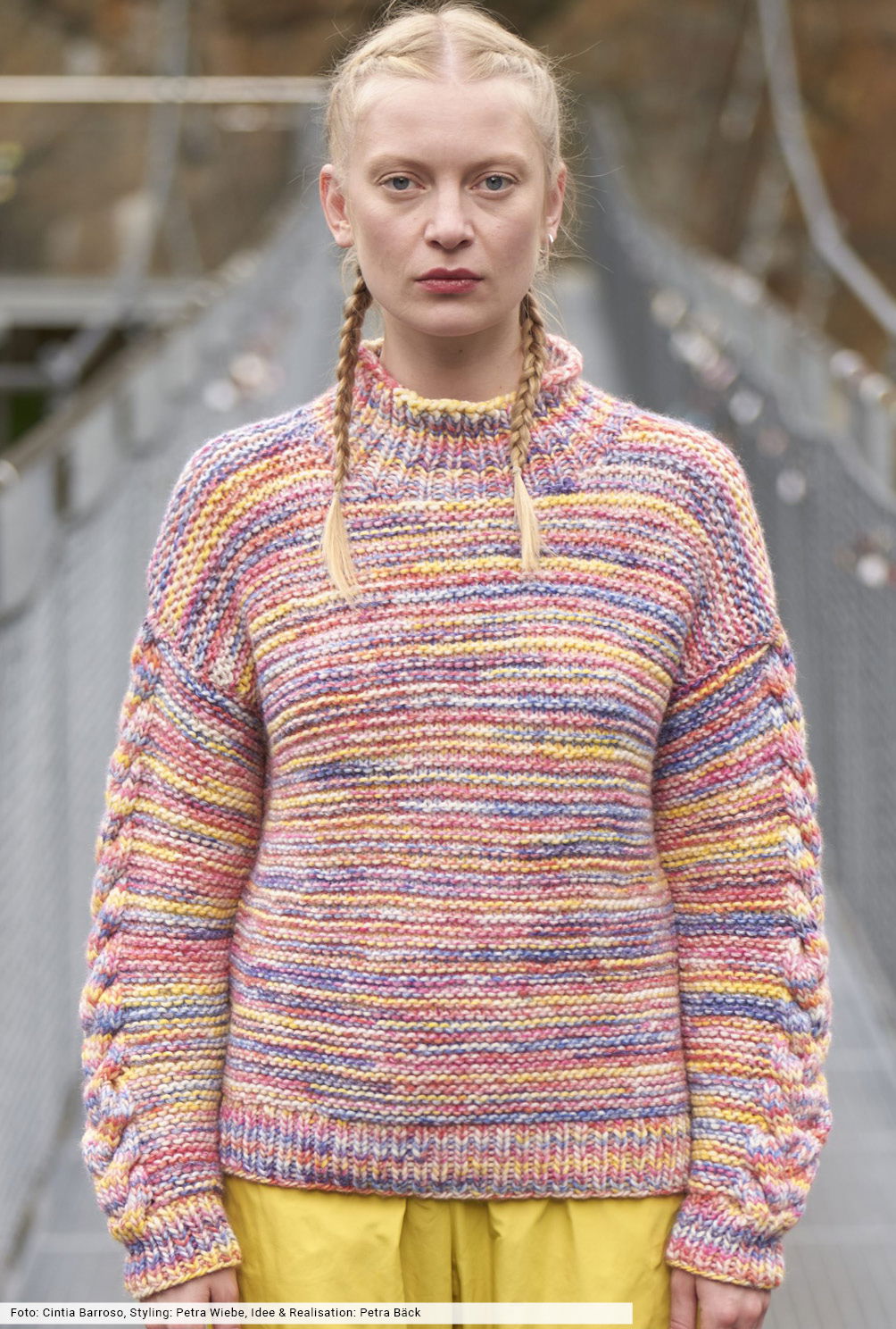 Der Style von Chunky Knit ist alles, nur nicht zurückhaltend. Das beweist auch dieser Pulli, dessen bunt meliertes Garn aus reiner Schwurwolle im Mittelpunkt steht. Wir haben auf schwierige Muster und raffinierte Schnittdetails verzichtet und lassen einfache Kraus-rechts-Rippen zum Einsatz kommen. Nur auf der Ärmelmitte setzt sich ein plastischer Zopf gekonnt in Szene, den wir in unserer Anleitung genau beschrieben haben.