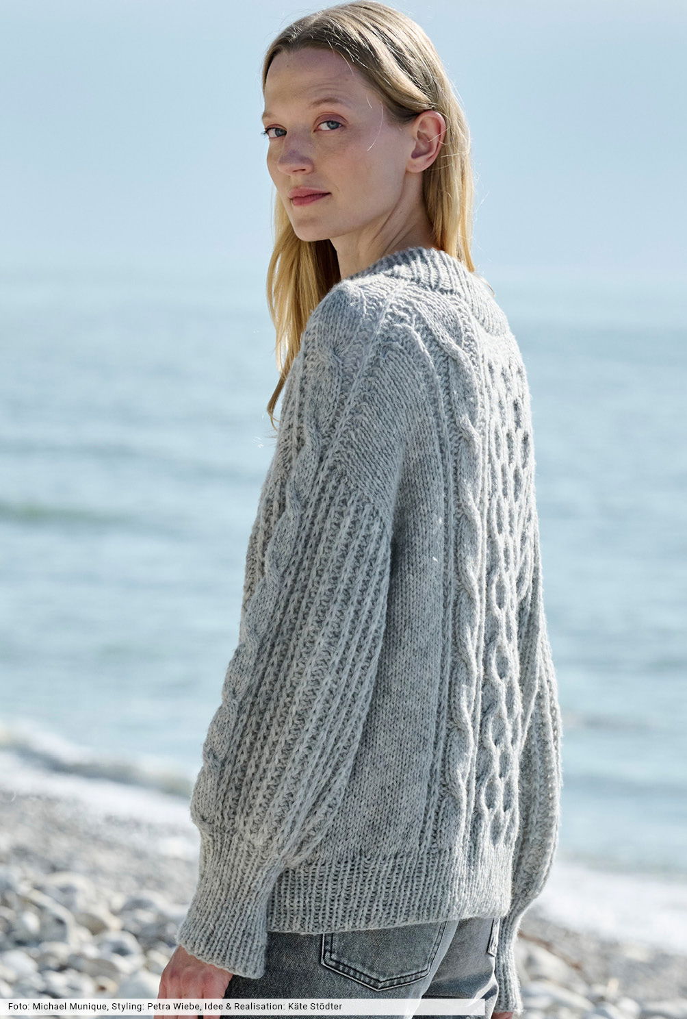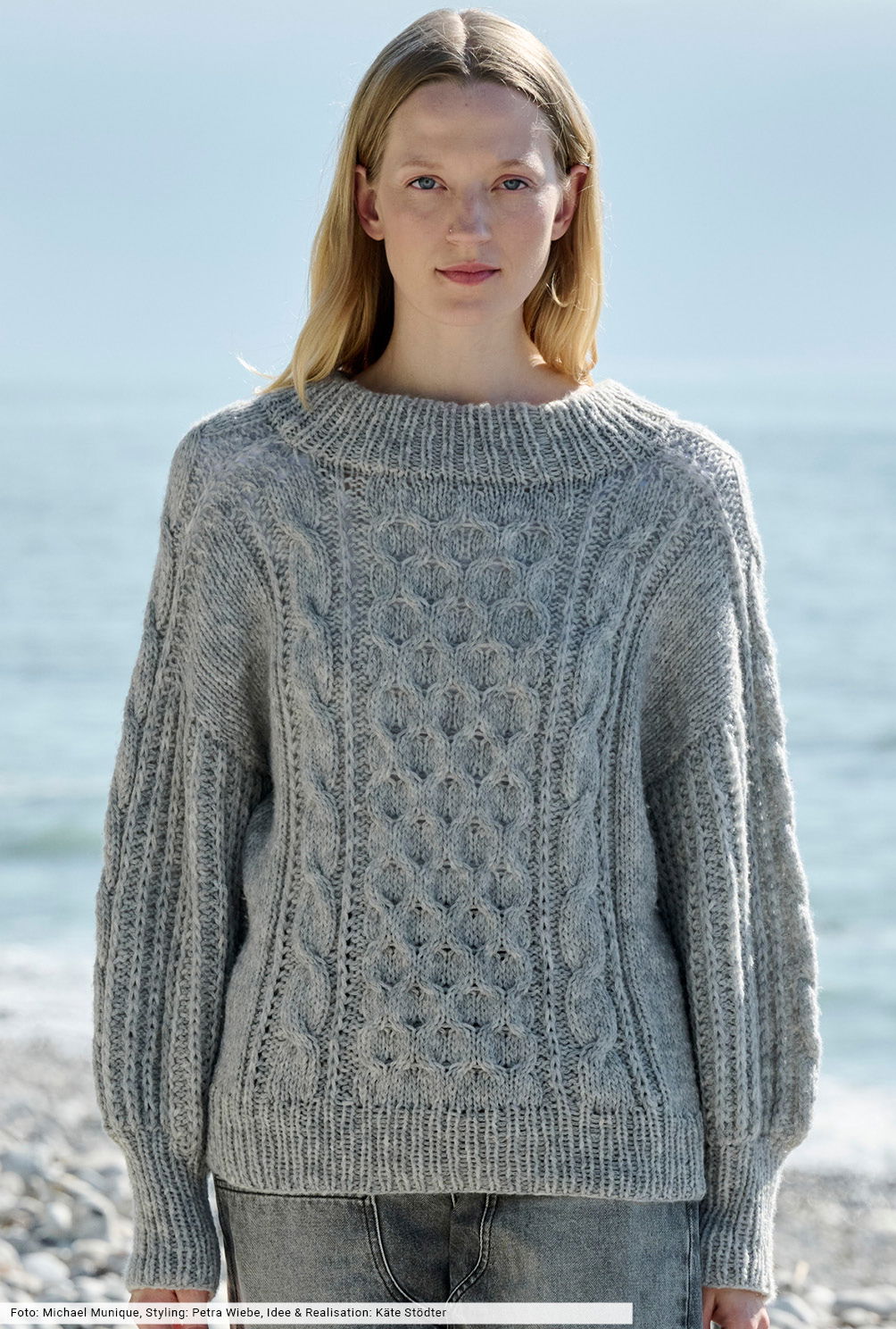 Bei diesem Pulli wird von oben nach unten in Runden gestrickt. Du beginnst also mit der Halsblende, arbeitest dich dann Stück für Stück über die Schulterpasse bis zu Vorder- und Rückenteil sowie den Ärmeln vor und schließt die Arbeit mit den Rippenbündchen ab. Spannend und nicht ganz unaufwendig wird’s außerdem durch den Einsatz von halbpatenten Rippen und Waben- sowie Zopfstrukturen, für die du die Strickschriften direkt bei der Anleitung findest.