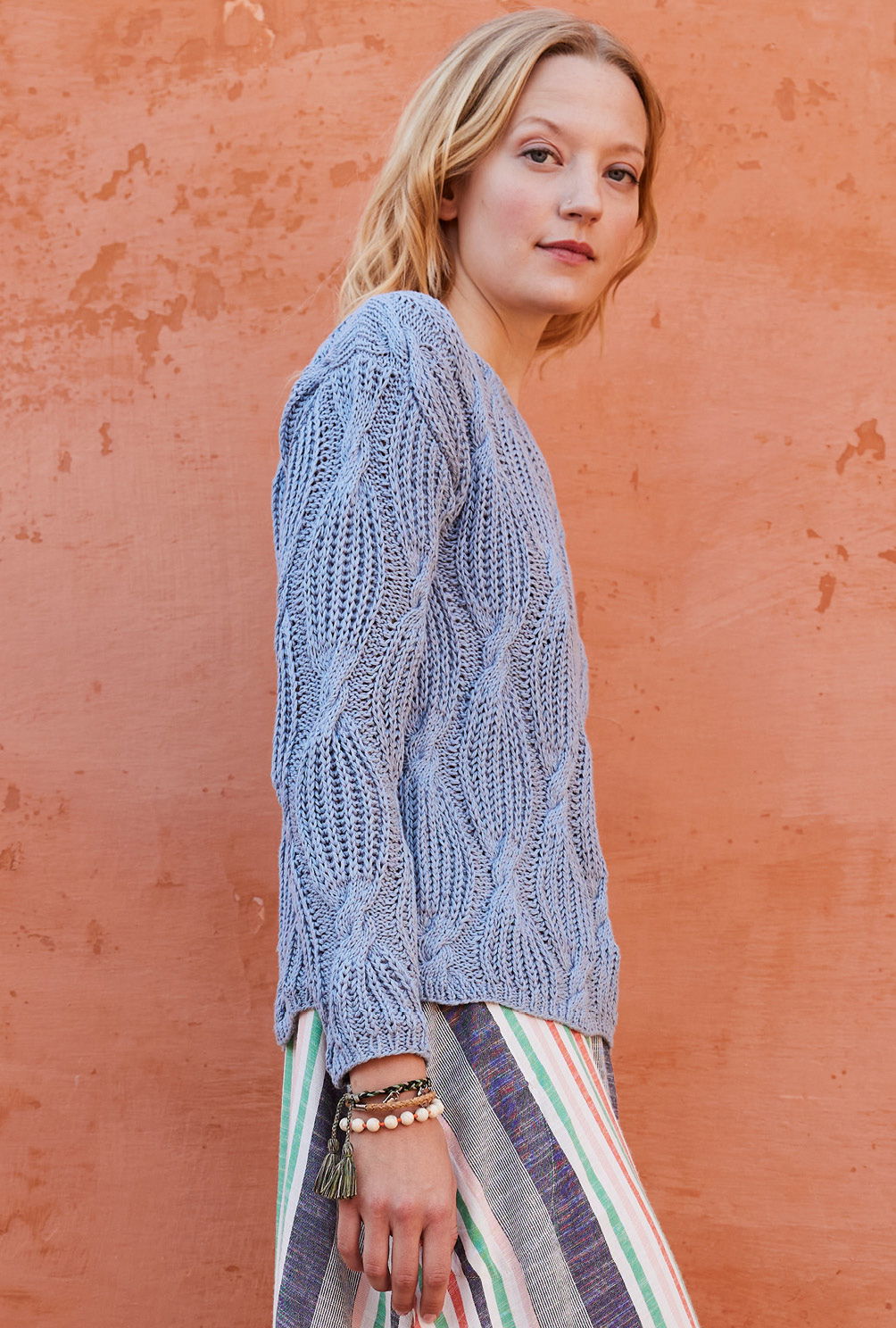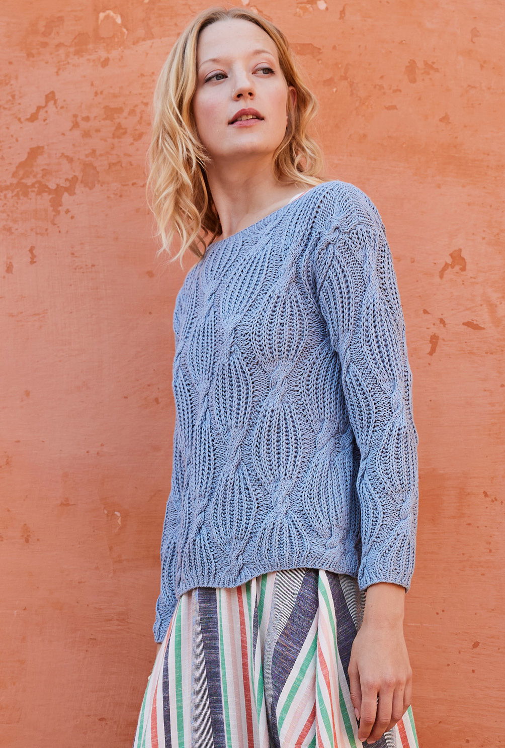 Das Patentmuster mit Zöpfen ist nicht ganz einfach und man braucht ein bisschen Geduld, damit die Arbeit gut von der Nadel geht. Deshalb empfehlen wir dir, auf jeden Fall nach unserer Strickschrift eine Maschenprobe zu machen, so kannst du ein bisschen üben. Im Gegenzug haben wir alle Teile gerade gearbeitet, der Passform zuliebe haben wir allerdings bei den Ärmeln eine leichte Schrägung eingebaut. Oben schließt der Pulli mit einer schmalen Rippenblende ab und lässt dadurch den modischen Turtleneck entstehen.