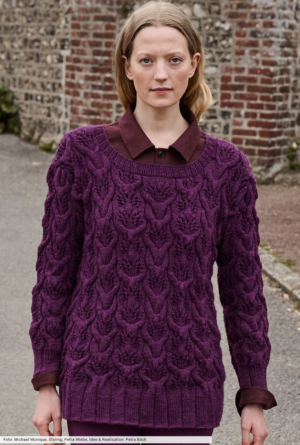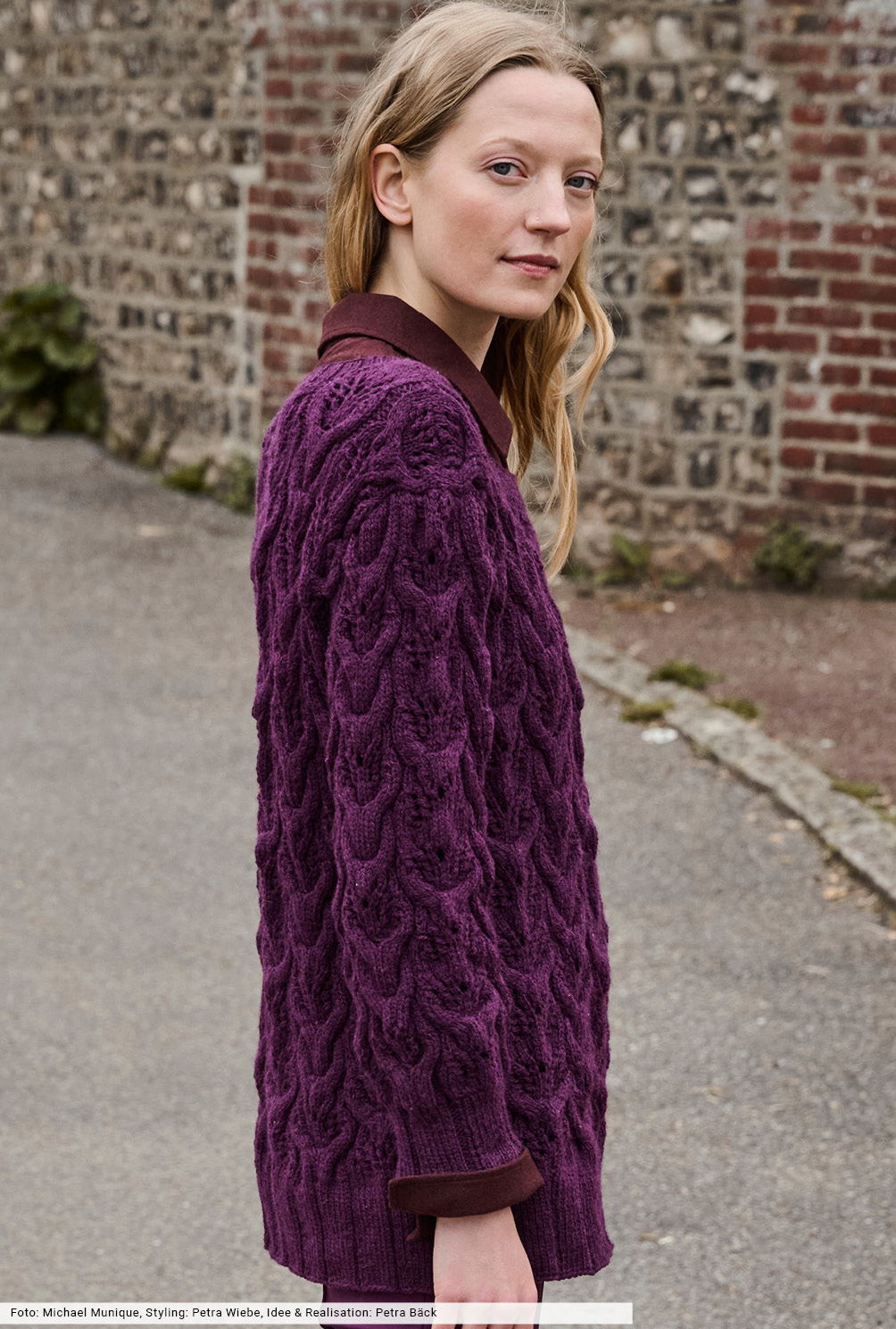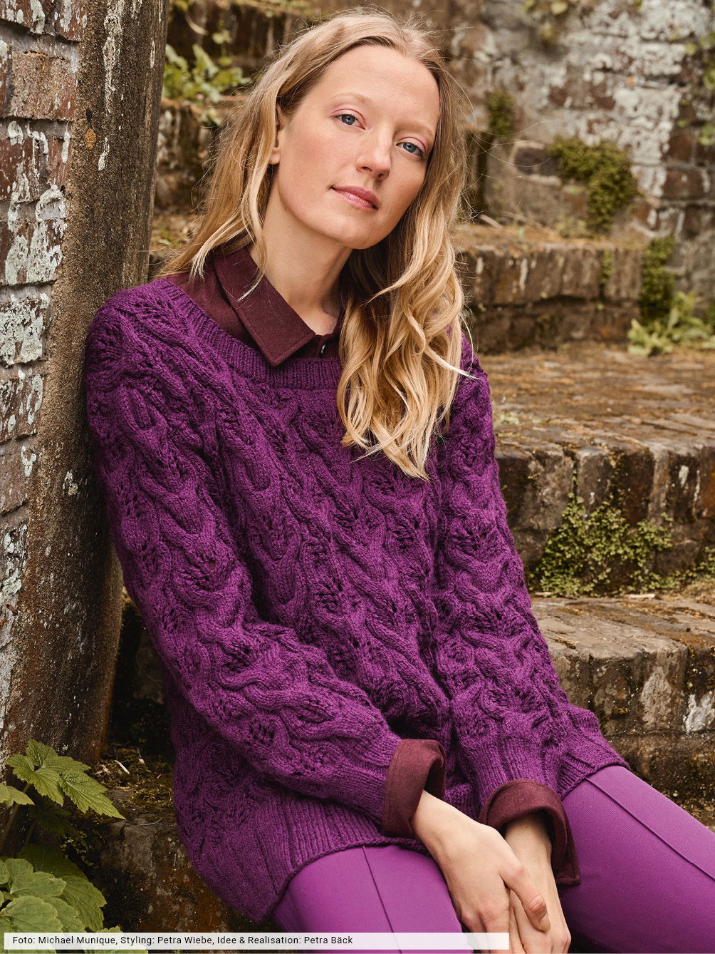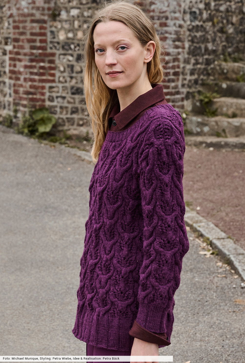 Die kalten Tage kündigen sich langsam an und mit ihnen Maschen aus griffiger Wolle und harmonischen Beerentönen. Monochrom gestylt stehen sie für ein Lebensgefühl, das die Sehnsucht nach Lässigkeit und nach Individualität kennzeichnet. Bestens umgesetzt bei diesem auberginefarbenen Pulli aus edler Schurwolle, die mit Yakfasern angereichert wurde. Mit markantem Zopf-Ajourmuster und fein ausgearbeiteten Keulenärmeln ein modisches Highlight in dieser Herbstsaison.