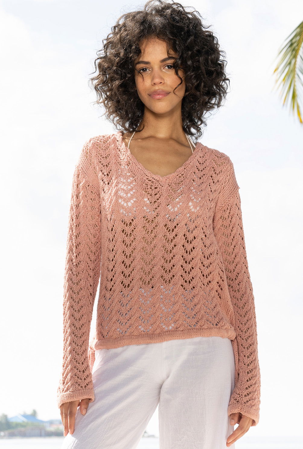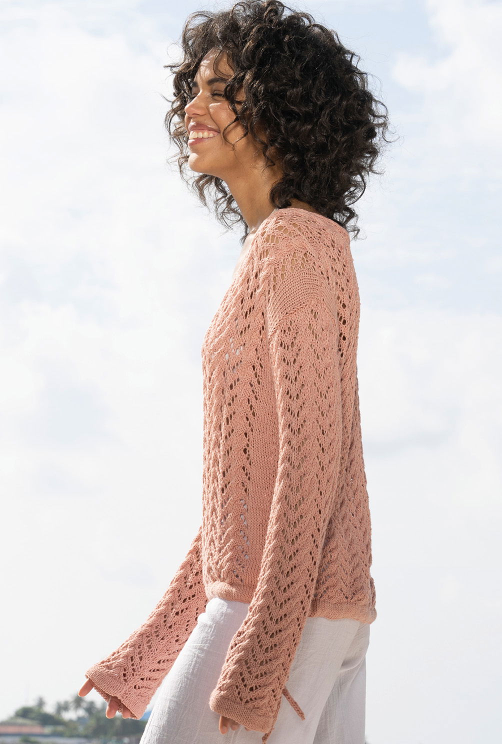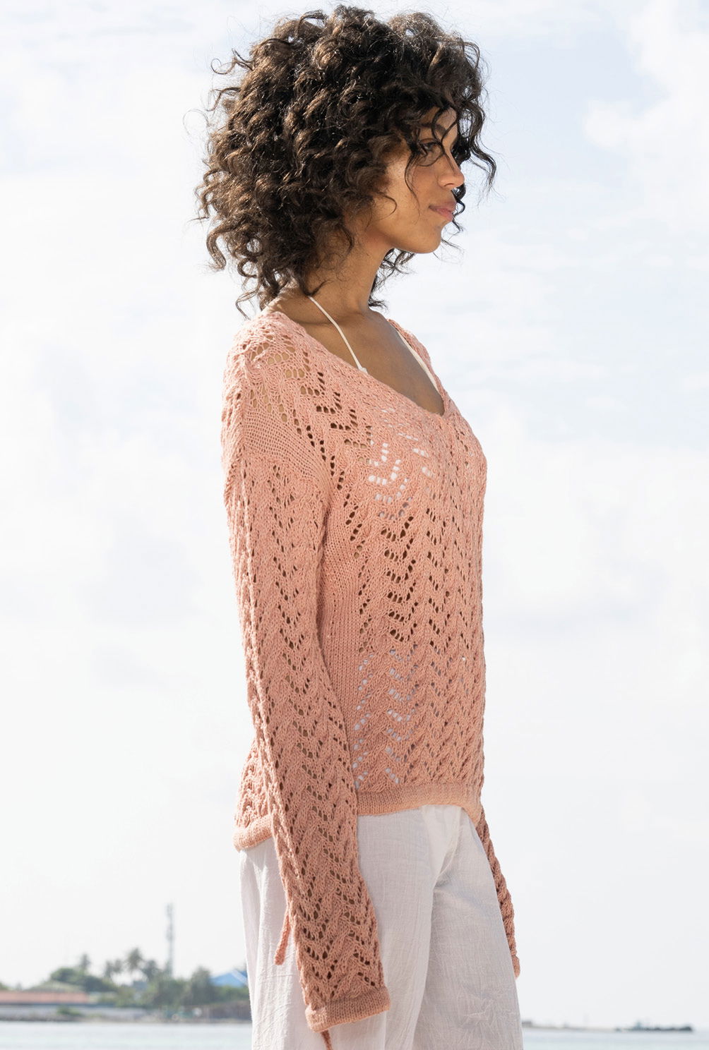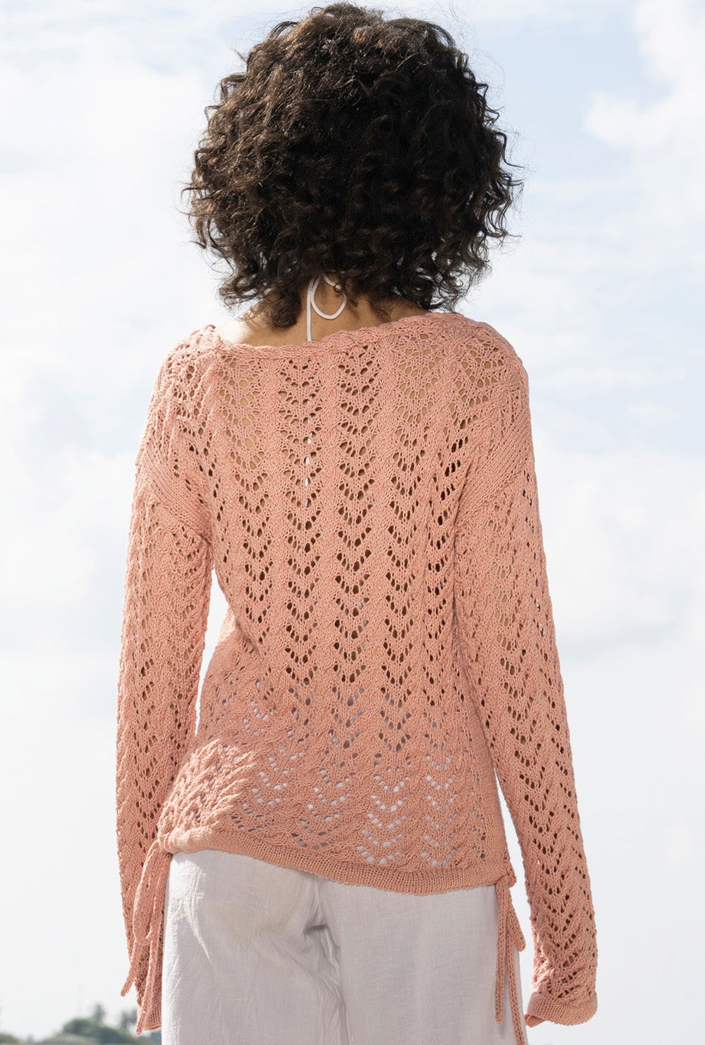 Das Gute gleich zu Beginn: Das semitransparente Zopf-Lochmuster dieses lässigen Pullis ist gar nicht schwer. Es sind die Details, die Aufmerksamkeit erfordern. Zum einen ist es der tiefe V-Ausschnitt, der am inneren Rand von einer schmalen Zopfblende umrahmt wird. Die Abnahmen für die Schrägung erfolgen also im vor beziehungsweise nach der Blende. Zum anderen ist es die glatt-rechts-gestrickte Saumkante, die nach innen gesäumt wird. Die Breite ist mit einer eingezogenden Kordel variabel einstellbar, die Kordel wird an den Seiten zu Schleifen gebunden.
