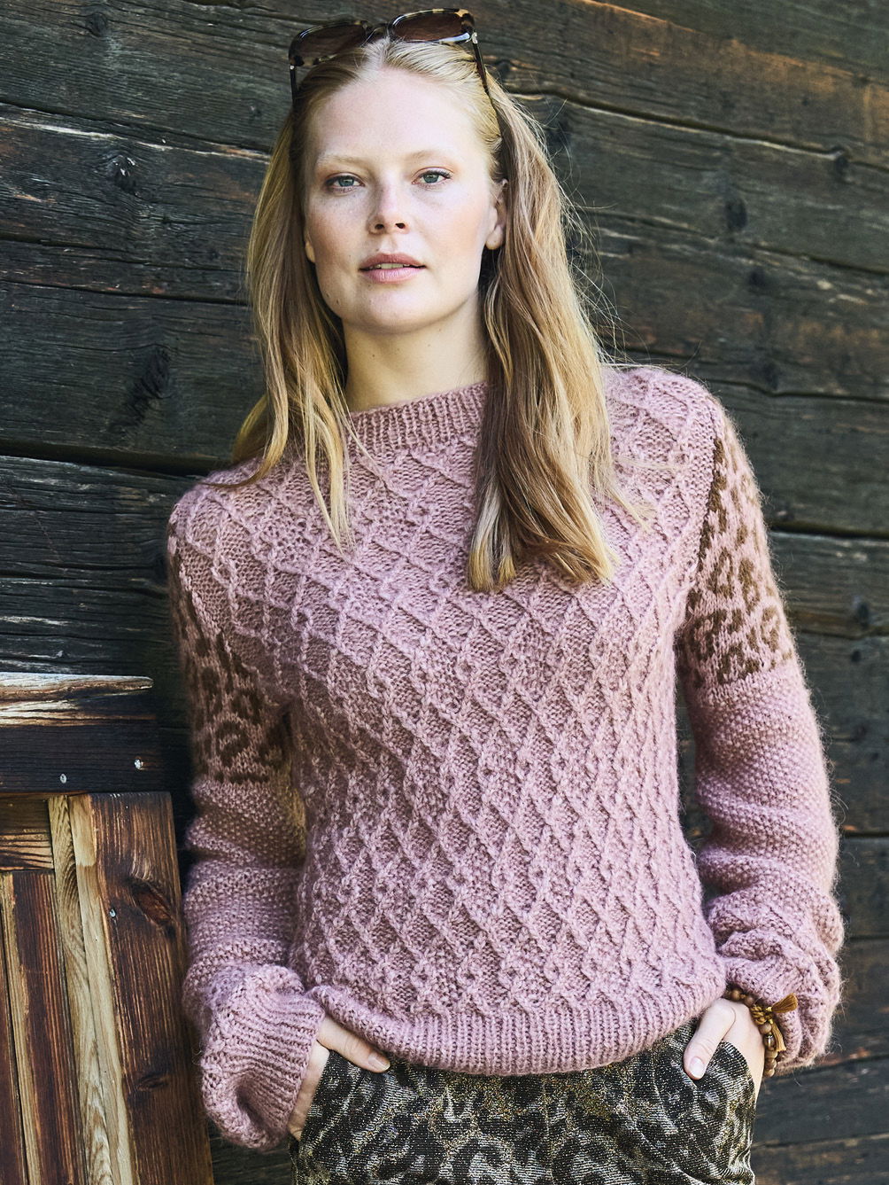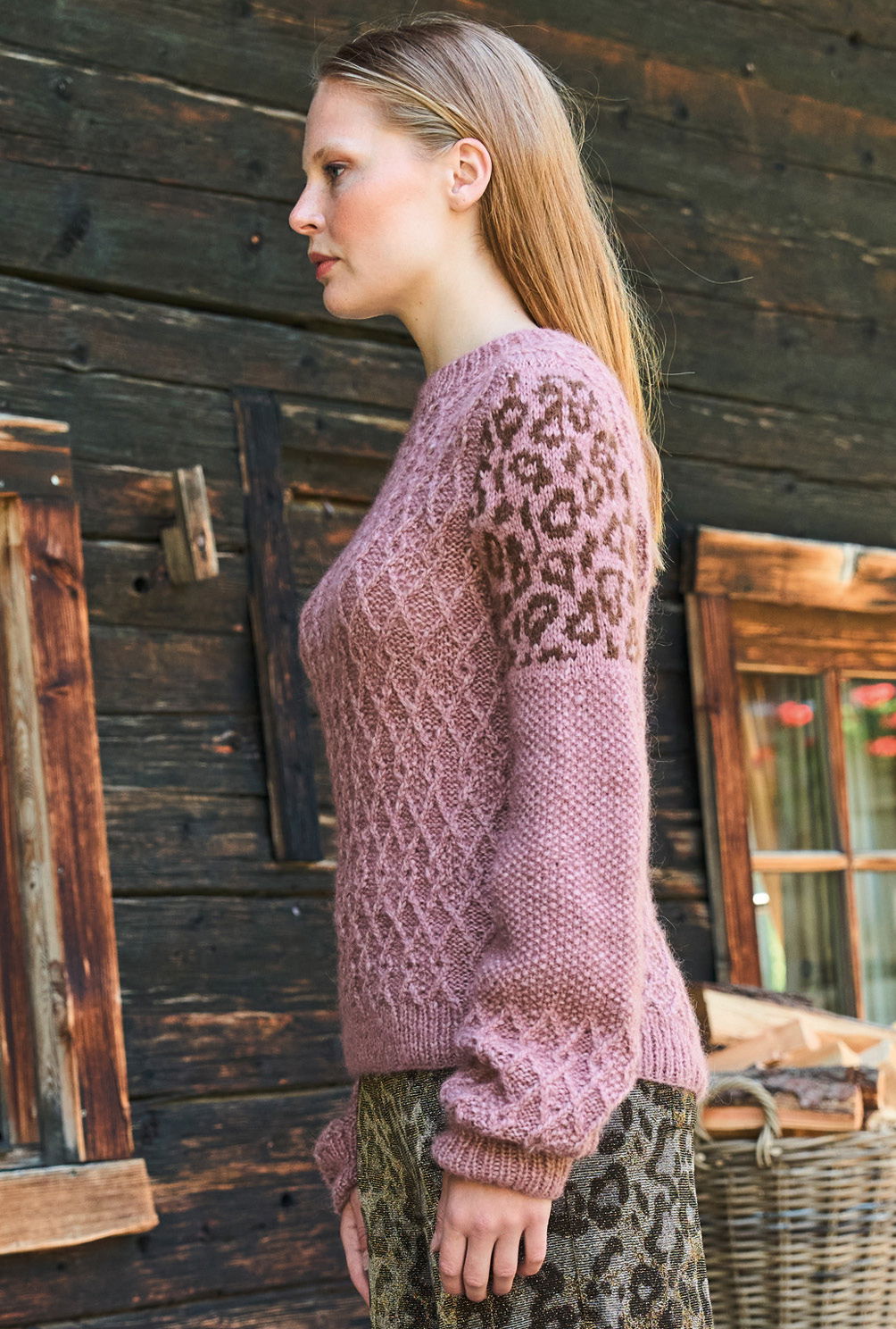 Mit seinen markanten Rautenstrukturen ist dieser Pulli aus weichem Alplaka-Polyamid-Garn an sich schon ein Hingucker. Hinzu kommt noch das im oberen Bereich der Keulenärmel eingesetzte Tierfellmuster, dass du nach einem übersichtlichlichen Zählmuster in Norwegertechnik einstrickst. Das bedeutet, dass du glatt rechts arbeitest und den unbenutzten Faden nicht allzu fest auf der Rückseite der Arbeit entlangführst. Bündchen und Halsausschnittblende im elastischen Rippenmuster bildet das klassische Finish.