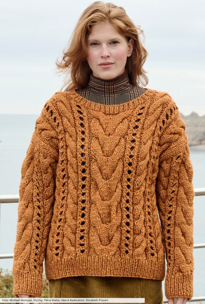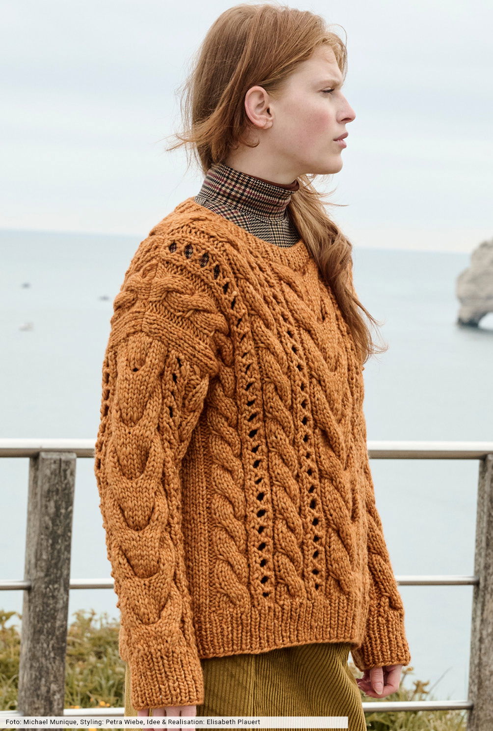 Ziemlich schnell vollzieht sich jetzt der Wechsel von luftigen Sommermaschen zu warmen Herbst-Outfits. Und die Betonung liegt auf schnell. Denn hier wird das volunminöse Schurwollgarn mit Baumwoll- sowie Yakfasern angereichert und mit dicken Nadeln verstrickt – das geht ruck-zuck und du kannst dich in wenigen Tagen an einem Pulli freuen, der nicht nur durch den leuchtenden Kürbis-Ton, sondern auch durch plakative Zöpfe und schmale Lochstreifen Blicke auf sich zieht.