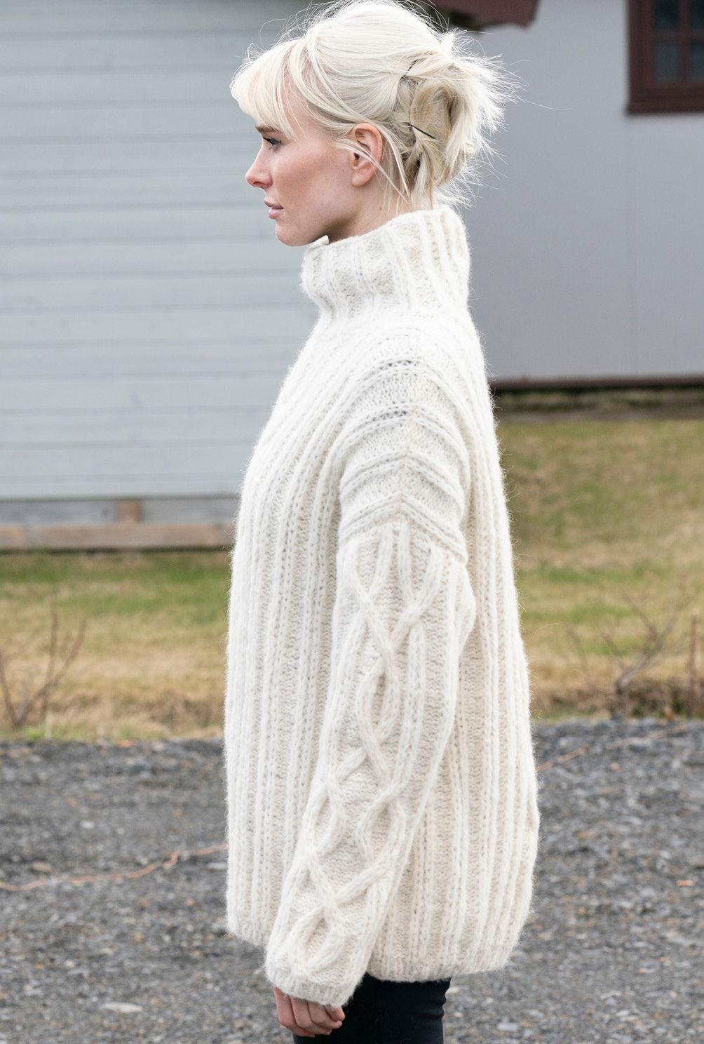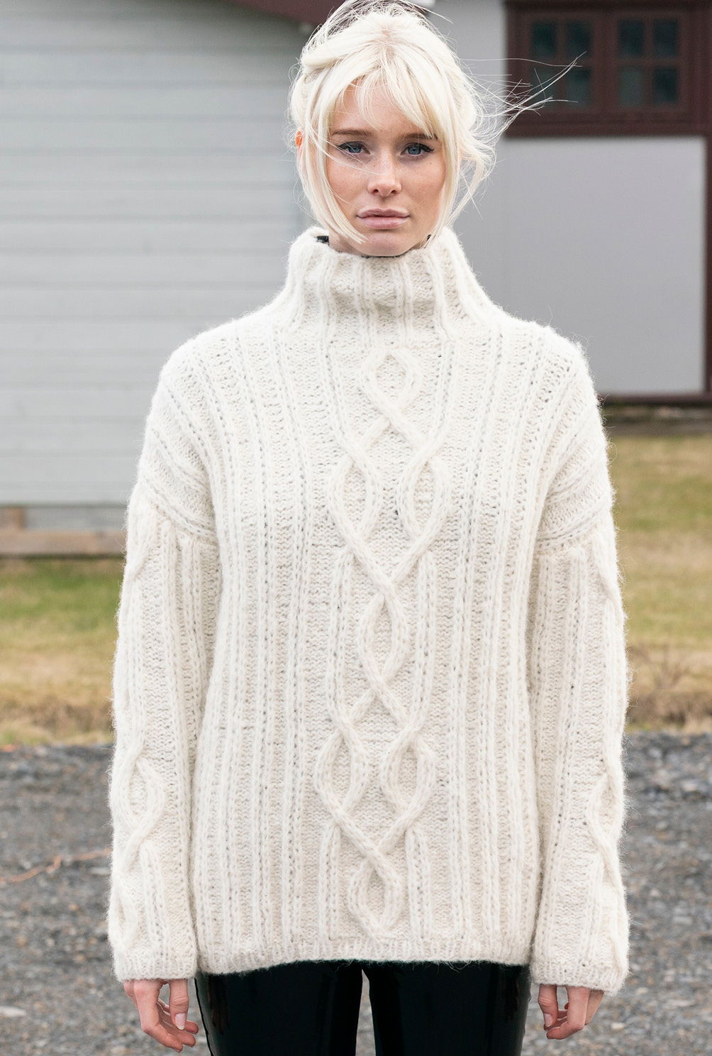 So ein wollweißer Pulli ist die perfekte Mischung aus kuschelig und cool. Kuschelig, weil das Alpaka-Mischgarn so weich und flauschig ist. Cool, weil «patente» Maschen mit markanten Zopfstrukturen kombiniert werden, für die wir eine genaue Strickschrift in unserer Anleitung gezeichnet haben. Schmale Rippenblenden halten alles schön in Form, der hohe Stehkragen wärmt die Halspartie. Das Modell kommt ohne gerundete Armausschnitte aus, hat aber eine kleine Schulterschrägung.