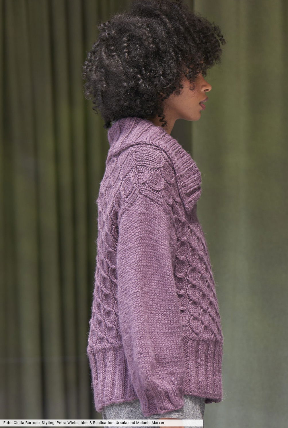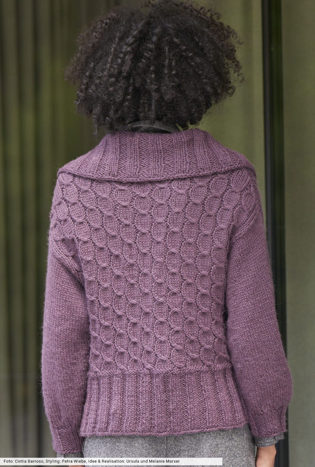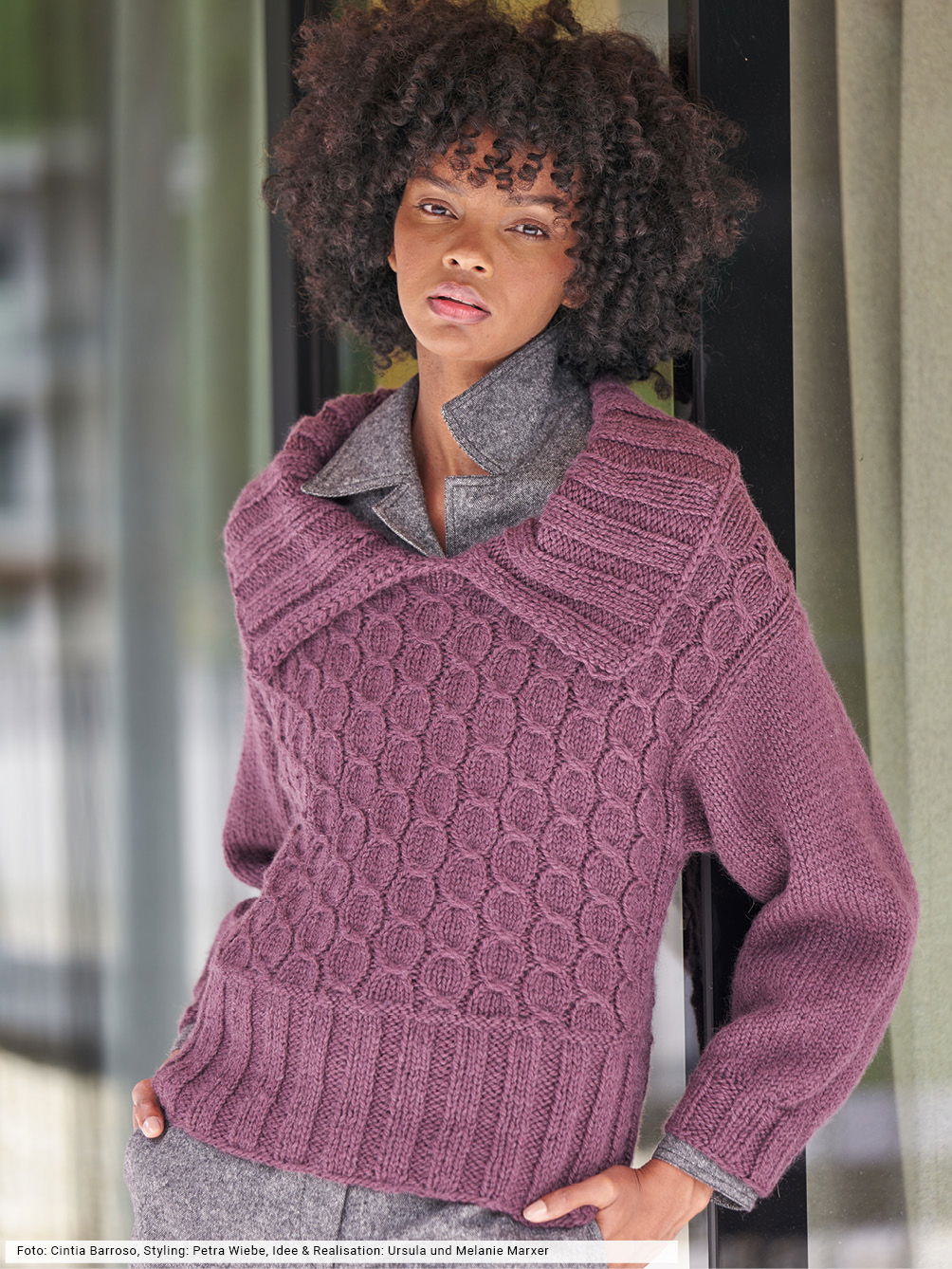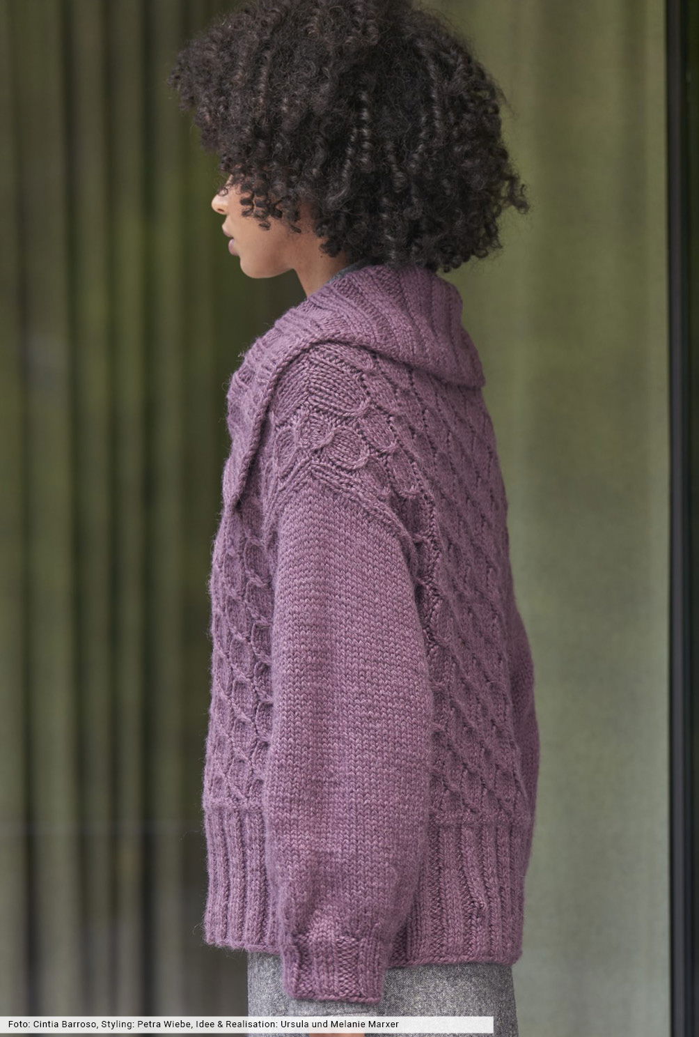 Präzise Muster wie glatt rechts, Rippen aus rechten und linken Maschen sowie markante Zopfstrukturen beweisen, wie harmonisch modische Attitüde und komfortables Wohlgefühl sein können. Das griffige Wollmischgarn macht zusätzlich Lust auf Strick und sieht in der zauberhaften Aubergine-Nuance einfach umwerfend aus. Der offene Oversizekragen bringt Spannung in den Look und umschmeichelt stilvoll die Hals- und Schulterpartie.