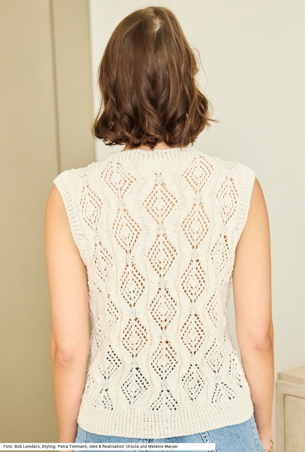 Dieses Modell kann solo als Top oder kombiniert mit einer Bluse als Pullunder getragen werden. Dank des geringen Kaschmiranteils im ansonsten aus Baumwolle bestehenden Garns liegt das Top zart auf der Haut. Die grafischen Ajourrauten sind vertikal unterbrochen von spielerischen Zöpfen, horizontal dazwischen liegen glatt links gestrickte Streifen. Bund, Armausschnittblenden und die Halsausschnittblende sind 1 Masche rechts verschränkt, 1 Masche links gearbeitet. Der ganze Pullunder wird bis zu den Armausschnitten in Runden gearbeitet. Eine Anleitung dazu gibts für die Größen 36/38, 40/42 und 44/46.