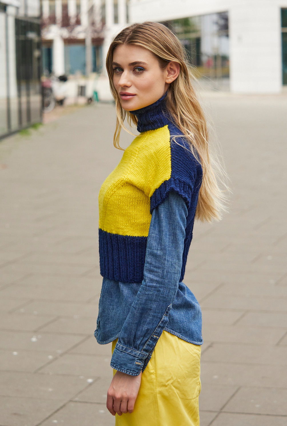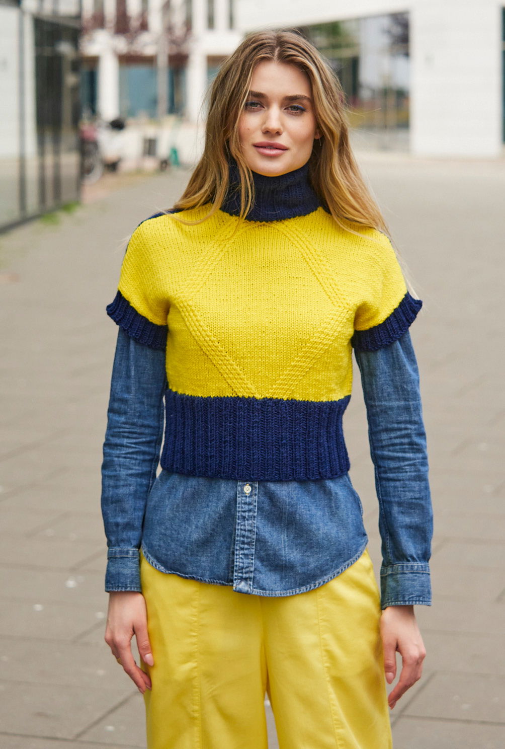 Dieser taillenkurze Pullunder mit flügelartiger Ärmelerweiterung und Rollkragen ist beidseitig tragbar; das bedeutet, dass das identische Muster im Rückenteil nochmal vorkommt, jedoch hier ganz in Marineblau. Das Vorderteil lebt nicht nur vom grafischen Muster in Rautenform, sondern auch vom starken blau-gelben Farbkontrast. Wer es dezenter mag und z. B. eine offene Jacke darüber trägt, kann auch die rein marineblaue Rückseite nach vorne tragen, denn der Halsausschnitt ist vorne und hinten identisch. Gestrickt ist dieser Pullunder aus einem Schurwolle-Polyacryl-Garn. Die Anleitung steht in den Größen 36/38, 40/42 und 44/46 zur Verfügung.