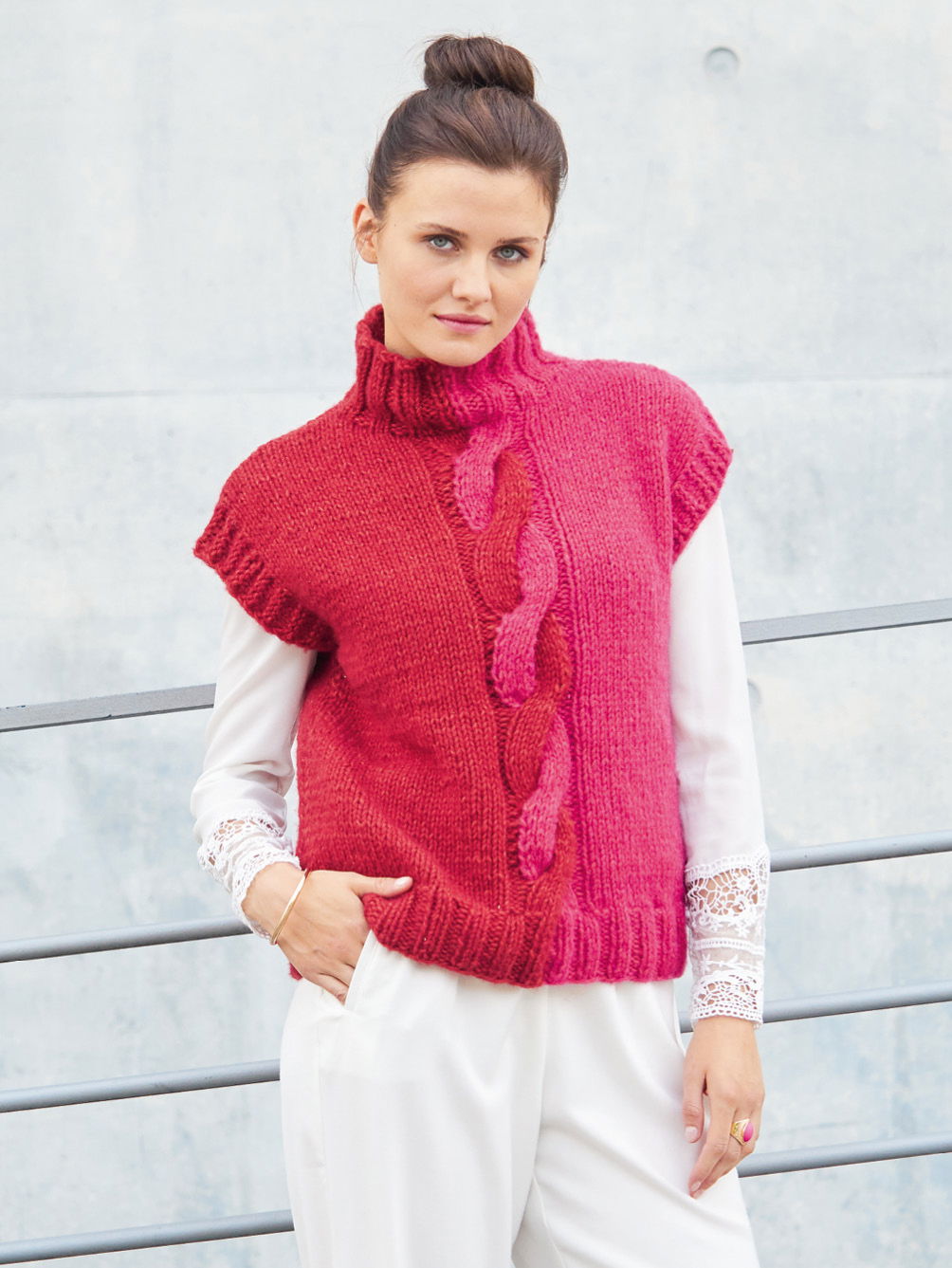 Zwei Rottöne, die jeder für sich intensiv leuchtet: auf der einen Seite Weinrot, auf der anderen Pink. In der Pullundermitte (sowohl im Vorder- als auch im Rückenteil) vereinen sich beide Farben zu einem markanten Zopf. Vorder- und Rückenteil werden ohne Armausschnittrundung gestrickt, stattdessen wird entlang der Armausschnittöffnungen gleich das Querrippenmuster abwechselnd glatt rechts und glatt links gearbeitet. Der Bund wie auch der hohe Kragen sind in breiten 2/2-Rippen gestrickt. Die Anleitung steht für die Größen 36/38 und 40/42 sowie 44/46 bereit.