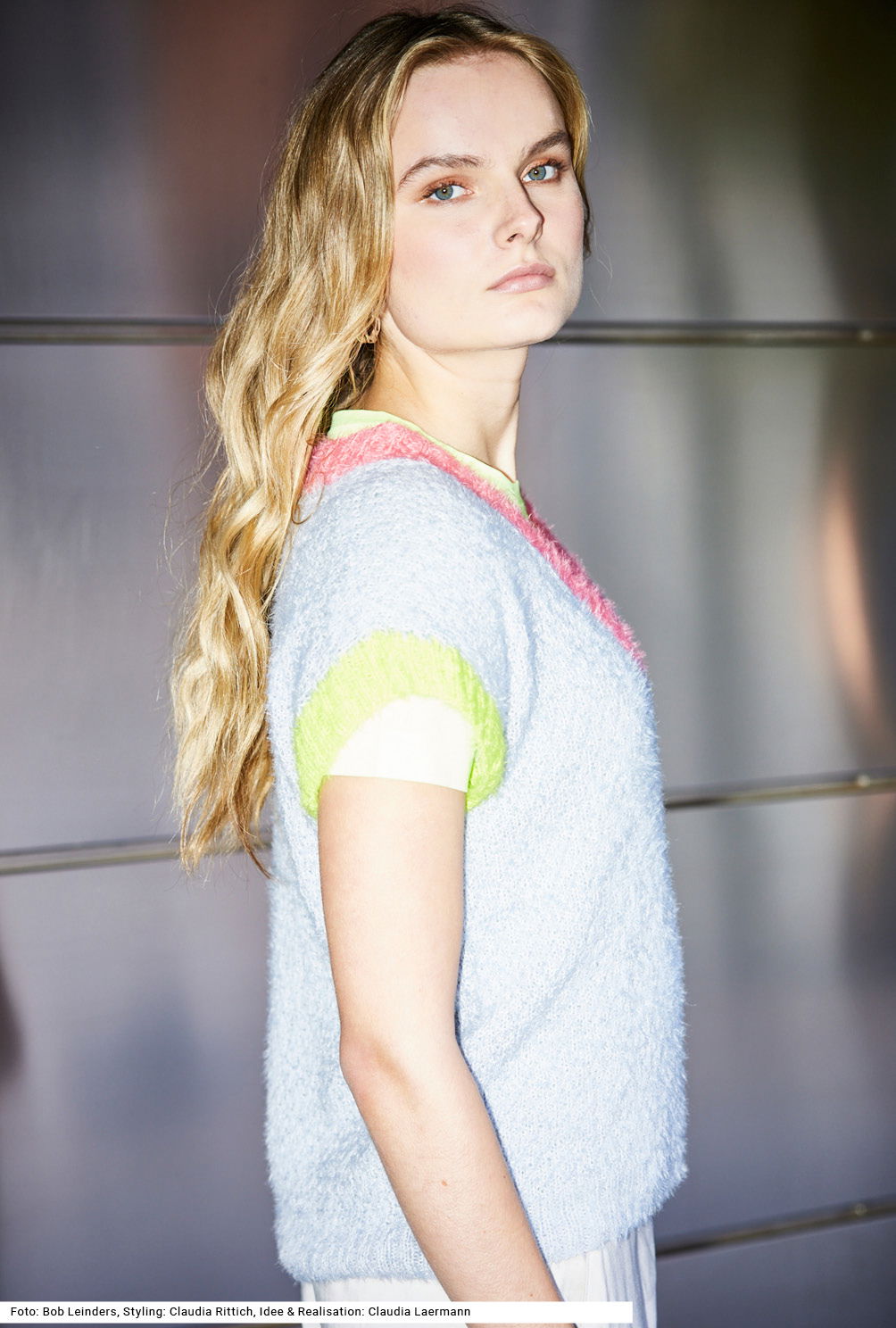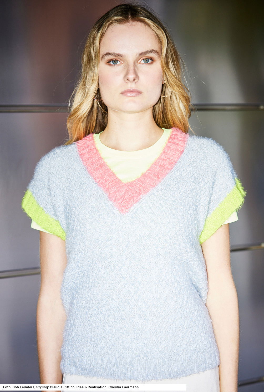 Ein flauschiger Pullunder im Preppy Style ist nicht nur hip, er eignet sich auch für Strick-AnfängerInnen, denn er ist in einem einfachen Strukturmuster gearbeitet. Farblich abgesetzte Ärmel- und V-Ausschnittblenden in leuchtenden Farben werden im Rippenmuster 2 Maschen rechts, 2 Maschen links gestrickt; Vorder- und Rückenteil haben ein einfaches Strukturmuster aus rechten und linken Maschen. Das flauschige Kettgarn besteht aus Bio-Baumwolle und recyceltem Polyamid. Eine Anleitung für dieses Modell kann in den Größen 38/40, 42/44 und 46/48 downgeloadet werden.