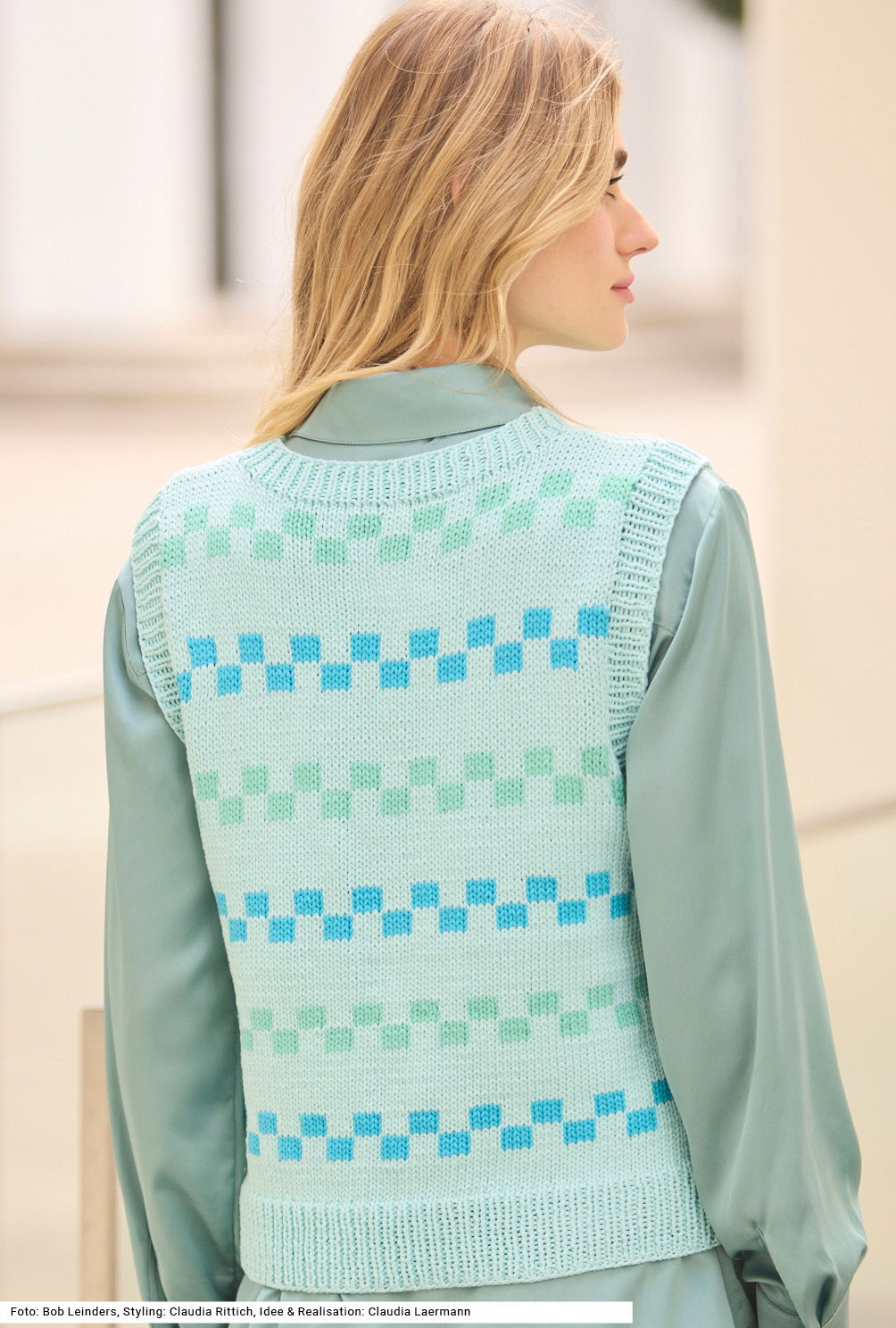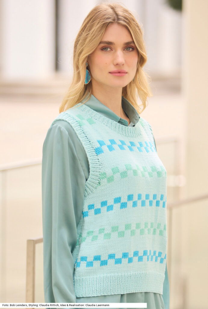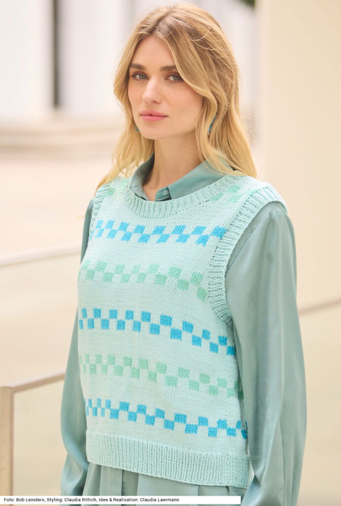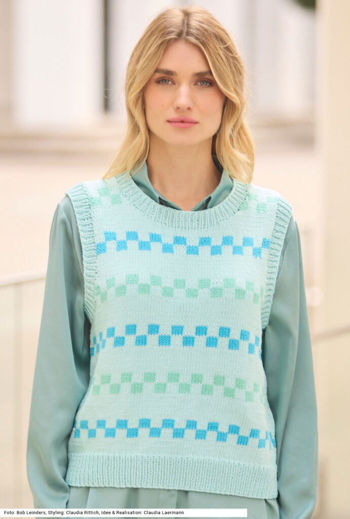 Ein Pullunder mit klassischem Schnitt, das heißt, mit weiten Armausschnitten, die eine schmale Schulterpartie machen. Die Streifen des gewürfelten Jacquardmusters sind getrennt durch ebenfalls glatt rechts gestricke, jedoch unifarbene Streifen – das Ganze Ton in Ton. Der Bund, die Armausschnittblenden und die Blende am runden Halsausschnitt werden im 1/1-Rippenmuster gestrickt. Das Modell eignet sich auch, um es im Sommer solo als Top zu tragen. Als Garn empfehlen wir eines aus Baumwolle mit Polyamid-Anteil. Eine Anleitung kann für Größen 38/40, 42/44 und 46/48 downgeloadet werden.