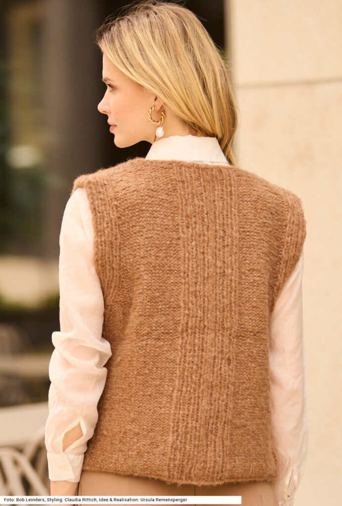 Besonders fällt hier der tiefe V-Ausschnitt des Pullunders auf. Und natürlich die klare Linie und die überaus kuschelige Babylama-Wolle, die so weich ist, dass sie auch für Menschen mit empfindlicher Haut geeignet ist. Die hohlen Fasern des Garns haben eine hervorragende Wärmeisolierung und Leichtigkeit. Das Rippenmuster entlang des V-Ausschnitts beginnt bereits am Bund; es wird auch an den Seitennähten gearbeitet. Ansonsten wird glatt links gestrickt. Mit seiner lässigen Passform wirkt das Modell klassisch und modern zugleich – ein Dauerbrenner für jede Garderobe. Eine Anleitung gibts für die Größen 36/38, 40/42 und 44/46.