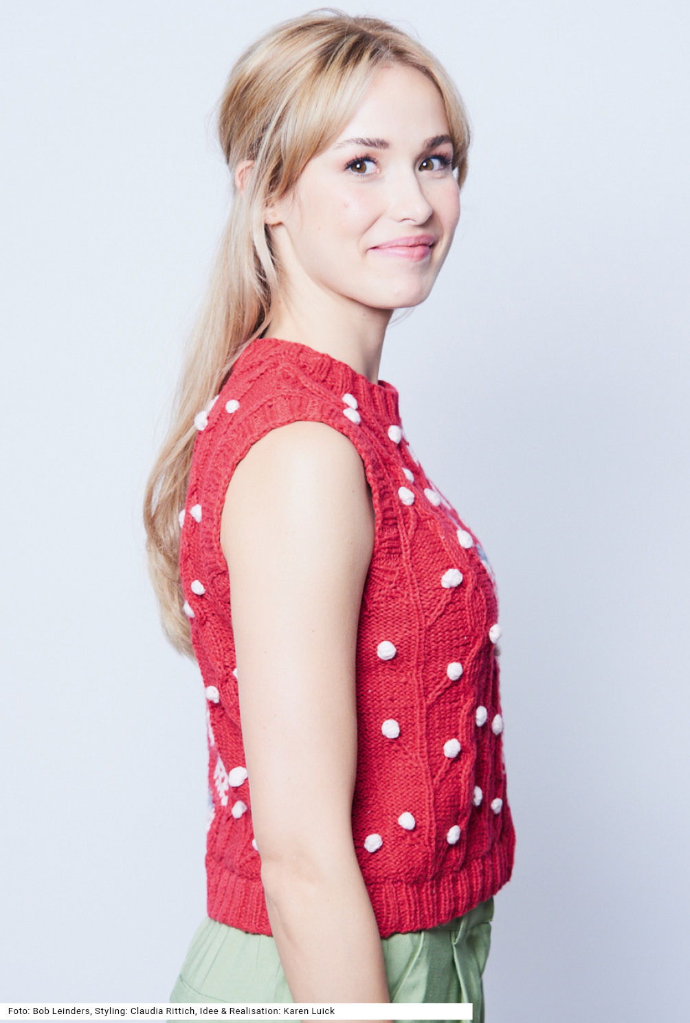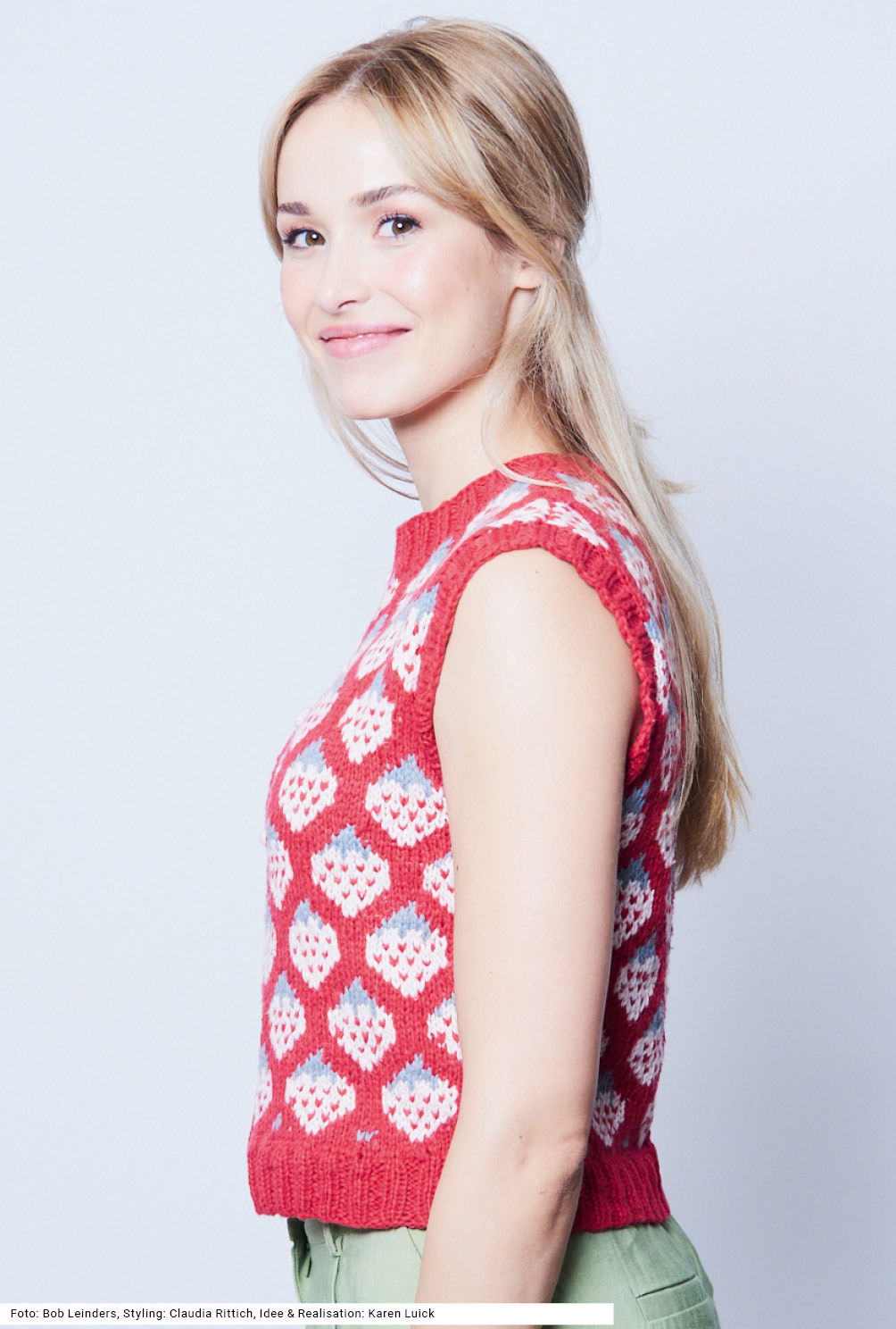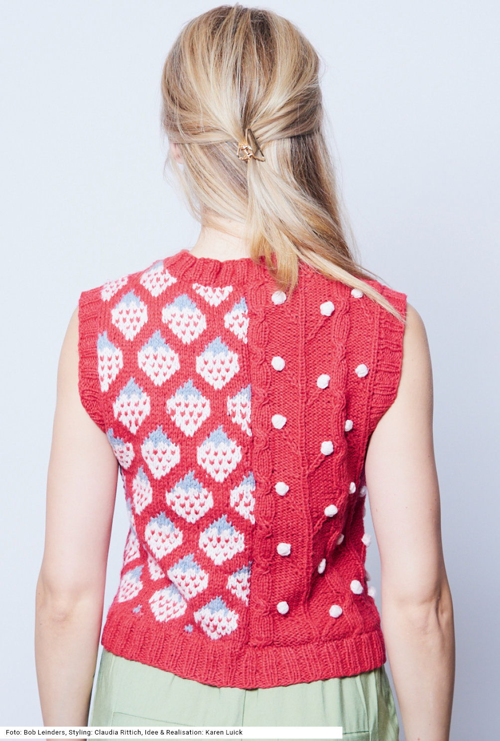 Dieser Pullunder aus einem voluminösen Baumwoll-Schlauchgarn begeistert mit einem Erdbeer-Einstrickmuster auf der einen Hälfte sowie einem Aran-Zopfmuster auf der anderen – mehr Vielfalt geht kaum. Die einzeln gehäkelten weißen Noppen werden nachträglich an den Zweigen des Aranmusters eingeknotet – sie setzen sich als Kontrast vom ansonsten roten Gestrick ab. Die grafisch angeordneten Erdbeeren in Rot, Rosa und Grau werden umschlossen von roten Rauten. Bund, Halsausschnitt- und Armausschnittblenden sind im 2/2-Rippenmuster in Rot gearbeitet. Eine Anleitung gibt es für die Größen 34/36, 38/40 und 42/44.