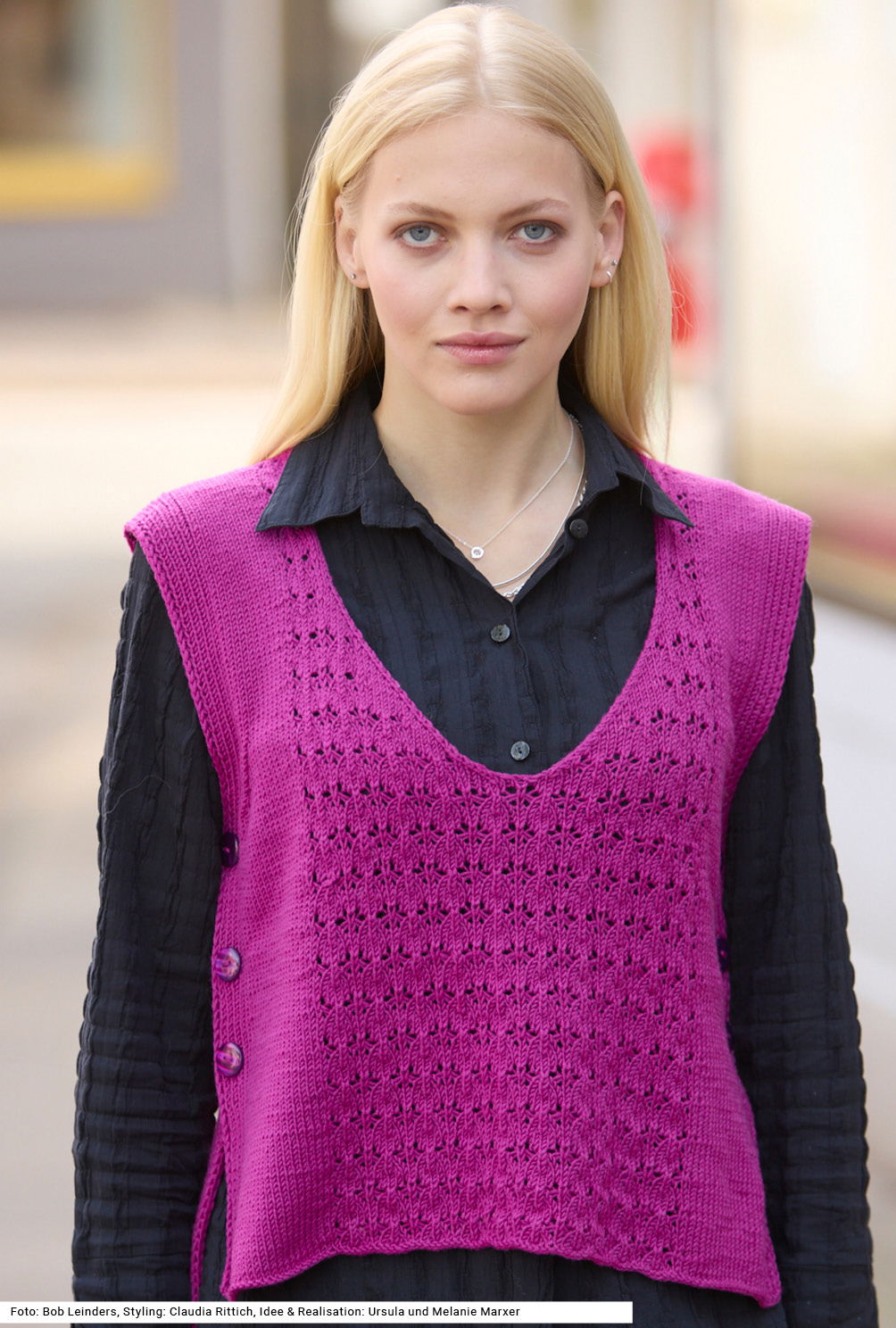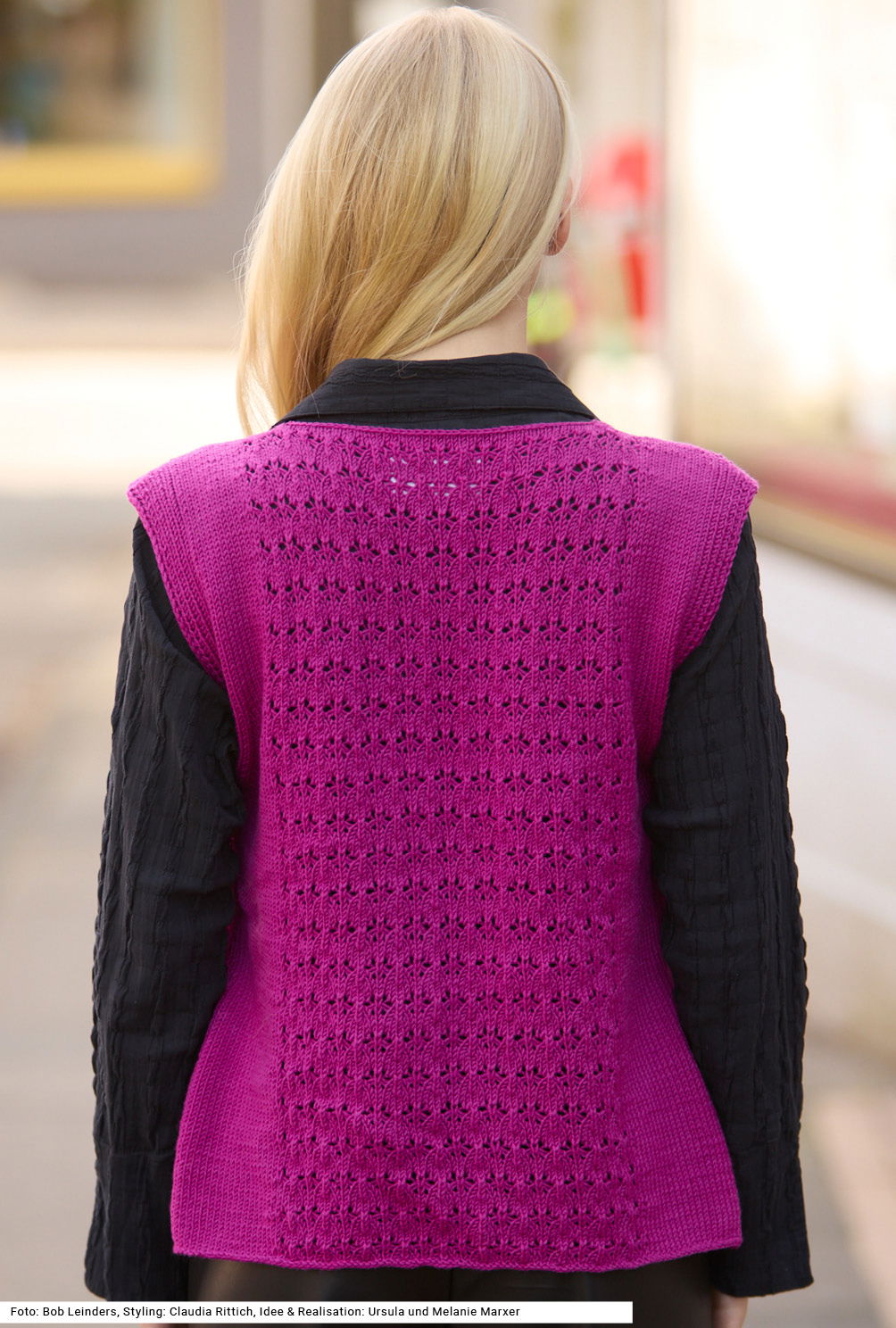 Es sind die vielen Details, die dieses Modell so interessant machen. An den Seiten bleiben das kürzere Vorder- und das längere Rückenteil zunächst offen und werden mit je drei Knöpfen geschlossen. Der Slip-Over mit tiefem V-Ausschnitt ist aus hochwertigem, glattem Schurwollgarn, so kommt das in der Mitte gestrickte Ajourmuster hervorragend zur Geltung; daneben wird glatt rechts gearbeitet; die seitlichen Rippenblenden werden direkt mitgestrickt. Eine Anleitung für diesen außergewöhnlichen Pullunder gibt es für die Größen 36 – 40, 42 – 46 und 48 – 52.
