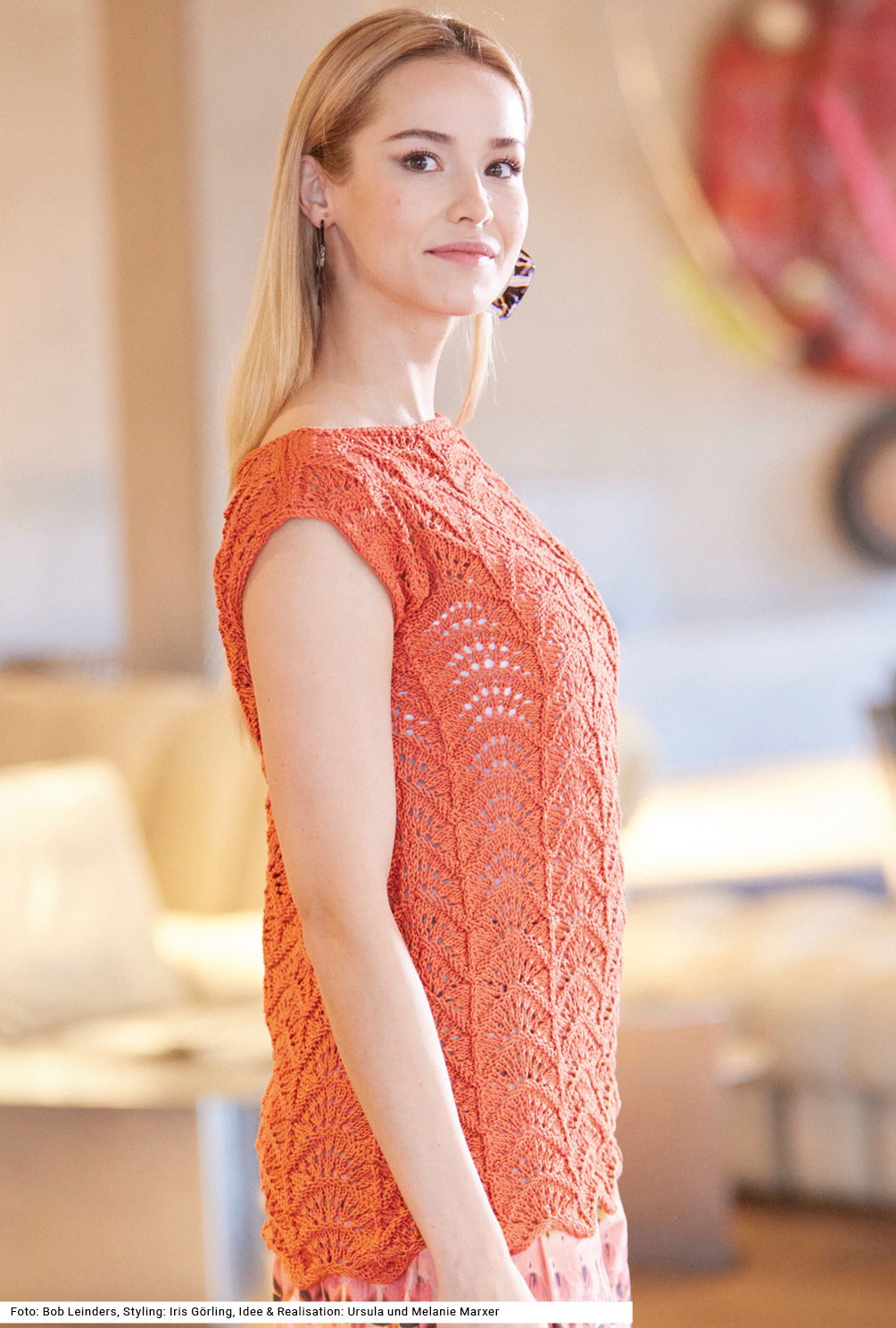 Pullunder oder Top? Beides! Dieses Modell ist so vielseitig einsetzbar, dass du dich nicht entscheiden musst. Der Schnitt ist absolut unkompliziert, es werden einfach zwei Rechtecke gearbeitet, denn der gerade Halsausschnitt erfordert keine Abnahmen. Auch das Wellenmuster, für das es eine Strickschrift gibt, ist supersimpel. Das ziegelrote reine Baumwollgarn wird mit 3,5er-Nadeln verstrickt. Die Armausschnitte bekommen nach dem Schließen der Seitenähte noch einen I-Cord-Rand, sodass sie sauber abschließen; wie man ihn strickt, steht in der Anleitung, die für die Größen 36/38, 42/44 und 48/50 vorhanden ist.