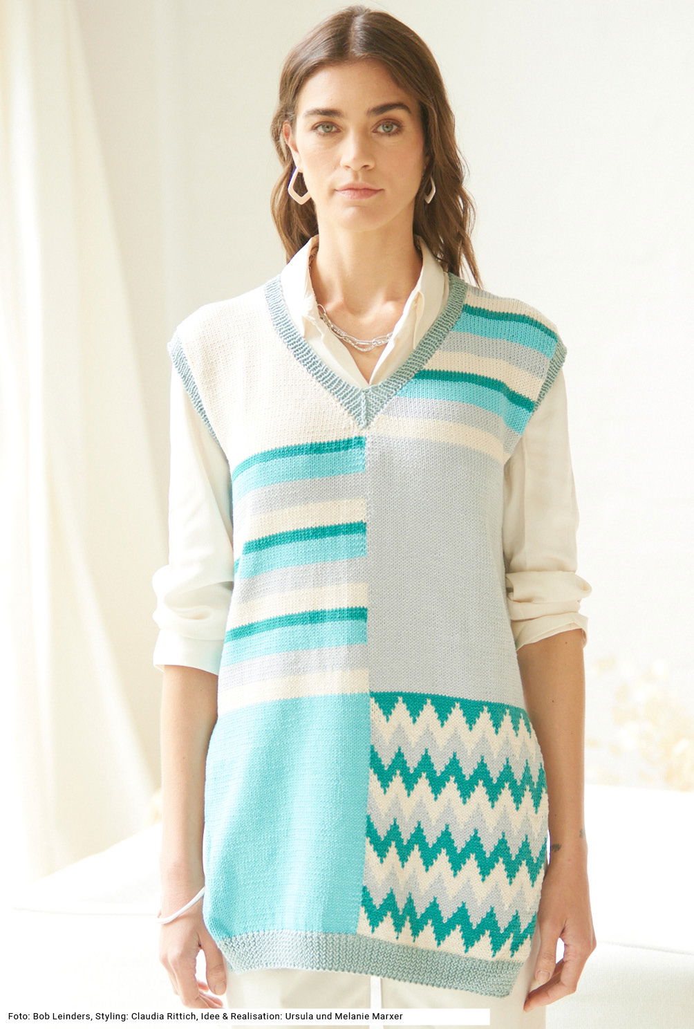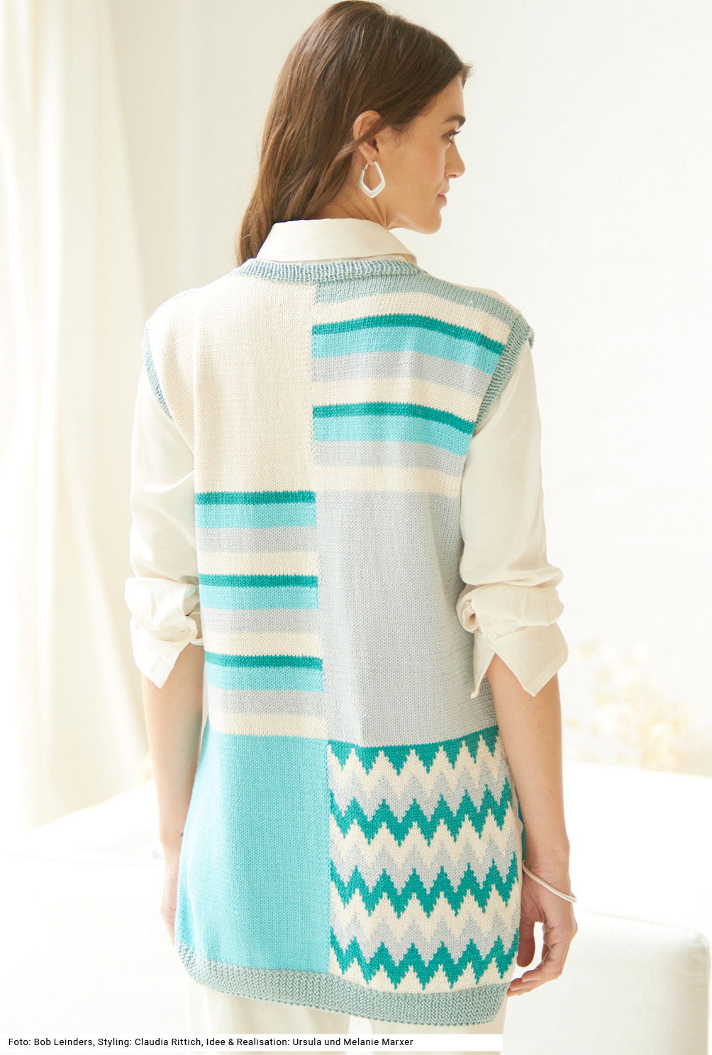 Ob Pullunder oder Tunika ist bei diesem Modell ganz dir selbst überlassen – schließlich ist dieser Allrounder für beides einsetzbar. Vorder- und Rückenteil haben hälftig eine jeweils andere Musterfolgen aus einfarbigen Flächen, Zackenmuster und Streifen – das macht den besonderen Reiz aus. Außer den Bündchen sowie der Blende am V-Ausschnitt, die im Rippenmuster gearbeitet werden, sind alle Muster glatt rechts gestrickt. Die lebendige Farbkombi wird aus einem reinen Baumwollgarn gearbeitet. Eine Anleitung kann für die Größen 36/38, 42/44 und 48/50 downgeloadet werden.