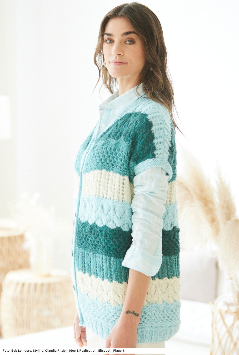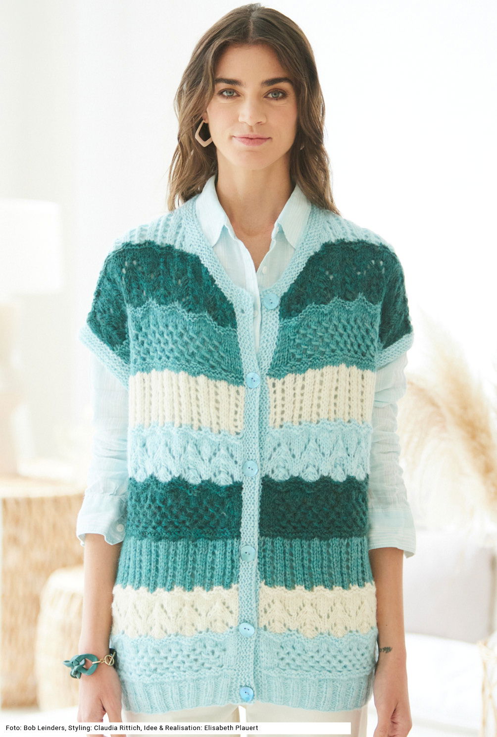 Diese Weste lässt das Herz einer jeden versierten Strickerin höher schlagen. Bei so vielen Mustern kommt nie Langeweile auf beim Stricken. Sie reicht bis über die Hüften, so können auch ein paar Pölsterchen weggemogelt werden. Das Garn aus Alpaka, Baumwolle und etwas Schurwolle ist federleicht. Rippen, glatt rechts und links, kraus rechts, Schlingen- und Ajourmuster in vier Farben machen das Modell zu einem idealen Kombipartner. Der Schnitt ist ganz gerade, sodass die Schultern überfallen. Eine Anleitung ist für die Größen 36/38, 40/42 und 44/46 vorhanden.