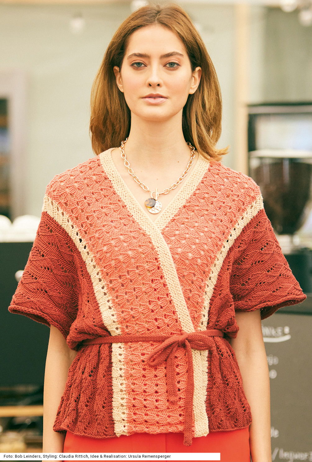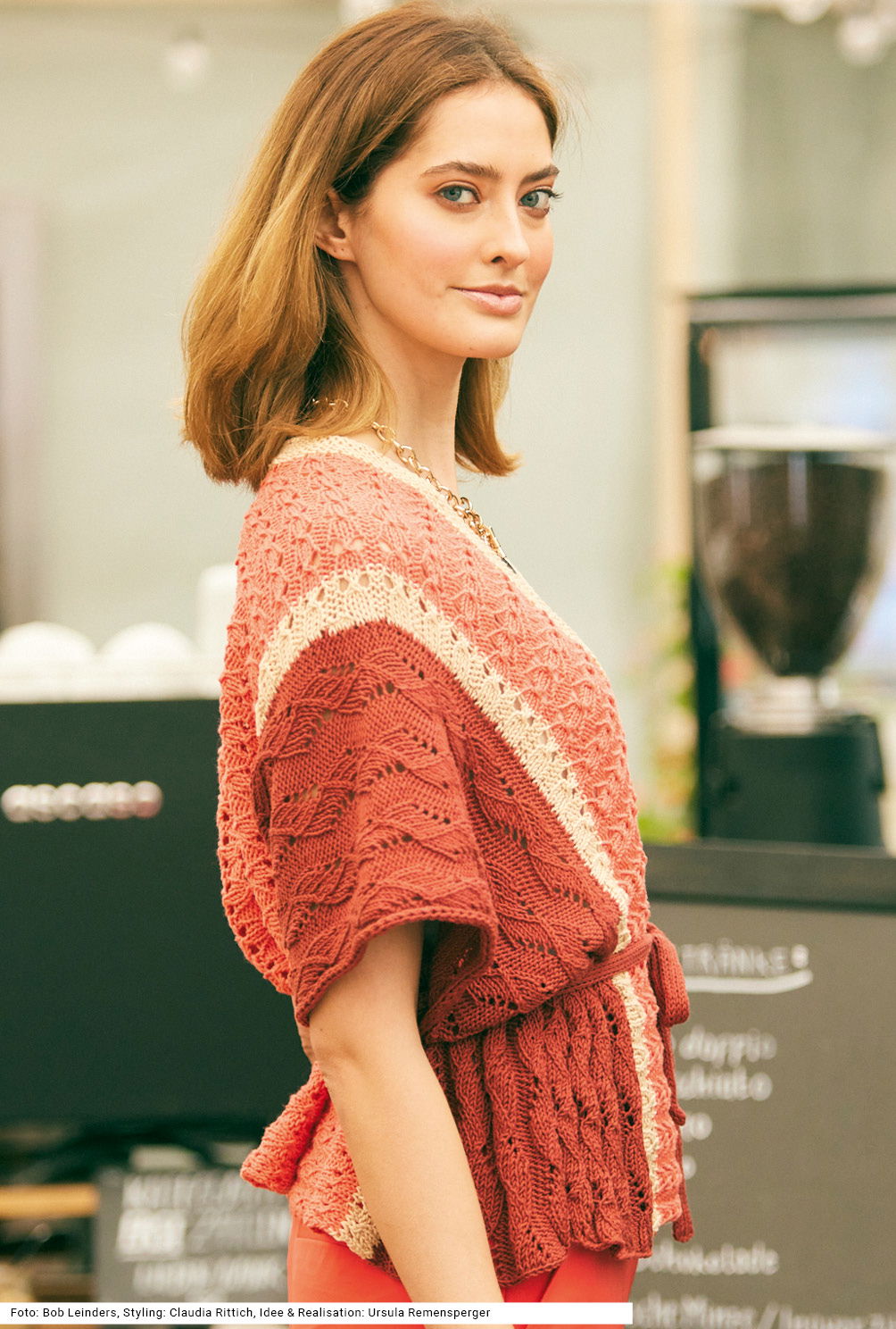 Ganz raffiniert ist bei dieser weiten Weste die Zusammensetzung der einzelnen Teile: Der mittlere Teil wird wie gewohnt von unten nach oben, jedoch über die Schultern hinweg gestrickt, die Seitenpartien danach quer dazu angestrickt. Unterschiedliche Lochmuster, und noch dazu in verschiedenen Farben, erzeugen Spannung und das Stricken macht noch mehr Spaß. Die Weite wird mit einem Bindeband in Form gebracht. Gearbeitet wird mit einem Baumwolle-Polyacryl-Garn in Erika, Lachs und Beige. Die Anleitung kann für die Größen 36 – 40 und 42 – 46 sowie 48 – 52 downgeloadet werden.