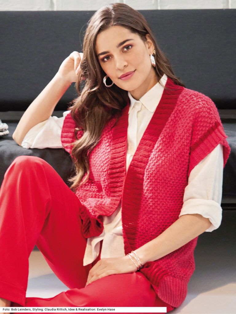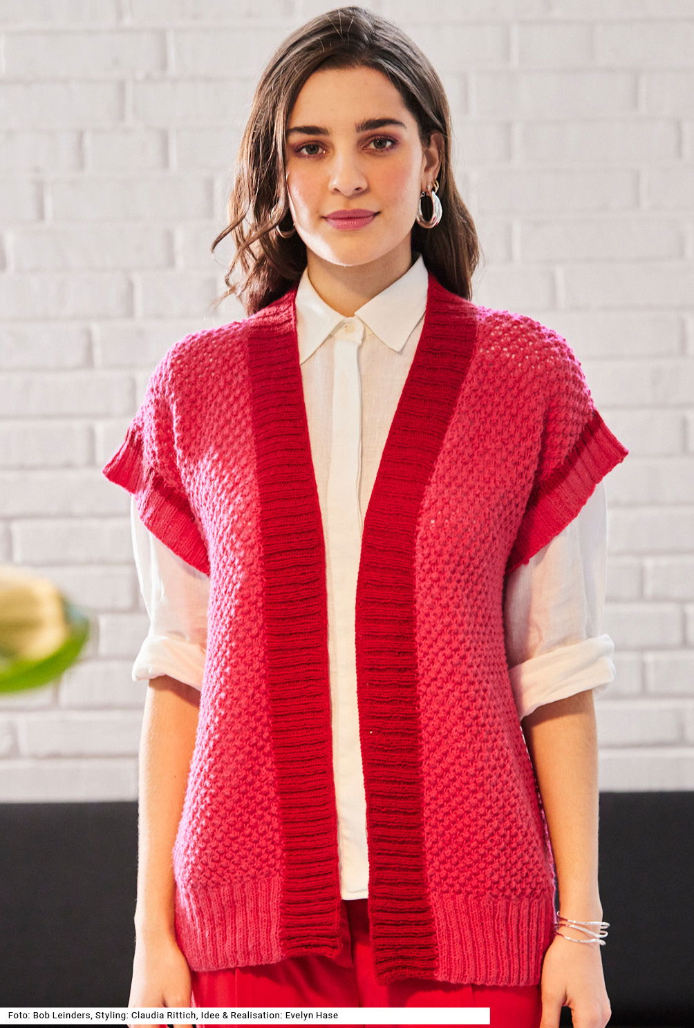 Die Farbkombi aus einer hellen und einer dunklen Farbe derselben Farbfamilie wirkt distinguiert, aber nicht abgehoben. Die verschlusslose Jacke wird im Dornröschenmuster (auch bekannt als Persianermuster) gestrickt. Es ist einfach zu stricken, lediglich bei den Abnahmen für den V-Ausschnitt ist etwas mehr Aufmerksamkeit gefragt, damit die Maschzahl beibehalten wird. Die Rippenblenden an den Armausschnitten sind zuerst in dunkel, dann in heller Farbe gearbeitet. Auch der Bund und die vordere Blende hat das 2/2-Rippenmuster. Das Modell aus Baumwolle-Schurwolle-Alpaka-Garn ist die Anleitung für die Größen 38/40, 44/46 und 50/52 vorhanden.