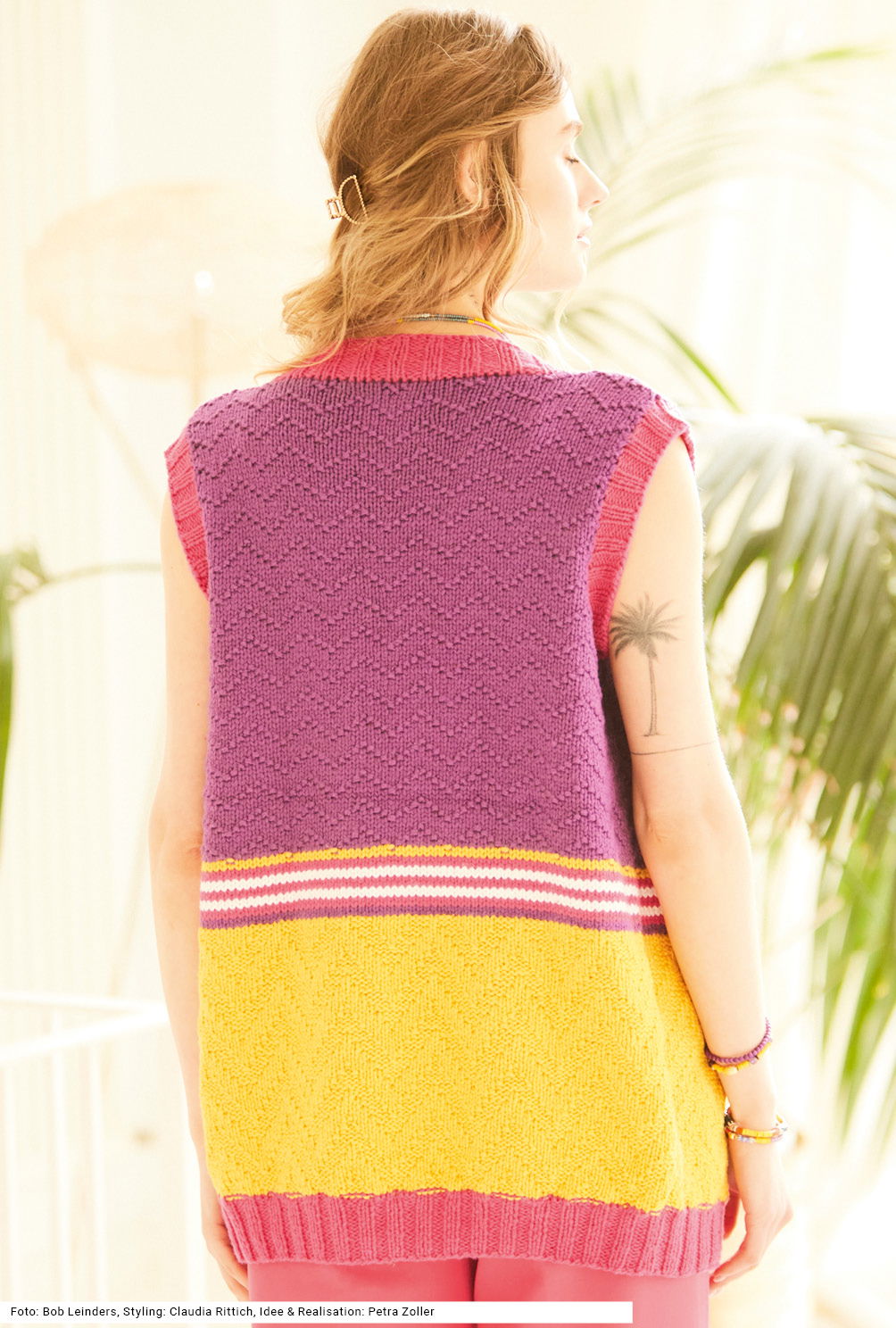 Westen – zumal in so vielen Farben gestrickt – ergänzen jedes Outfit auf vortrefflichste Weise und es findet sich immer ein Kleidungsstück, das dazu passt. Es fällt zunächst die geballte Kraft der vier Garnfarben Lila, Gelb, Pink und Weiß ins Auge, doch das Modell hat noch mehr zu bieten. Der Mix aus breiten und schmalen Zickzack-Rippen und geraden Linien aus allen vier Farben sorgt nämlich für Abwechslung beim Stricken. Umrahmt wird das Ganze mit pinkfarbenen 2/2-Rippen. Die Anleitung für reines Baumwollgarn kann für die Größen 38/40, 44/46 und 50/52 downgeloadet werden.