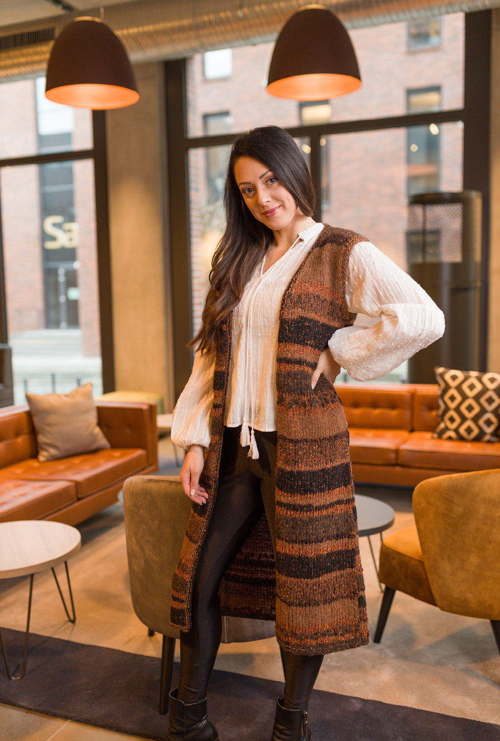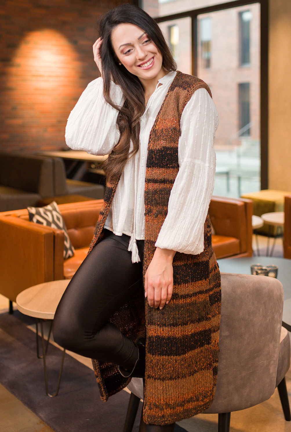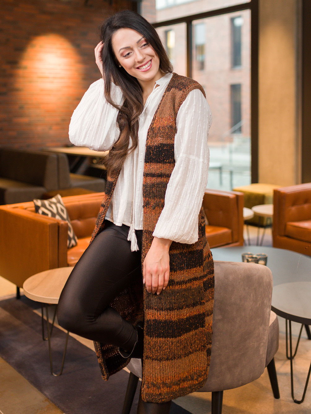 Supertrendy und superbequem kommt diese wadenlange Weste daher. Auch StrickerInnen, die noch nicht viel Erfahrung mitbringen, für die Stricken Meditation bedeutet, können sich an dieses Modell wagen, hat es doch einen unkomplizierten Schnitt und erfordert nur das Beherrschen von rechten und linken Maschen. Außerdem hat das Stricken mit diesem Garn Suchtpotenzial – ganz entspannt lässt sich damit nadeln. Es zeigen sich fünf verschiedene Material-Optiken direkt aus dem Knäuel – was ein kompliziertes Muster überflüssig macht, hinzu kommt der interessante Farbverlauf von dunklen bis hellen Cognactönen. Du kannst diese lange Weste in den Größen 36/38, 40/42, 44/46, 48/50 oder 52/54 nachstricken.