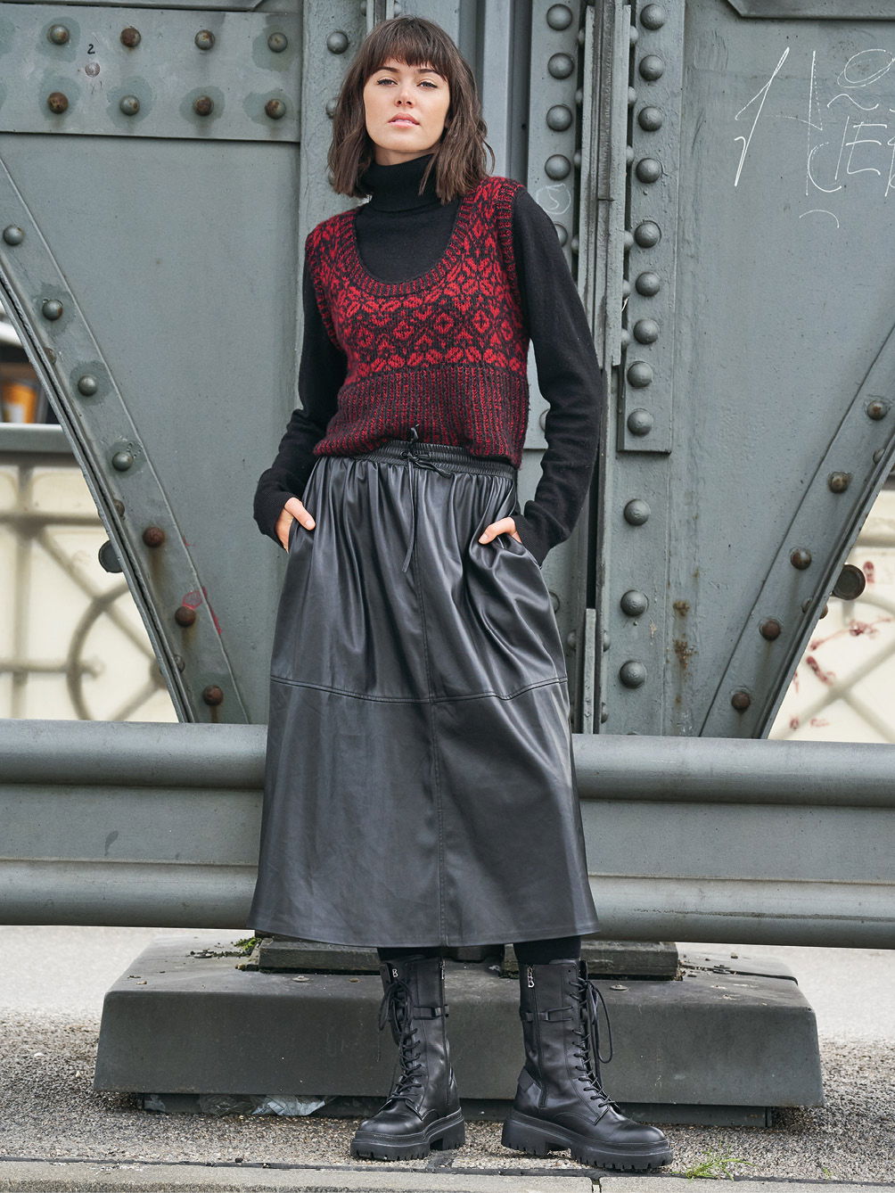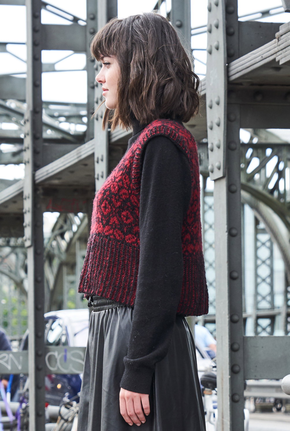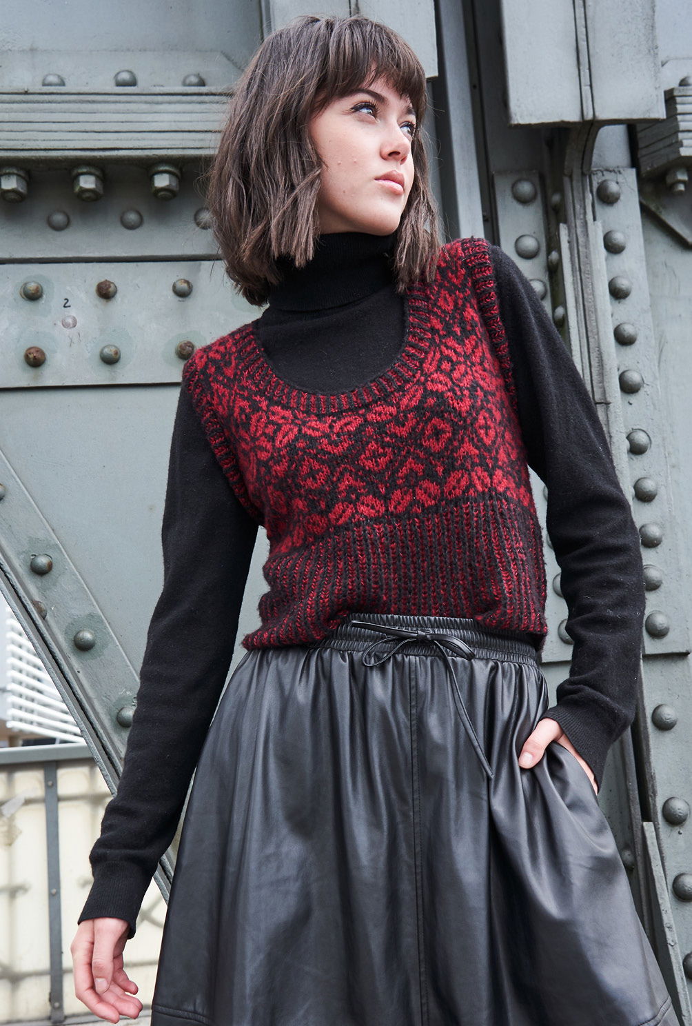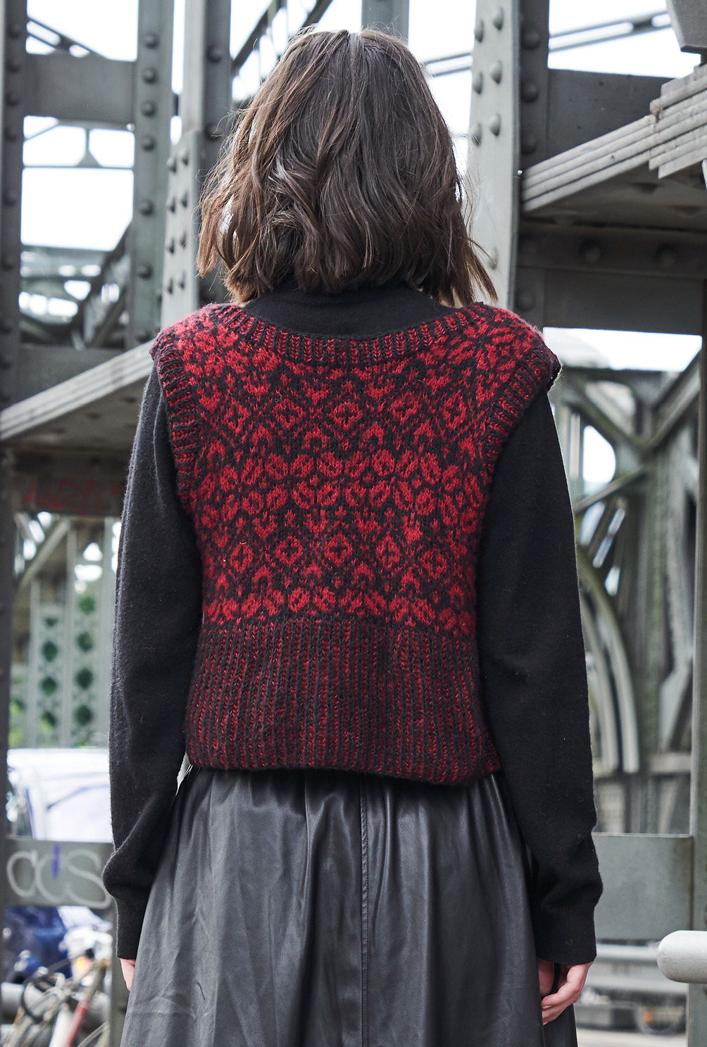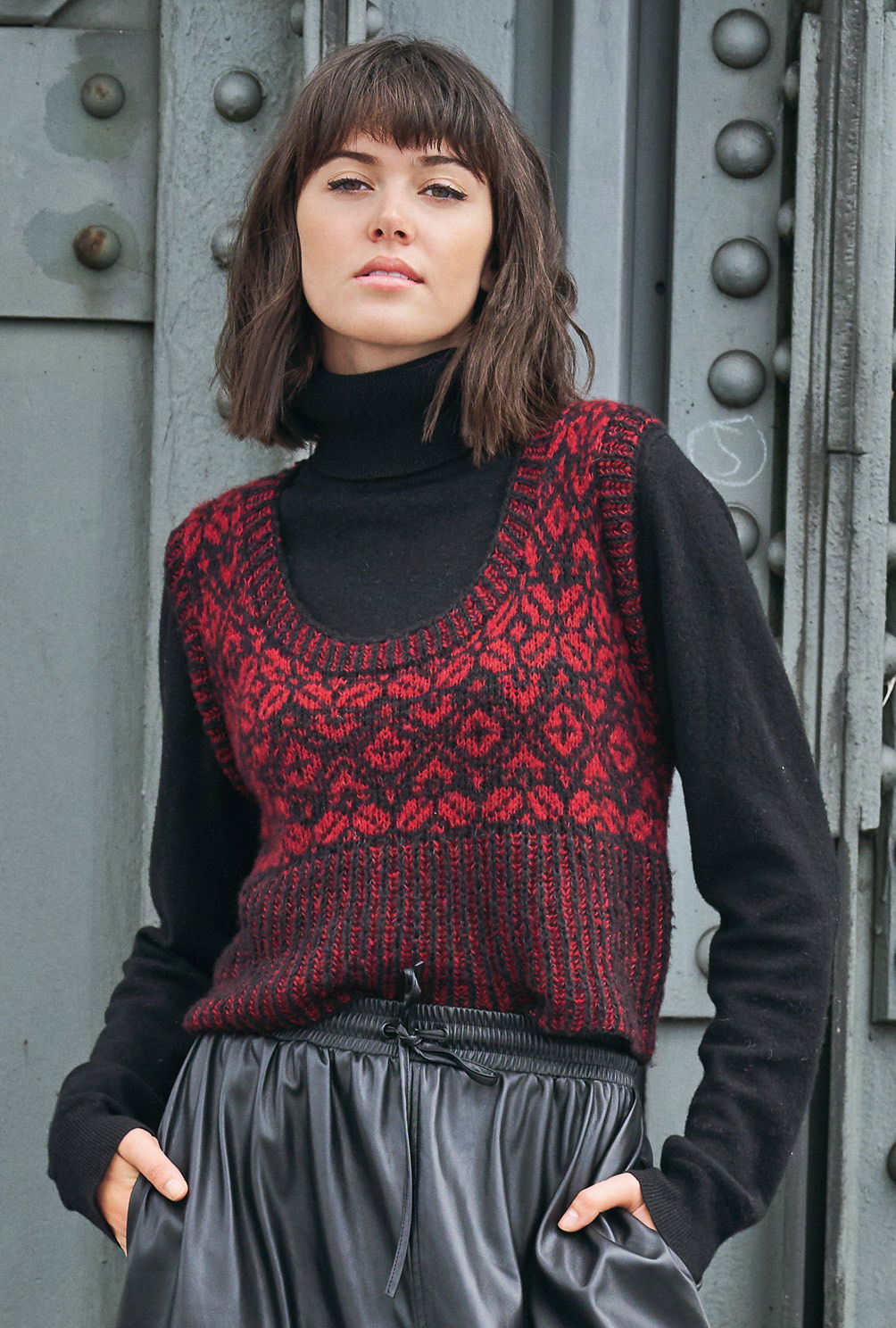 Tradition trifft Trend – traditionelles Norwegermuster auf trendigem Slip-Over! Der schwarz-rote Pullunder ist ganz klar ein Blickfang und aus feinstem Kaschmir-Baumwollmix zudem ein absolutes Wohlfühlteil. Gestrickt wird er ganz klassisch von unten nach oben in Einzelteilen. Das effektvolle hohe Bündchen wird im zweifarbigen Patentmuster gestrickt, danach geht es dann auch direkt mit dem Jacquardmuster weiter. Hierfür sollte man schon ein wenig Übung in dieser Technik haben – denn auch wenn die farbige und übersichtliche Strickmusterzeichnung sehr dabei hilft, stets den Überblick im Muster zu behalten, braucht es doch etwas Geduld. Sind dann Vorder- und Rückenteil fertig gestrickt, werden die Schulternähte geschlossen und aus dem Halsausschnitt die Blende herausgestrickt. Alle Blenden werden im zweifarbigen Rippenpatent gearbeitet. Nach der Halsausschnittblende werden die Seitennähte geschlossen und die Blenden der Armausschnitte ebenso gearbeitet. Am besten wird dem Pullunder dann ein kleines Bad gegönnt – so legen sich die Maschen schön, kleine Ungleichmäßigkeiten passen sich an und das Kaschmirgarn blüht auf