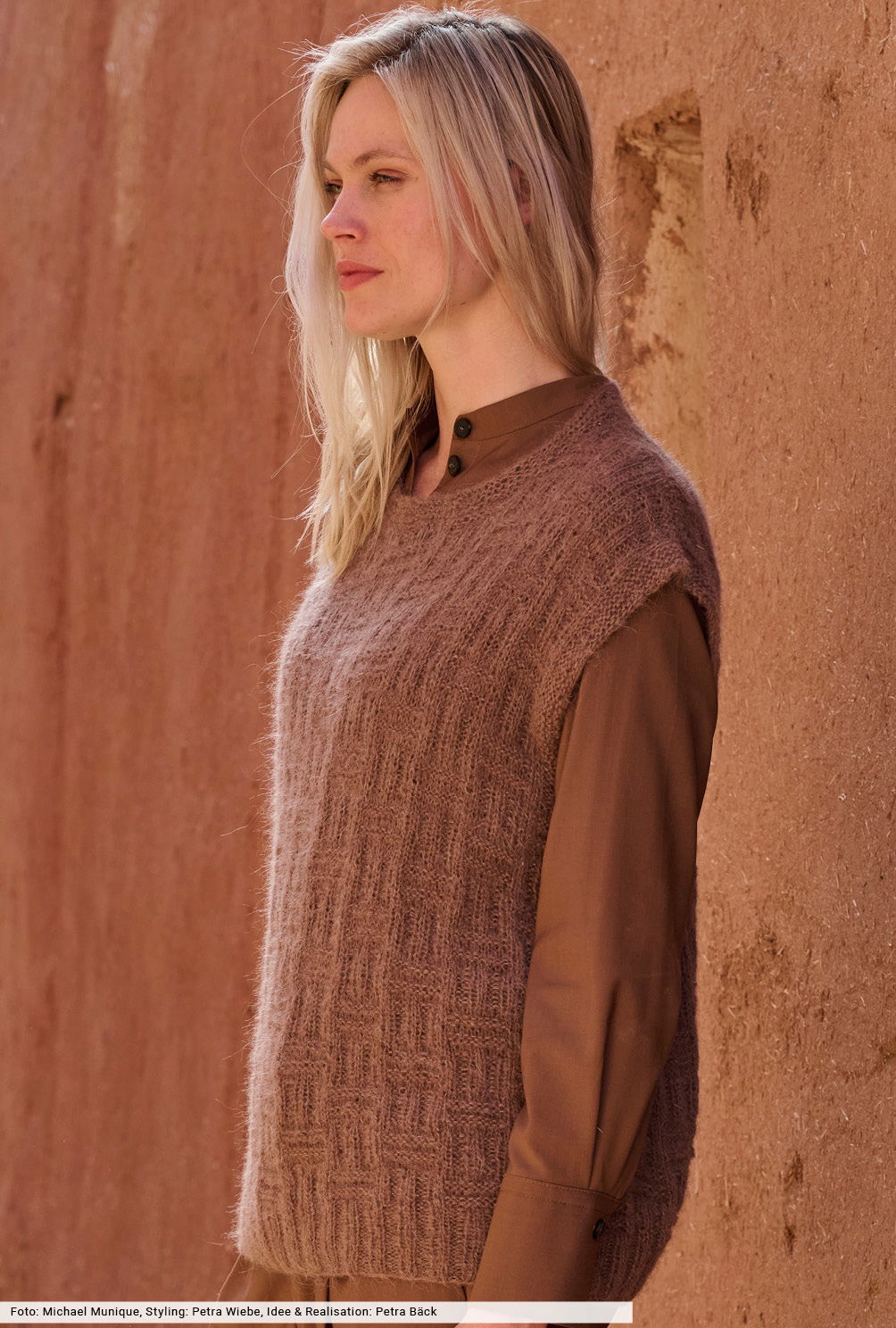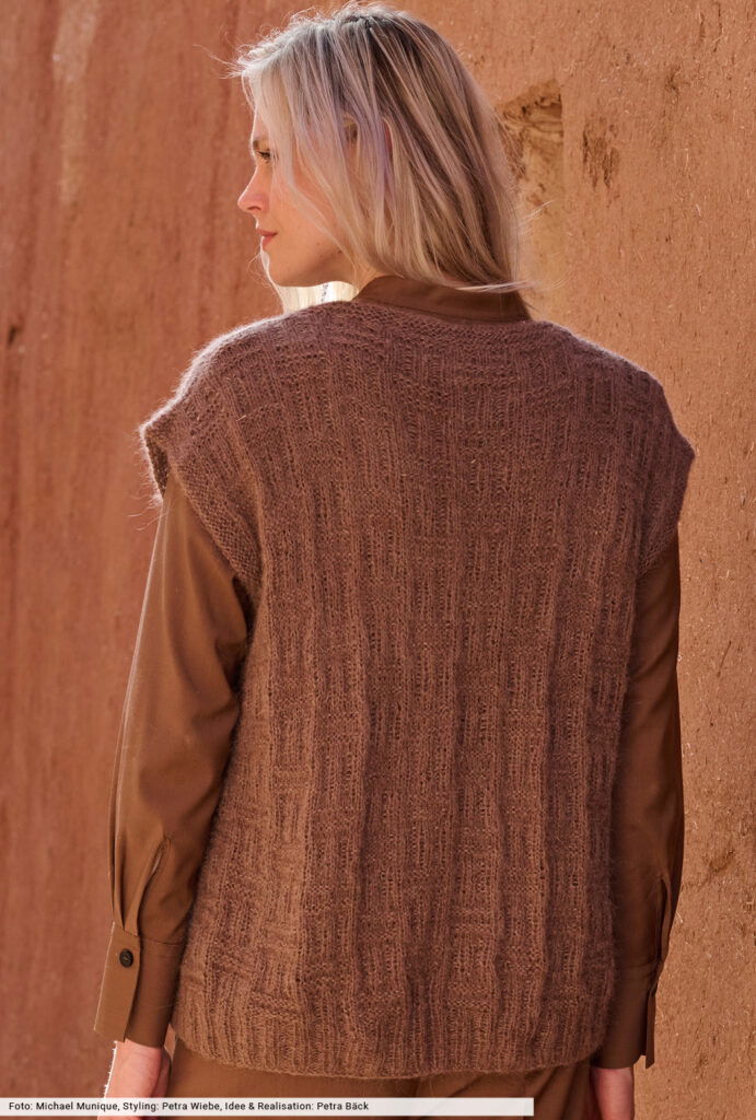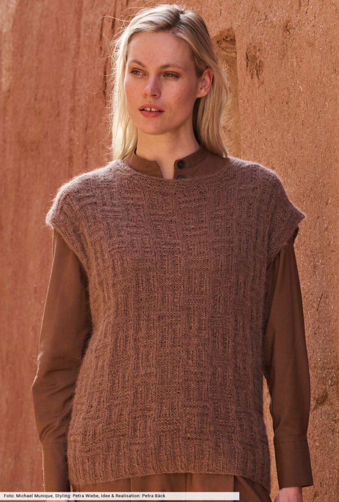 Besonders charmant sind einfache Karomuster aus rechten und linken Maschen. Sie geben dem Pullunder ein grafisches Gesicht und lassen sich auch von Strickneulingen gut umsetzen. Ein toller Begleiter, der jeden Look gekonnt aufwertet und in keiner Herbstgarderobe fehlen sollte. Das nougatbraune Garn aus Alpaka und Seide verspricht außerdem höchsten Tragekomfort und lässt die Strukturen toll zur Geltung kommen.