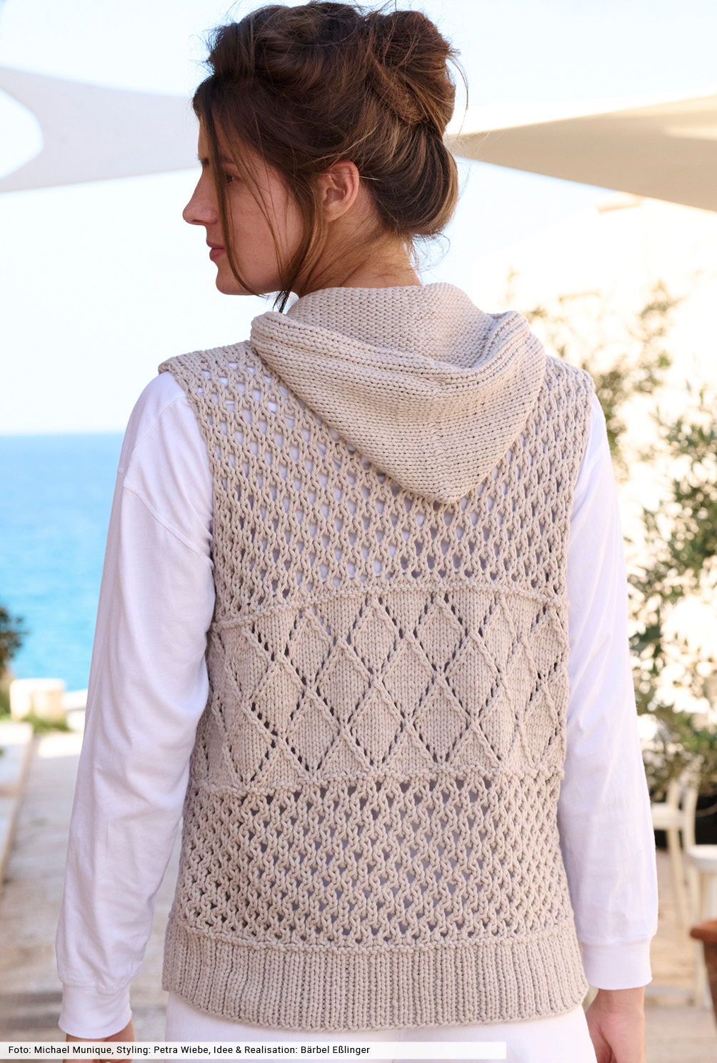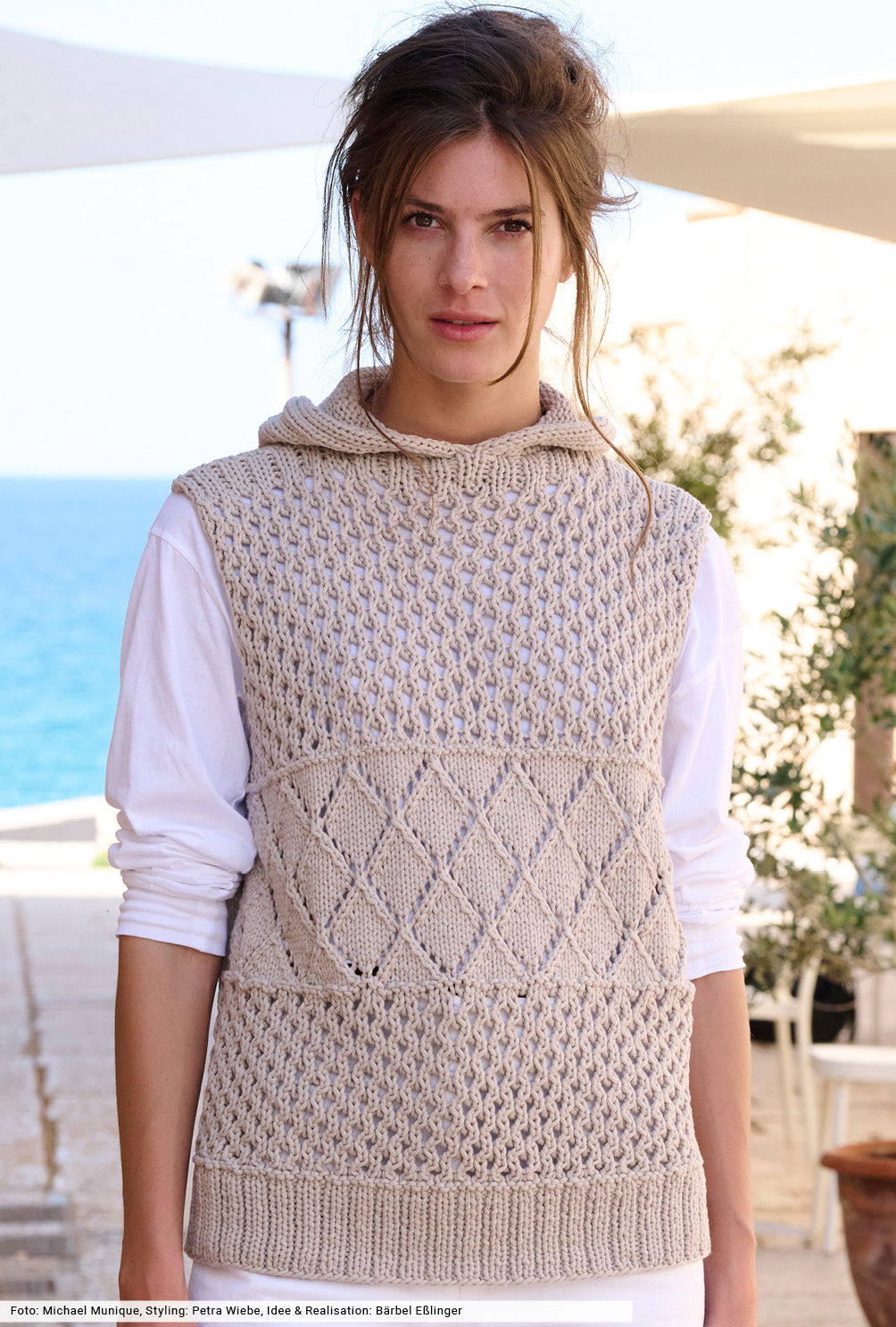 Maschen, die Harmonie und Gelassenheit ausstrahlen, sind in dieser schnelllebigen Welt genau das Richtige. Hier als Kapuzenpullunder aus einem naturfarbenen Bändchengarn, das sich aus Baumwolle plus Polyamid zusammensetzt und sich wunderbar leicht mit etwas dickeren Nadeln verstricken lässt. Außerdem entsteht durch die glatte Garnstruktur ein ebenmäßiges Strickbild, das die fantasievollen Netz- und Ajourstrukturen optimal im modischen Streifendesign zur Geltung bringt.