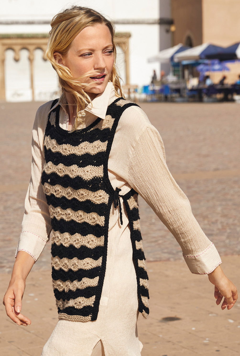 Über Blusen, Longsleeves oder Kleidern – dieser Pullunder macht einfach alles mit. Schwarz und Creme bilden in gleichmäßiger Streifenfolge einen tollen Kontrast. Die Wellenoptik entsteht durch ein Fantasiemuster, bei dem Maschen abgehoben und zusammgenstrickt werden. Das ist etwas kniffelig, deshalb raten wir zu einer kleinen Maschenprobe. Für jede Menge Bewegungsfreiheit sorgen die offenen Seitenkanten, die lediglich durch Bindebänder unter den Ärmeln zusammengehalten werden.