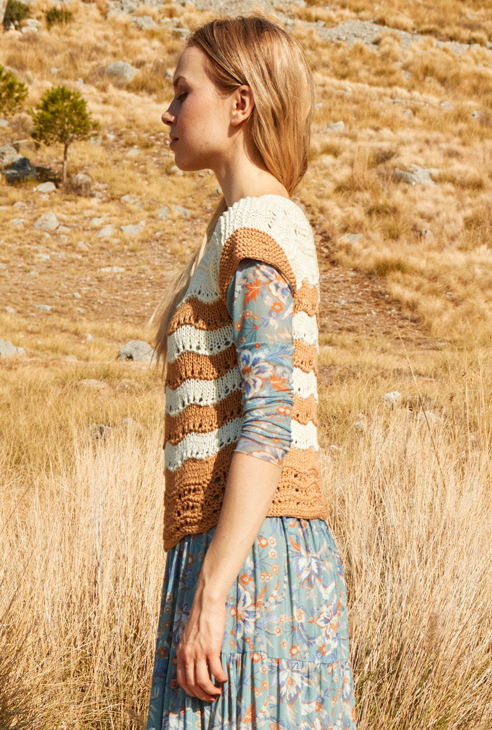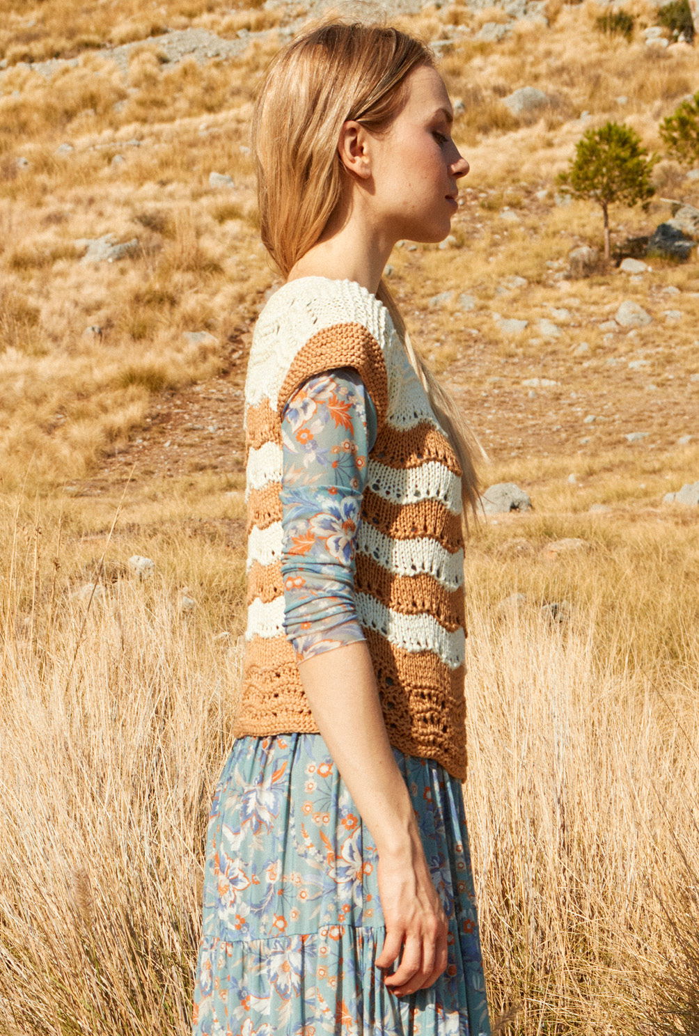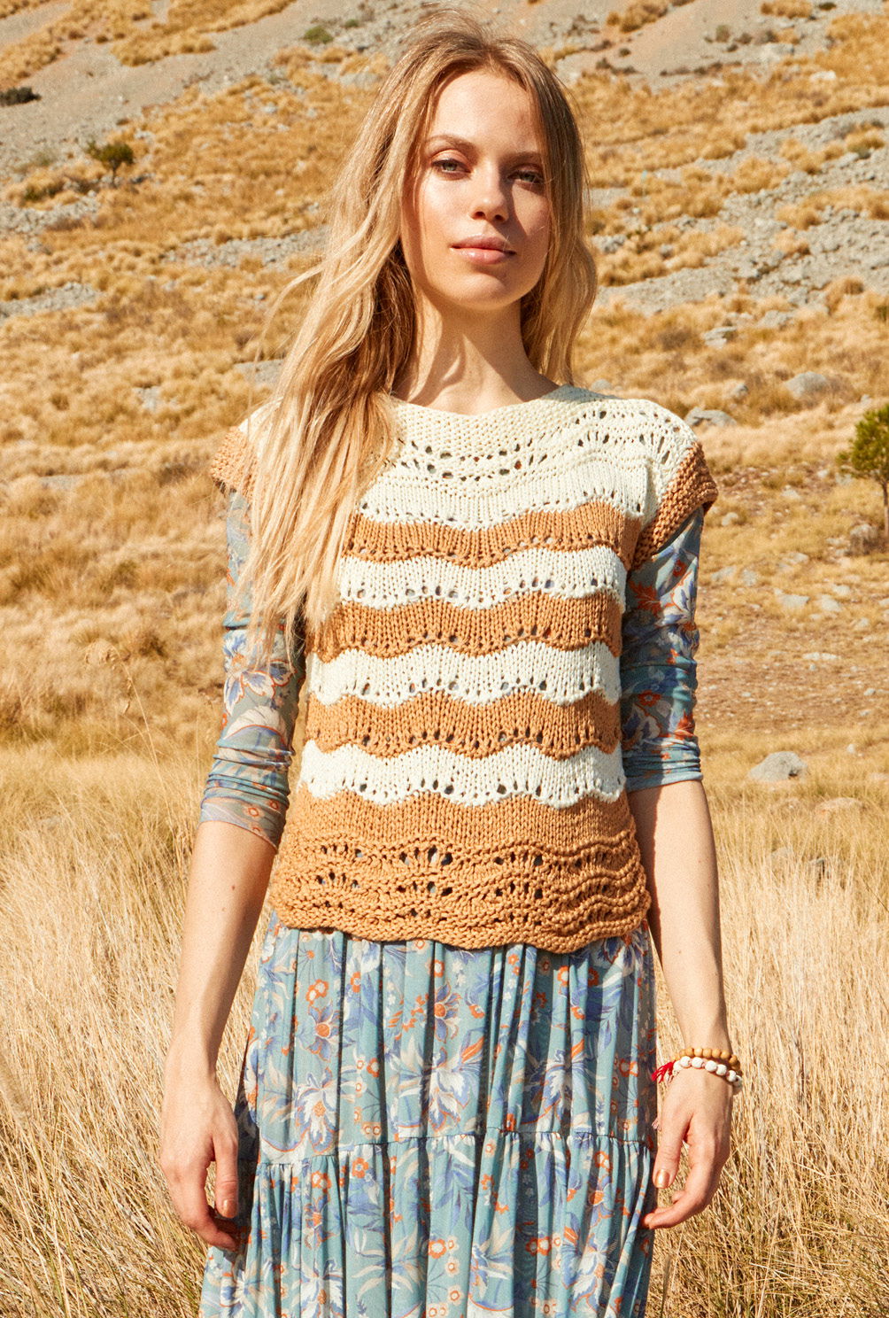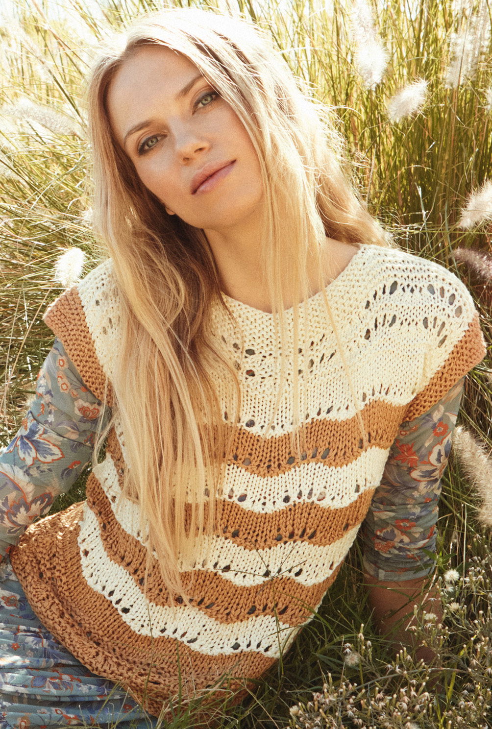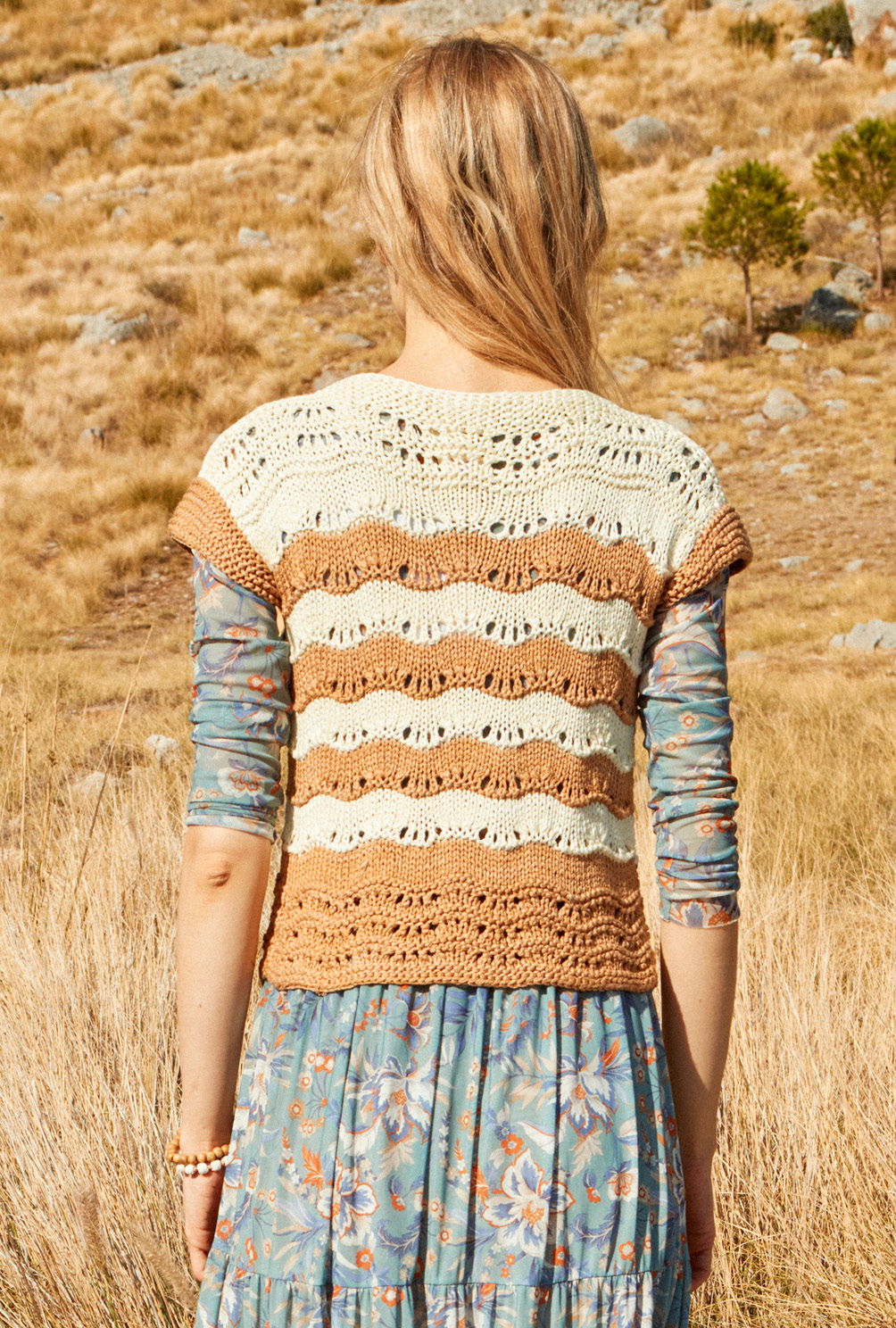 Heute Pullunder, morgen Top – dieses Oberteil aus zweifarbigen Wellenstrukturen begleitet dich bis weit in den Sommer hinein. Auch das Garn spielt mit: ein leicht schimmerndes Bambusbändchen, das sich den Außentemperaturen hervorragend anpasst. Besonders praktisch: Vorder- und Rückenteil werden über die Schulter hinweg in einem Stück gestrickt. Man beginnt mit dem Vorderteil und arbeitet sich im Reihe für Reihe beschriebenen Muster und der Streifenfolge bis zu den Schulterschrägungen hoch. Diese werden mit verkürzten Reihen geformt, bevor es dann das Rückenteil von oben nach unten gestrickt wird. Ist das vollbracht werden für die kleinen, angestrickten Ärmel Maschen beidseits der Schulterlinie aufgenommen und noch einige Reihen kraus rechts gestrickt. Die Form wird auch hierbei mit verkürzten Reihen vollendet. Danach noch die Nähte schließen – fertig ist das kombi-freudige neue Oberteil.