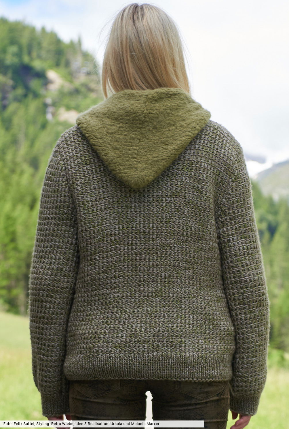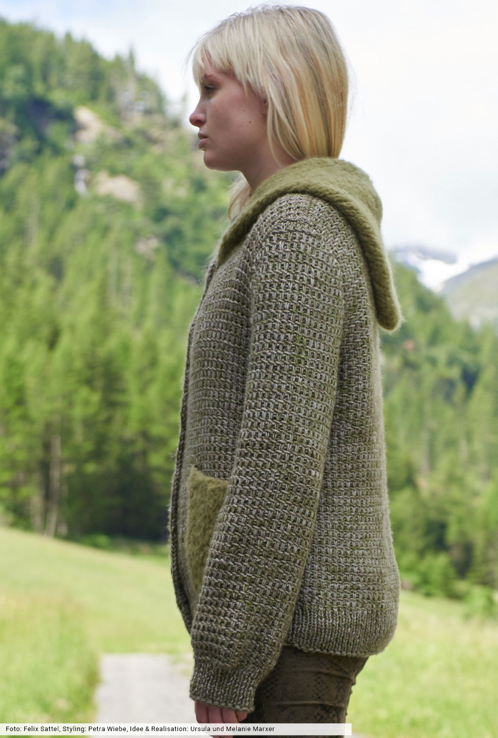Grünmelierte Schurwolle bildet die Grundlage für eine Jacke, die sich mutig auf alle Abenteuerwege begibt. Das Webmuster geht nach etwas Übung schnell und einfach von der Nadel, die aus einem bauschigen Alpakagarn gearbeiteten Taschen werden zum Schluss aufgenäht, die Kapuze an den Halsausschnitt gestrickt. Das stilvolle Finish bilden die leicht schimmernden Metallic-Knöpfe, die du direkt bei der Firma bestellen kannst.