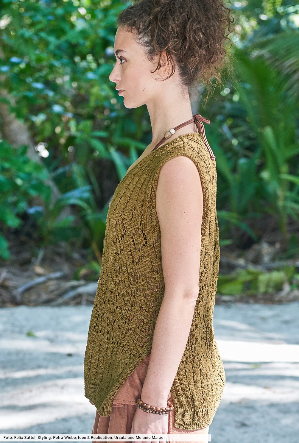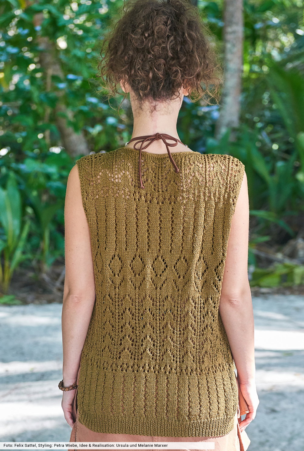 Dark Tones für warme Tage: Das fantasievolle Ajourmuster dieser Weste ist innovativ und kommt in gedecktem Oliv besonders schön zur Geltung. Details wie hohe Seitenschlitze, schmale I-Cord-Blenden und messingfarbene Knöpfe vermitteln die perfekte Balance zwischen Tragbarkeit und kreativer Handarbeitskunst. Aus reiner Baumwolle ein Oberteil, das du auch geschlossen als Top direkt auf der Haut tragen kannst und so mit einem wunderbar wandelbaren Modell deine Sommergarderobe vervollständigen kannst