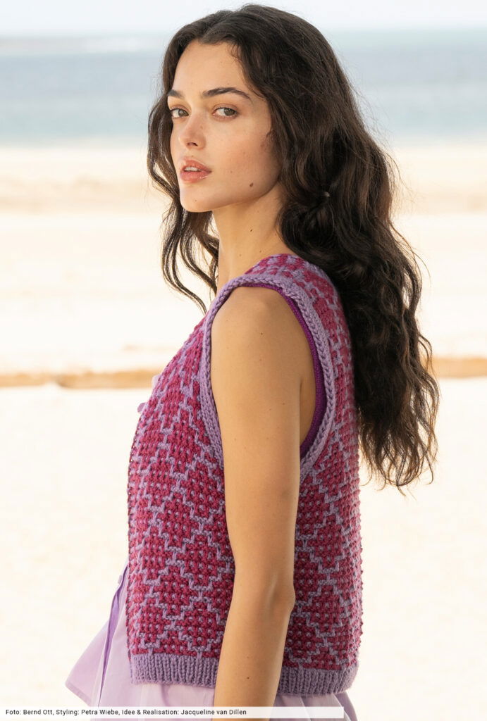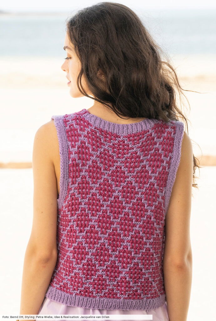 Über Sommerblusen oder weit schwingenden Kleidern ist diese zweifarbige Weste ein wahrer Hingucker. Die Rautenoptik entsteht durch ein Hebemaschenmuster, du strickst also immer nur mit einer Farbe, der Farbwechsel erfolgt stets nach jeweils zwei Reihen. Bis zu den Armausschnitten wird an einem Stück gestrickt, wobei die Kraus-rechts-Blenden und später die Rippenblenden an den Armausschnitten gleich mitgearbeitet werden, sodass du nur die Maschen der rückwärtigen Blende auffassen musst und zum Schluss an die Vorderteilblenden nähst.