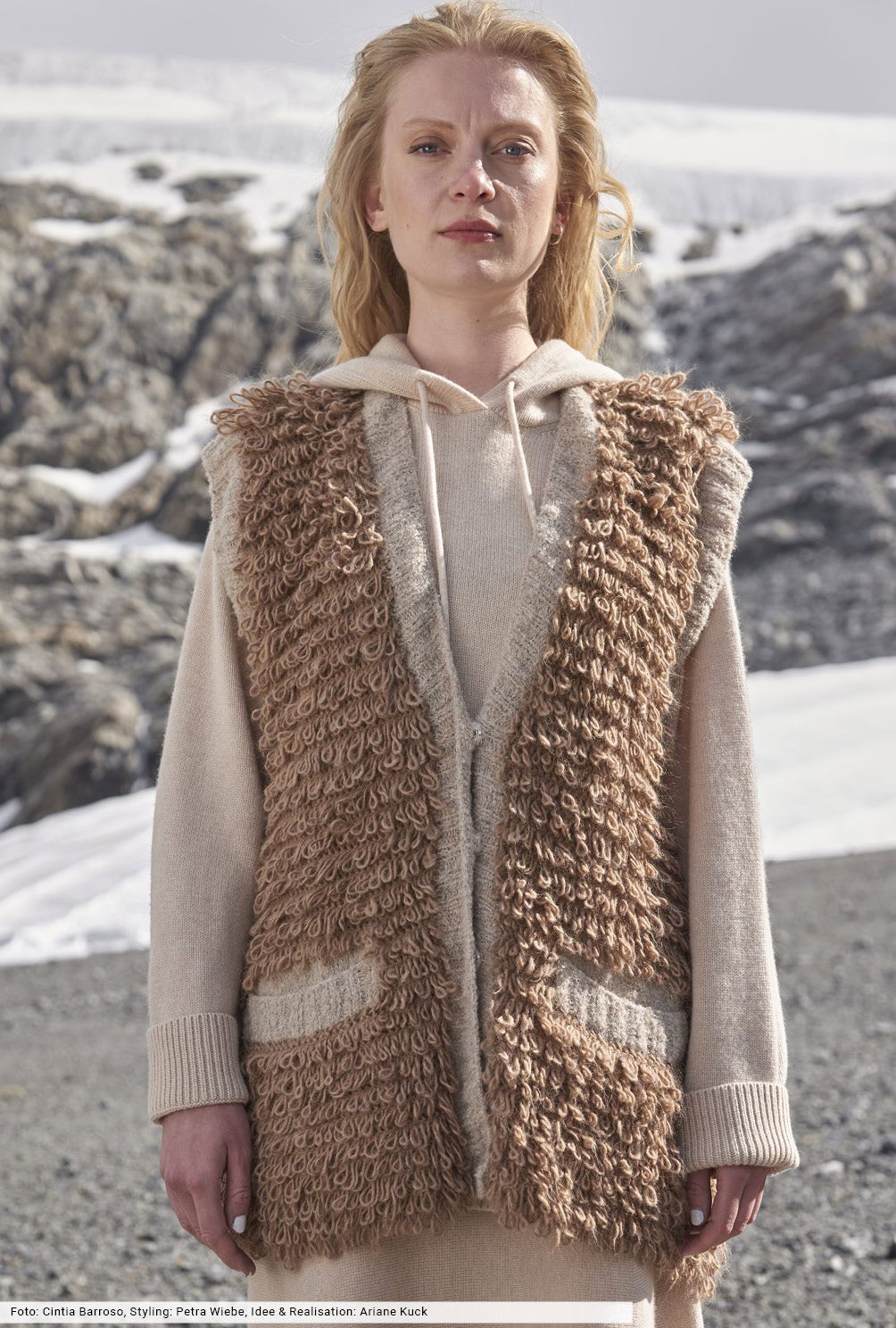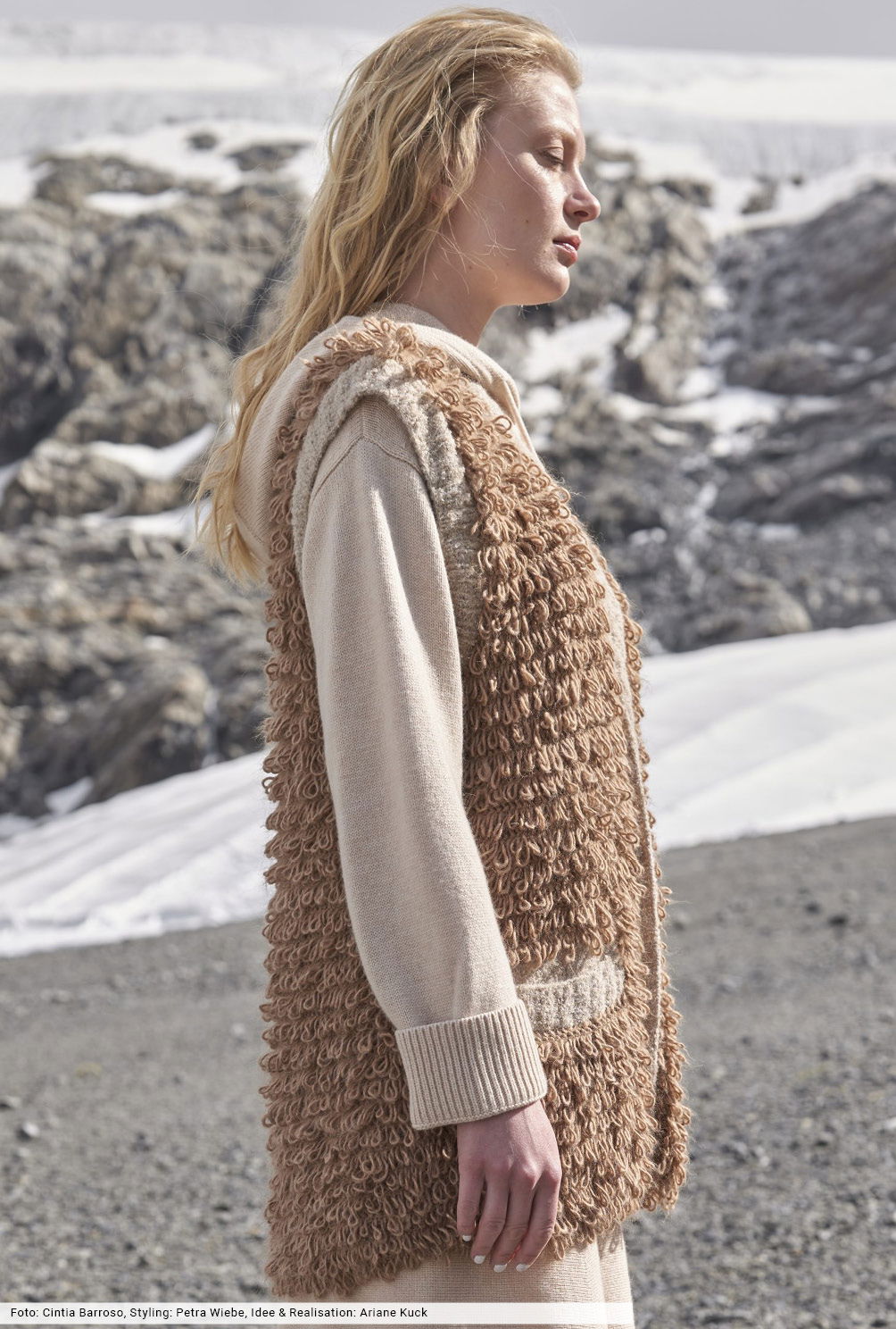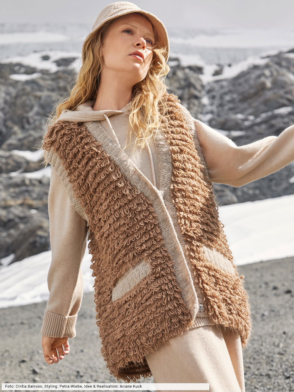 Wer kein Fake-Fur-Garn zur Hand hat, macht sich den Fell-Effekt einfach selber. Mit einem gestrickten Schlingenmuster, bei dem Sie den Alpaka-Faden zweimal um den Finger legen müssen, danach wird die Masche rechts abgestrickt. Schmale Blenden ausBouclé-Wolle, eingearbeitete Taschen und «unsichtbare» Druckknöpfe runden den Après-Ski-Look perfekt ab und lassen eine Longweste entstehen, die du zu allen winterlichen Outfits kombinieren kannst.