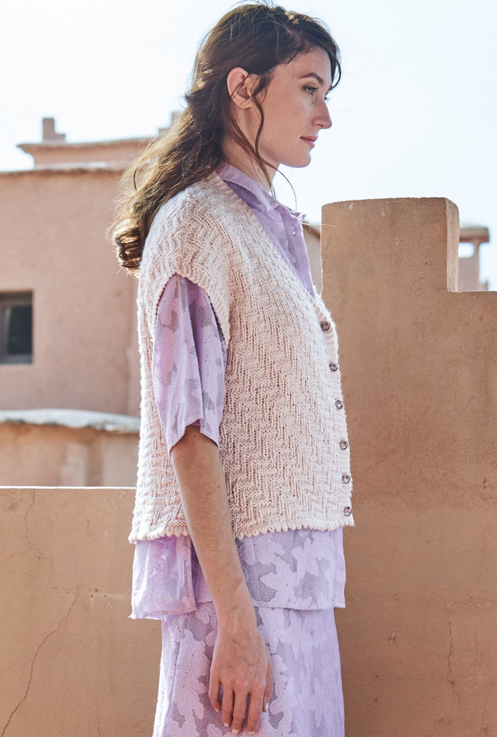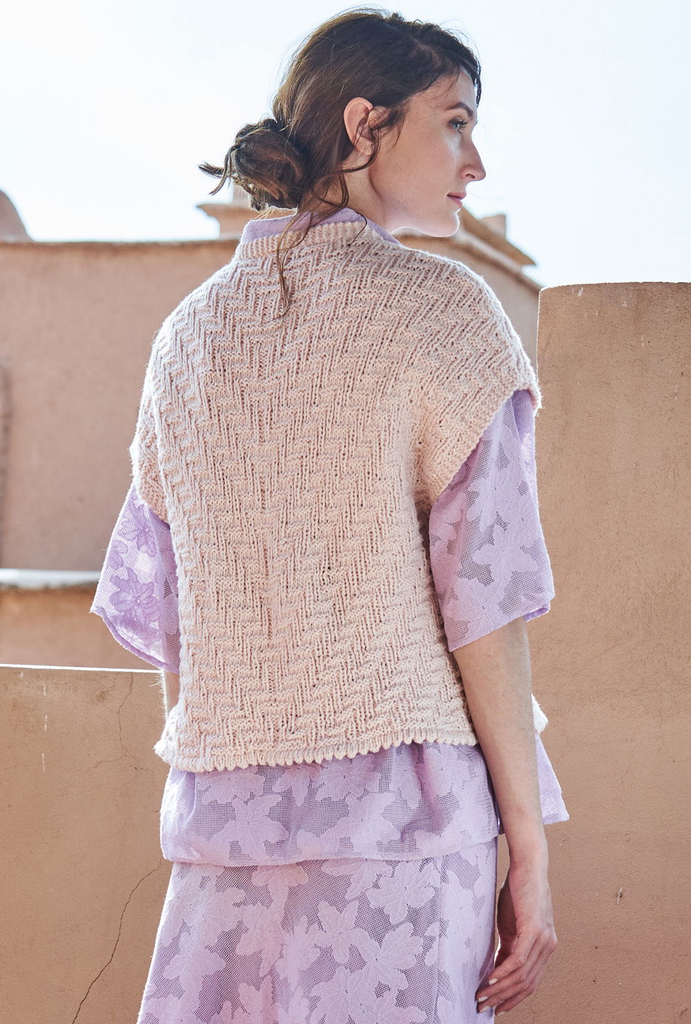Formvollendet schön: Mal nach rechts, mal nach links richten sich die Diagonalstreifen dieser Weste aus und erinnern ein wenig an gewebte Fischgrätmuster. Gerade geschnitten, mit V-Ausschnitt und überschnittenen Schultern im Frühling die perfekte Ergänzung zu Shirts und Kleidern. An heißen Sommertagen als Shirt zu Shorts oder weiten, romantisch langen Röcken macht sie auch solo eine richtig gute Figur! Gestrickt wird der Allrounder in Einzelteilen, begonnen jeweils mit einer aparten Mäusezähnchenkante. Danach geht es all over im Strukturmuster weiter. Das ist nicht kompliziert und die übersichtliche Strickschrift hilft dabei, stets den Überblick im Muster zu behalten. Besonders praktisch: Bei den Vorderteilen wird die Blende gleich mitgestrickt. So müssen nach Fertigstellung der drei Teile nur noch die stillgelegten Maschen der Blende im maschenstich verbunden und die Blende in den rückwärtigen Halsausschnitt eingenäht werden. Dann noch die Seitennähte bis zum Beginn der Armausschnitte schließen. Da ist es doch gut zu wissen, dass das voluminöse, GOTS-zertifizierte Baumwollschlauchgarn in 12 schönen Farben verfügbar ist – denn solche wandelbaren Teile kann man nie genug haben!