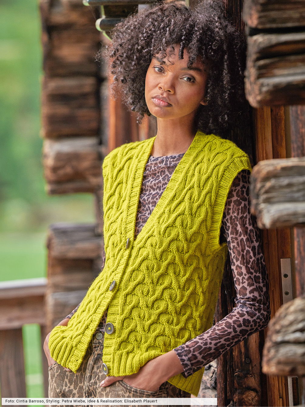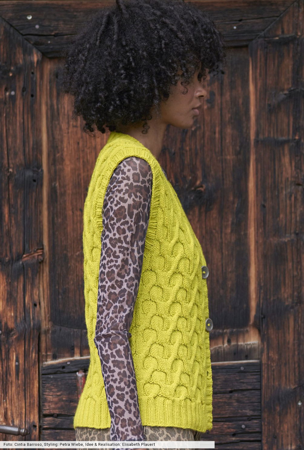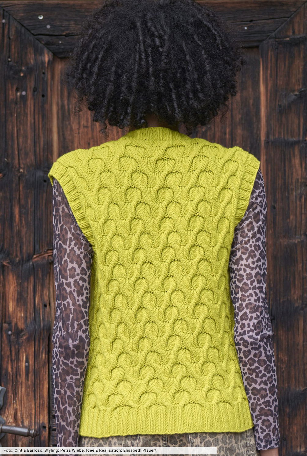In sich versetzte Zöpfe lassen bei dieser Weste eine Art Wabenmuster entstehen, das sich fast dreidimensional all over in Szene setzt. Dafür sorgt auch das Garn, bei dem zur Schurwolle ein hoher Kaschmir-Anteil hinzugefügt wurde, der für Luxus und komfortables Tragegefühl zuständig ist. Den Rahmen bilden klassische Rippenbündchen und dem Farbthema angepasste Knöpfe, die du direkt über den Hersteller beziehen kannst.