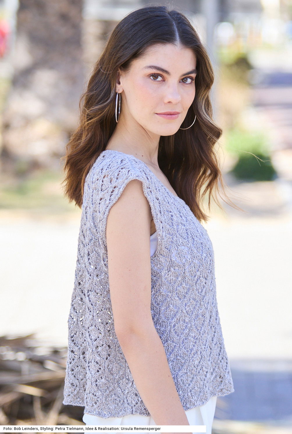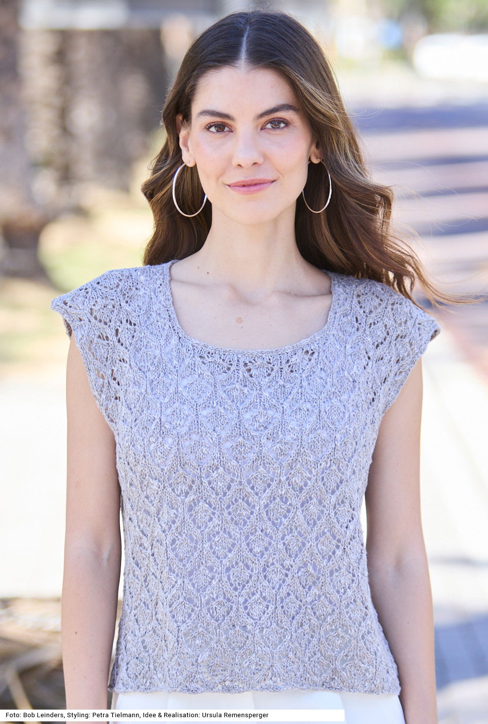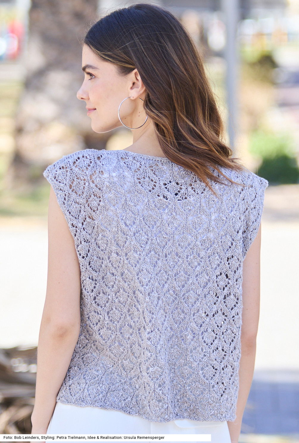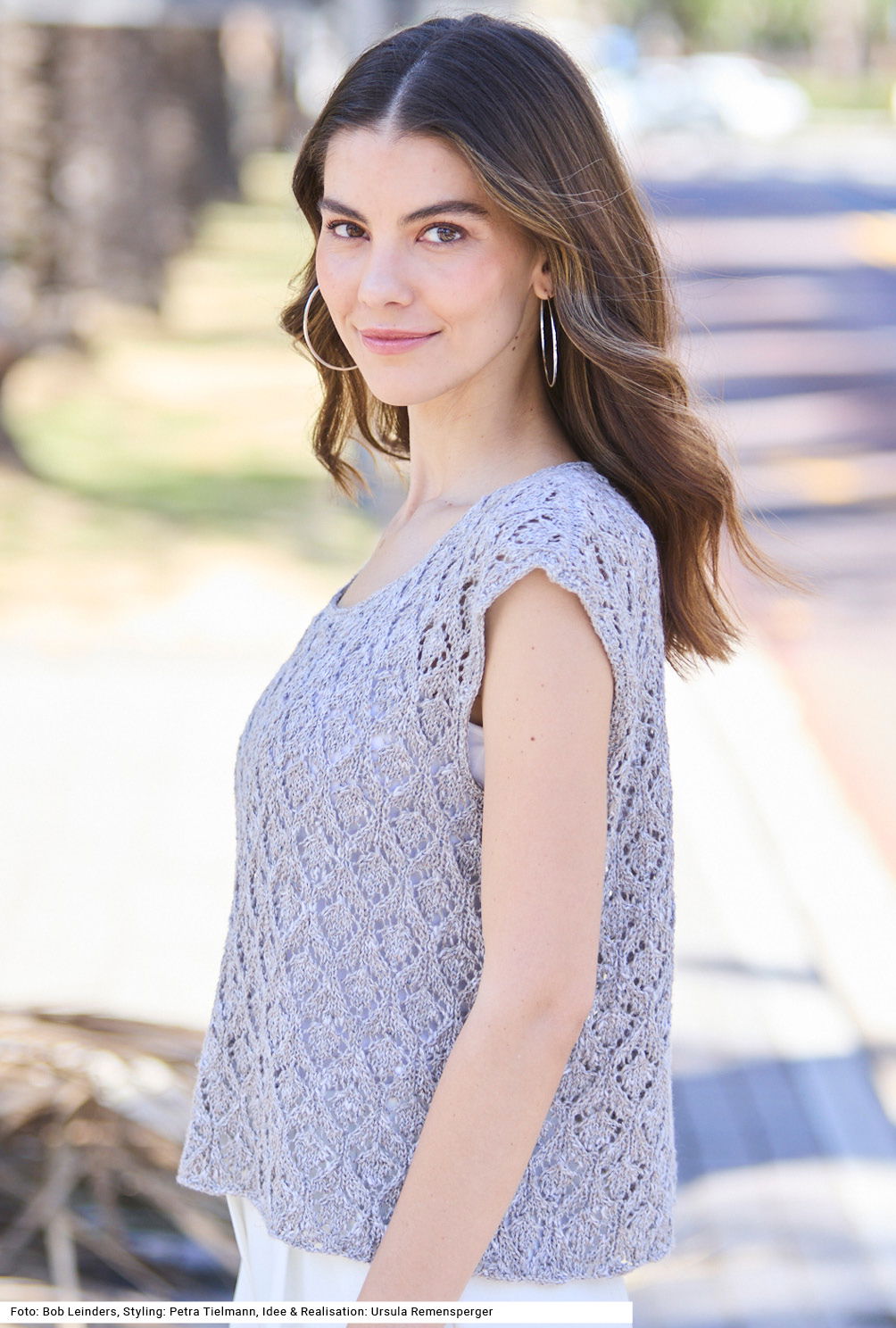 Das lässige, gerade gestrickte Shirt mit eckigem Halsausschnitt und eckigen Armausschnitten ist aus einem melierten Tweedgarn gearbeitet, das aus Leinen, Viskose, Baumwolle und etwas Polyester besteht. Das Garn verleiht dem Ganzen einen kernigen Charakter, wobei das Ajourmuster eher romantisch wirkt. Beim Ajourmuster ist Aufmerksamkeit gefragt. Der Halsausschnitt als auch die Armausschnitte werden zum Schluss mit je einer Runde fester Maschen und Kettmaschen umhäkelt. Eine Anleitung steht in den Größen 36/38, 40/42 und 44/46 zur Verfügung.