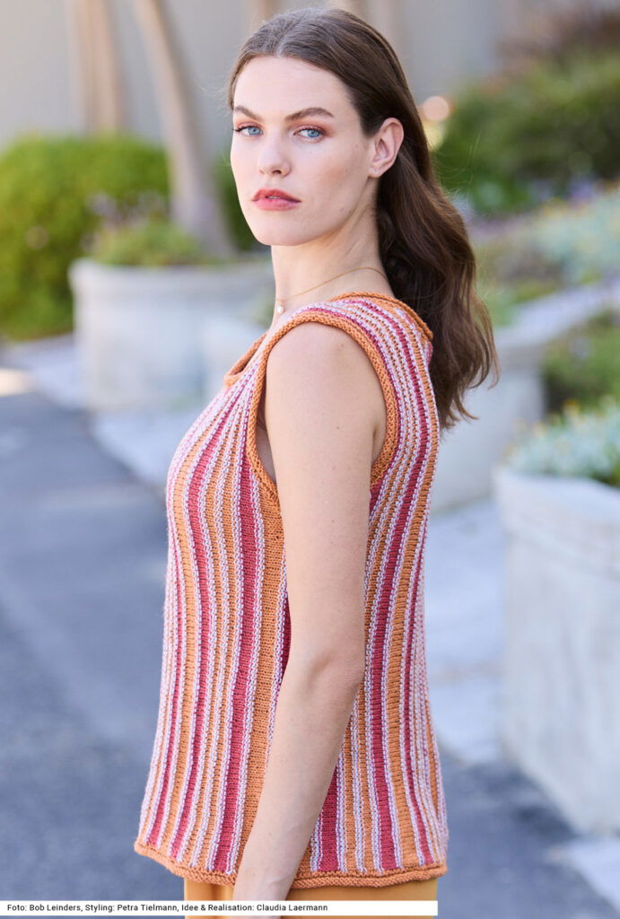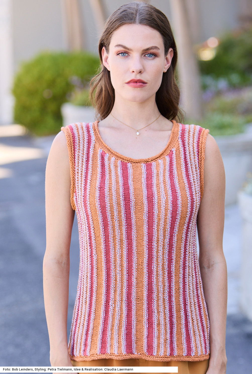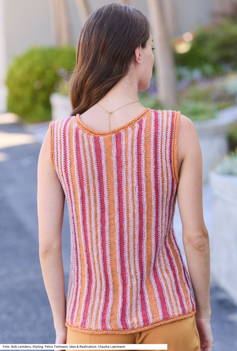 Schlicht aus glatt rechten Streifen in zwei Farben und kraus rechten Streifen in immer derselben Farbe gestrickt, ist dieser ärmellose Pulli gerade deshalb so wandlungsfähig.Das leichte, langlaufende Baumwolle-Viskose-Mischgarn (das Top wiegt nur 220 bzw. 300 g) mit zartem Mélange-Effekt ist sehr angenehm auf der Haut. Gearbeitet wird quer mit einem provisorischen Anschlag, sodass nach dem Auflösen des Anschlags und dem Weiterstricken der anderen Hälfte keine Naht entsteht. Halsrundung und Armausschnitte bekommen noch einen Rollrand in glatt rechts. Eine Anleitung gibts für die Größen 36/38, 40/42 und 44/46.