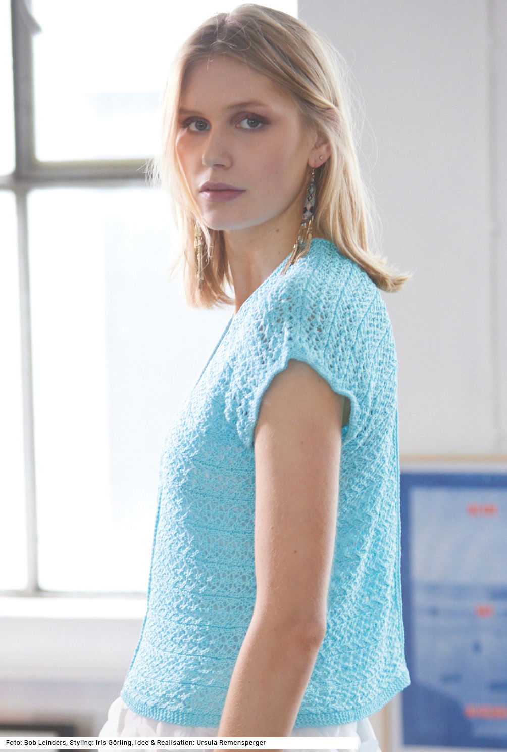 Genau das richtige Modell für AnfängerInnen mit ein wenig Erfahrung. Das einfache Ajourmuster ist schnell gelernt und kraus rechts für die Armausschnitte und den Saum ist sowieso ganz leicht. Noch dazu wird das Top in nur zwei Teilen (Vorderteil + halber Rücken) quer gestrickt, sodass man am Ende nur die Schulternaht und die Rückennaht in der Mitte schließen muss. Dank des tiefen V-Ausschnitts zaubert dieser kleine Pulli ein hübsches Dekolleté. Als Garn empfehlen wir ein Baumwolle-Viskose-Gemisch, vorzugsweise in Mint. Eine Anleitung gibt es für die Größen 38/40, 42/44 und 46/48 zum Herunterladen.