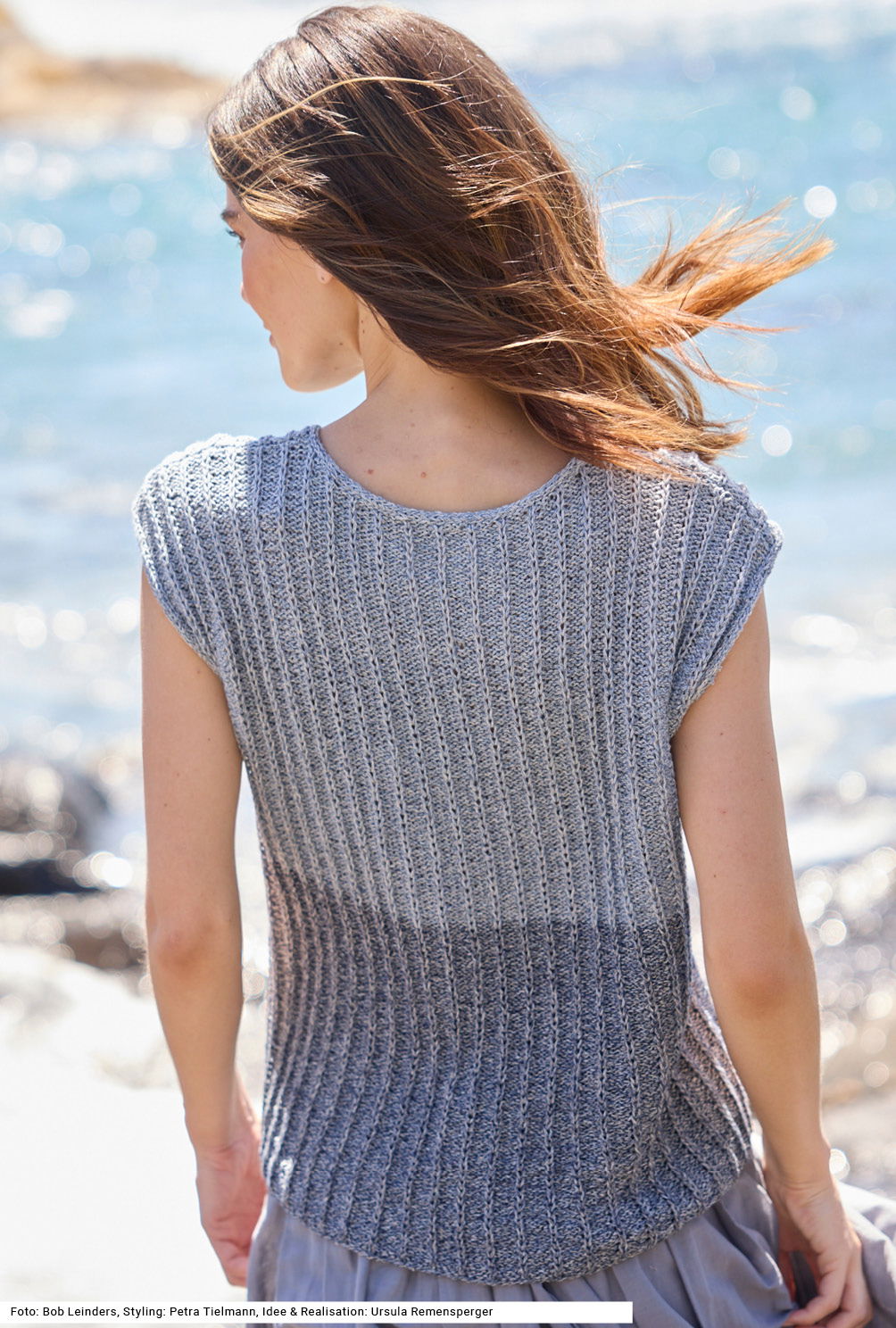 Ein einfaches Muster, ein gerader Schnitt und wenige, aber raffinierte Details: Herauskommt ein kerniges Top mit Cut-Outs im Vorderteil. Das gerippte Muster entsteht durch linke Maschen mit rechten Maschen, die tiefgestochen werden. Der Vorderteilschlitz wird am Ende mit einem I-Cord, der in der Anleitung genau erklärt wird, sauber umrandet, und auch die Armausschnitte bekommen einen solchen. Dazu ein robustes Garn aus Baumwolle, Viskose und Leinen,das es in verschiedenen Farben in Jeans-Optik gibt. Eine Anleitung steht in den Größen 36/38, 40/42 und 44/46 zur Verfügung.