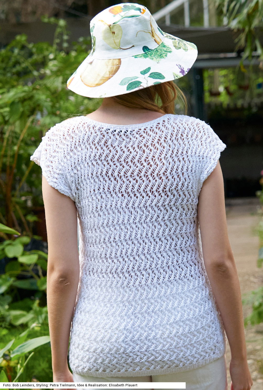 Das Ajourmuster des lässig-leichten Tops wird in Hin- und Rückreihen gebildet, was am Anfang konzentriertes Arbeiten erfordert, doch nach und nach hat man das Muster im Kopf. Vorder- und Rückenteil werden identisch gearbeitet; besonderes Detail dabei: die kurzen, angeschnittenen Ärmel. Bund und Blende am kurzen runden Halsausschnitt werden als 1/1-Rippen gearbeitet, die Armausschnitte brauchen keine Blende. Das sommerliche weiße Garn setzt sich aus Baumwolle, Viskose und Leinen zusammen. Eine Anleitung für dieses Modell steht für die Größen 36/38, 40/42 und 44/46 zum Download bereit.