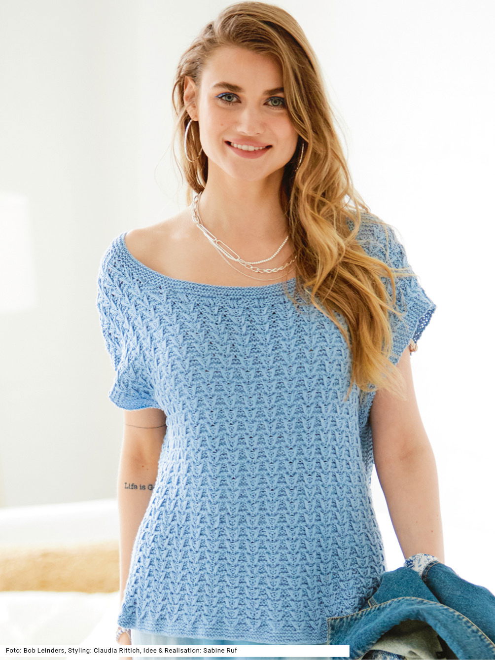 Das lässig geschnittene Oversize-Top mit Schlitzen ist an warmen Tagen genau das Richtige, sorgt es doch durch den hohen Baumwollanteil im Garn für ein angenehmes Klima. Leicht angeschnittene Ärmel und ein weiter Halsausschnitt tun ihr Übriges. Wer mag, kann das Modell in der Übergangszeit mit einem Langarm-Shirt darunter auch als legeren Pullunder stylen. Das Hebemaschenzopfmuster wird eingerahmt von kraus rechts gestrickten Rändern; auch der Halsausschnitt ist kraus rechts gearbeitet. Eine Anleitung dazu steht für die Größen 36/38, 40/42 und 44/46 zur Verfügung.