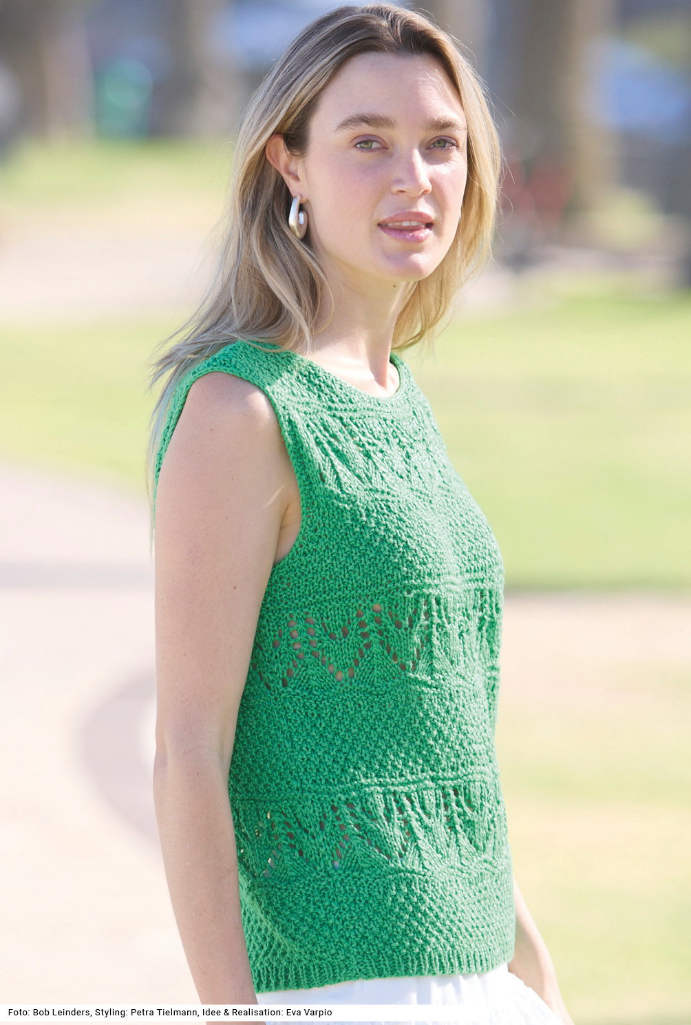 Großes Perlmuster und Ajourmuster in Streifen vereint und jeweils unterbrochen von kraus linken Partien – so entsteht ein attraktives Modell für alle Tage, das im Sommer als Top, im Winter als Pullunder getragen werden kann. Gestrickt mit einem Garn aus Viskose, Baumwolle und Leinen – ideal für warme Tage oder um über Blusen getragen zu werden. Der schmale Bund und die ebenso schmalen Blenden an den Armausschnitten und dem Halsausschnitt werden im Rippenmuster gestrickt. Eine Anleitung gibts für die Größen 38 und 42/44 sowie 48/50.