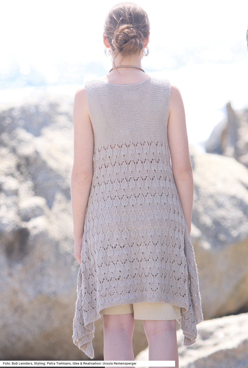 Chic und extravagant kommt dieses lange Top daher. Es besticht durch seinen zipfelig fließenden Saum, der bei jeder Bewegung lässig mitschwingt. Besonders ist hier auch das Garn, es besteht aus Viskose und Ananasfaser und ist sehr angenehm zu tragen, gerade an heißen Tagen. Der untere Teil bis zur Brust wird als blattartiges Ajourmuster gestrickt, der kleinere obere Teil mit den Trägern ist kraus rechts gearbeitet. Eine Anleitung steht für die Größe 38/40 und 42/44 sowie 46/48 zum Download bereit.