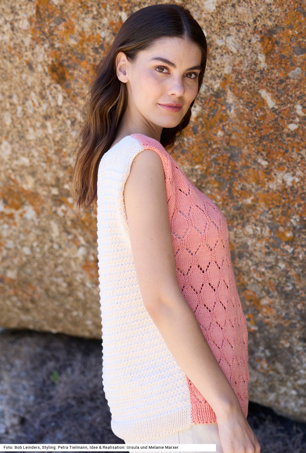 Dieses Top beweist, dass ein raffiniertes Design auch unkompliziert sein kann. Die beiden Teile sind jeweils mit einem Allover-Muster geschmückt, mal Ajour, mal Querrippen aus rechten und linken Maschen. Zudem ist das Modell in zwei Farben gehalten, was mehr Kombinationsmöglichkeiten eröffnet – je nach Lust und Laune kommt mal die eine, mal die andere Seite nach vorne bzw. hinten. Das geht deswegen, weil Vorder- und Rückenteil exakt denselben Schnitt mit einem U-Boot-Ausschnitt haben. An den Armausschnitten wird ein I-Cord-Rand angestrickt. Die Anleitung ist für die Größen 36/38, 40/42 und 44/46.
