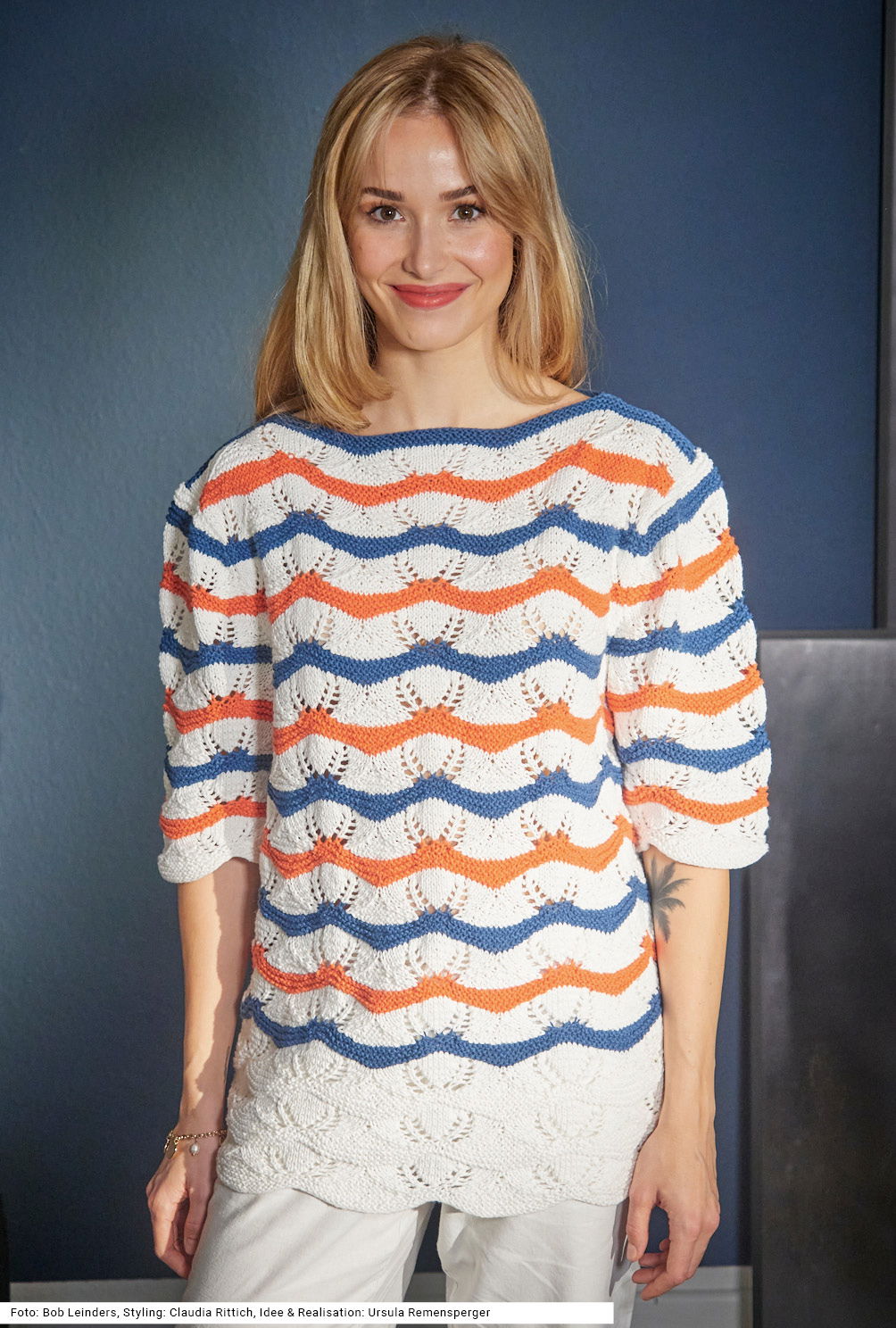 Sabrina Strickjournal Tunika mit weiß-blau-rotem Wellenmuster
